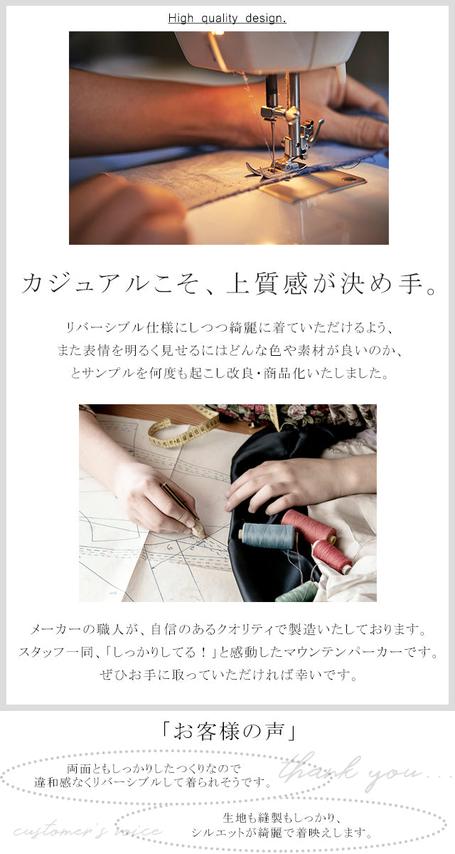 程よいハリ感があるものの、ごわつかず柔らかなさらりとした生地が使用されています。高品質な素材はシワになりにくく、耐久性も考慮されています。両面どちらで着てもシルエットと機能性が損なわれません。