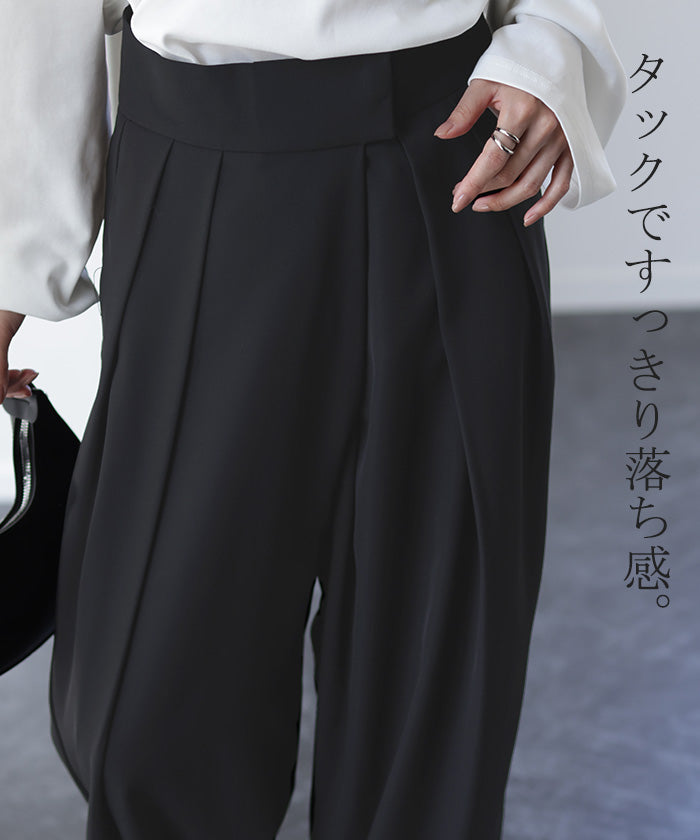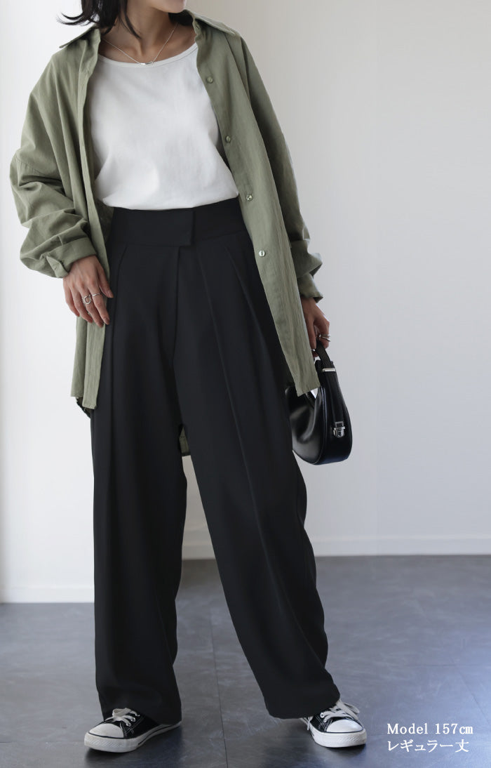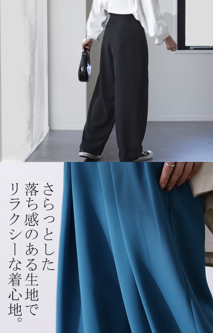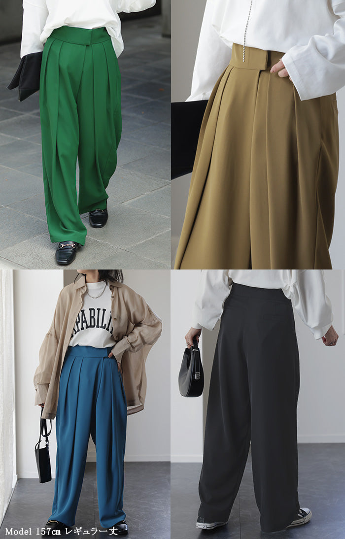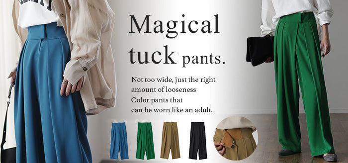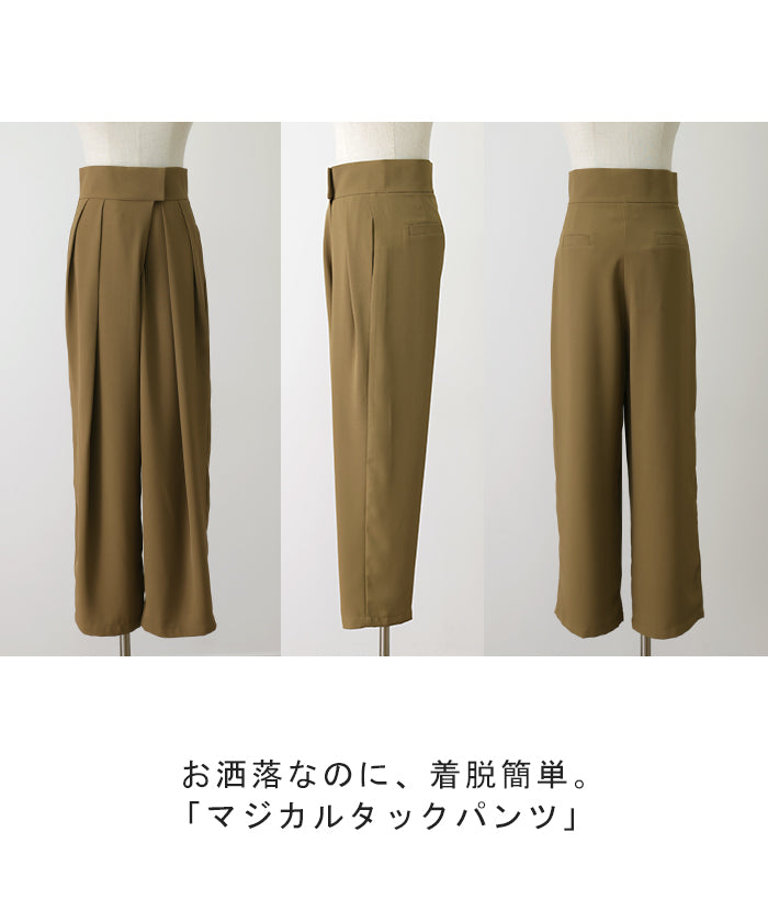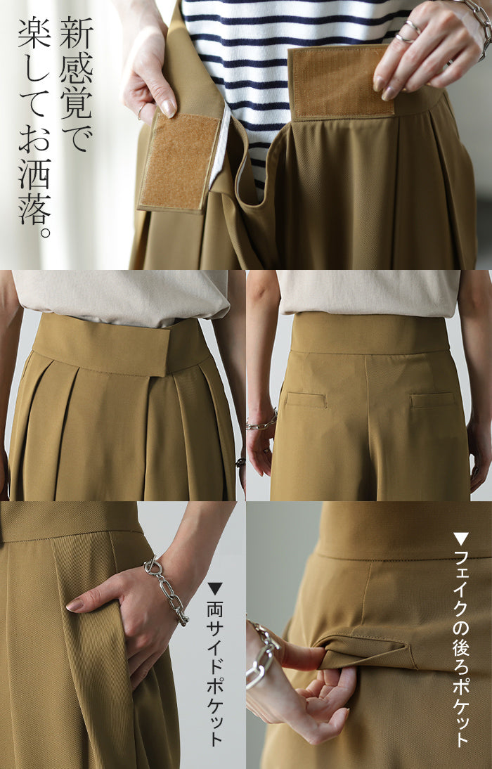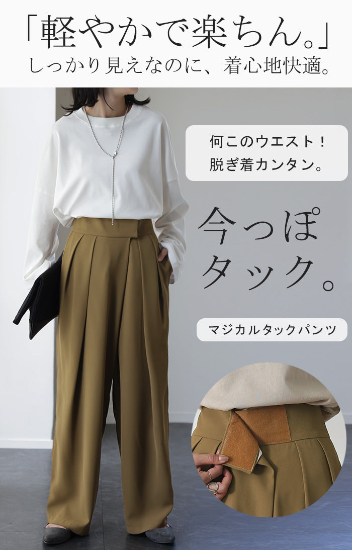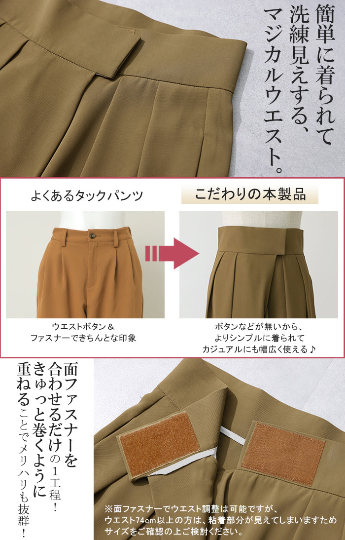 ウエスト部分に面ファスナーを採用したゆるシルエットのスラックスです。大きめのタックが生み出すメリハリのあるシルエットがお気に入り間違いなし。綺麗なシルエットでスタイルアップ&体型カバーが嬉しいスラックスです。※モデル着用商品は在庫切れ・販売終了・リンク切れの場合がございます。
