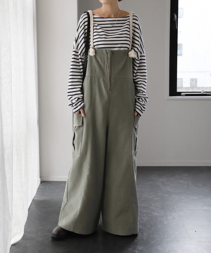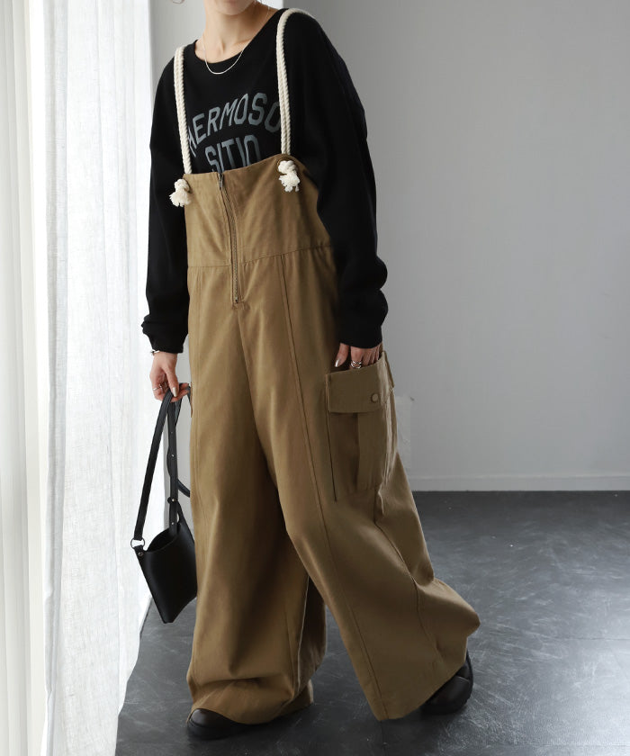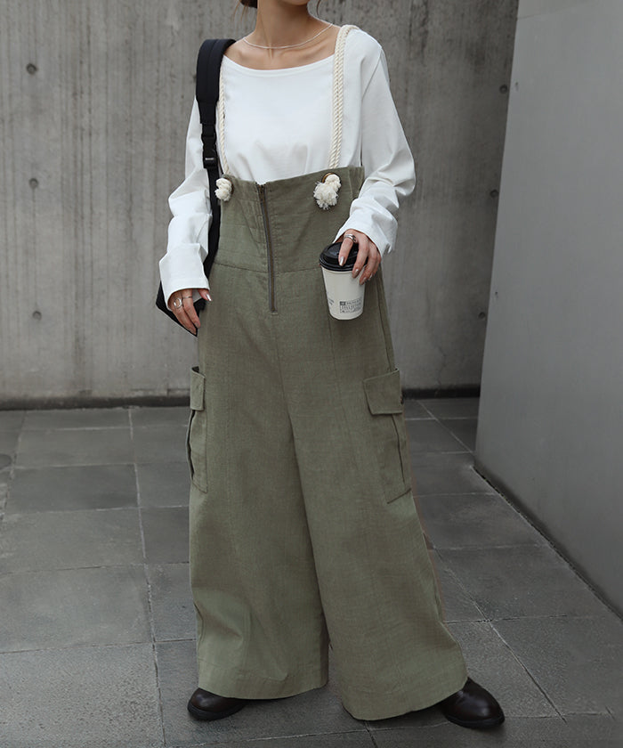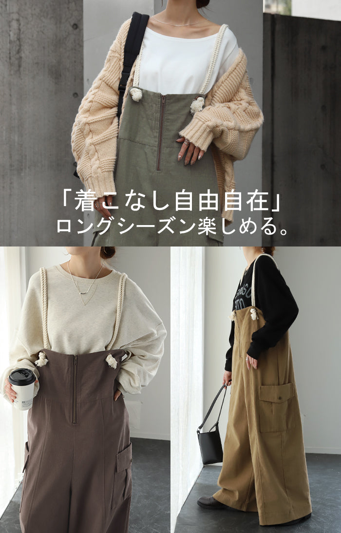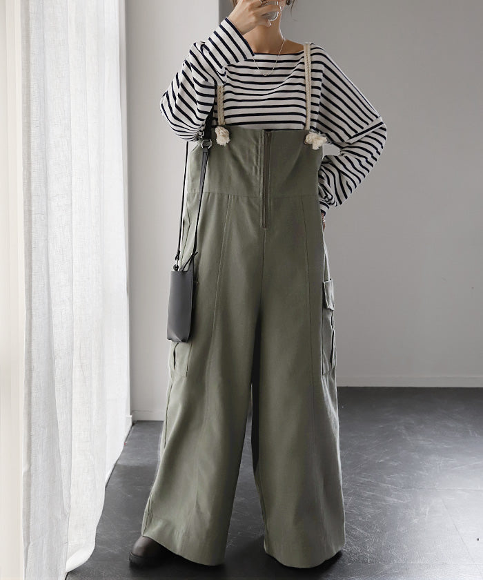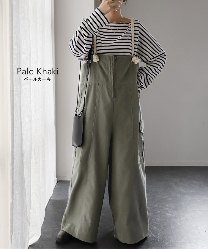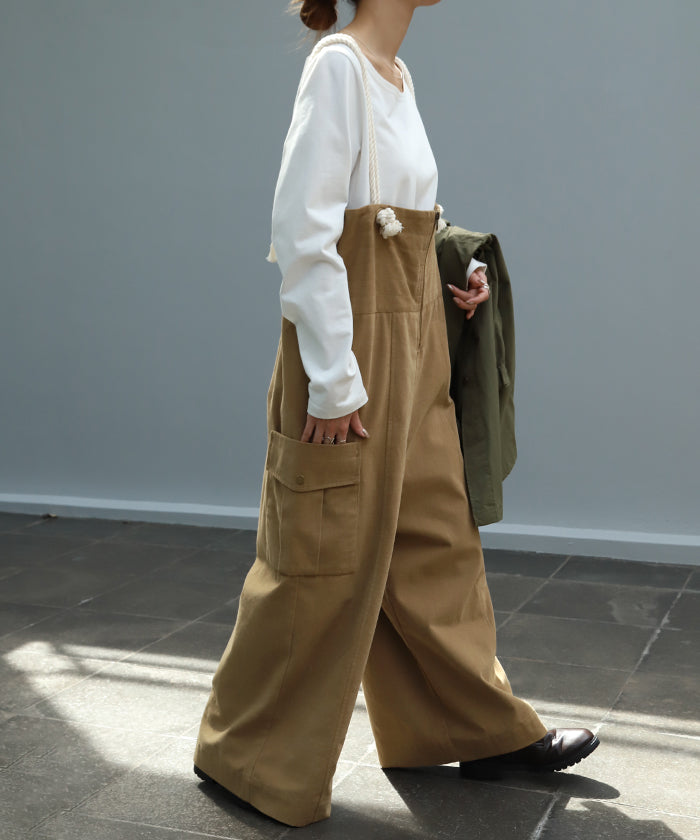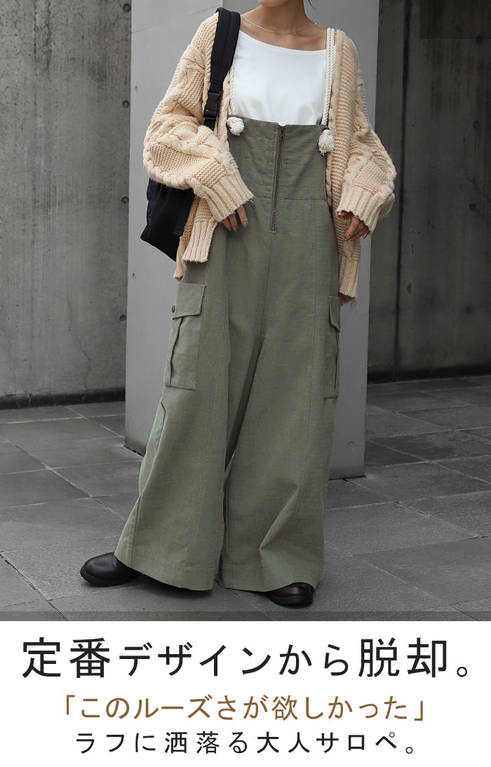 サイドのビッグカーゴポケットが大人可愛いワイドサロペットパンツです。長さ調節できる肩紐で幅広いスタイリングや体型の方にご着用いただける一枚です。季節に合ったお好みのインナーを合わせれば簡単にコーディネートが決まります。
