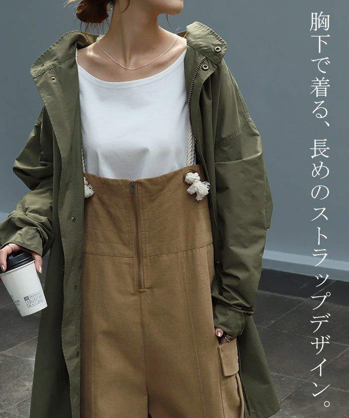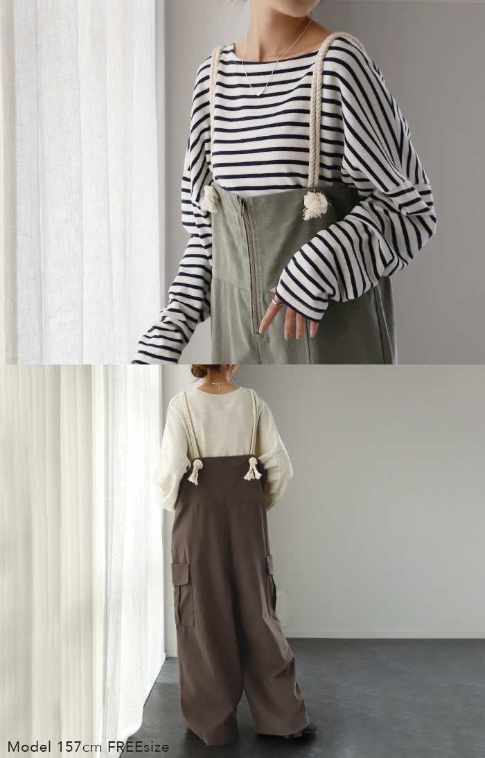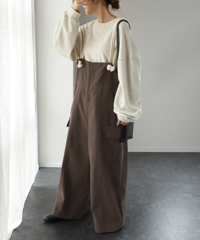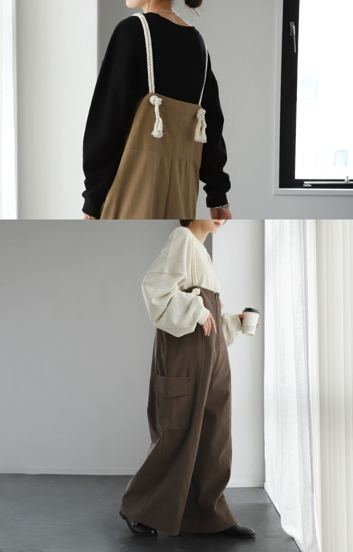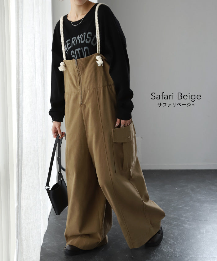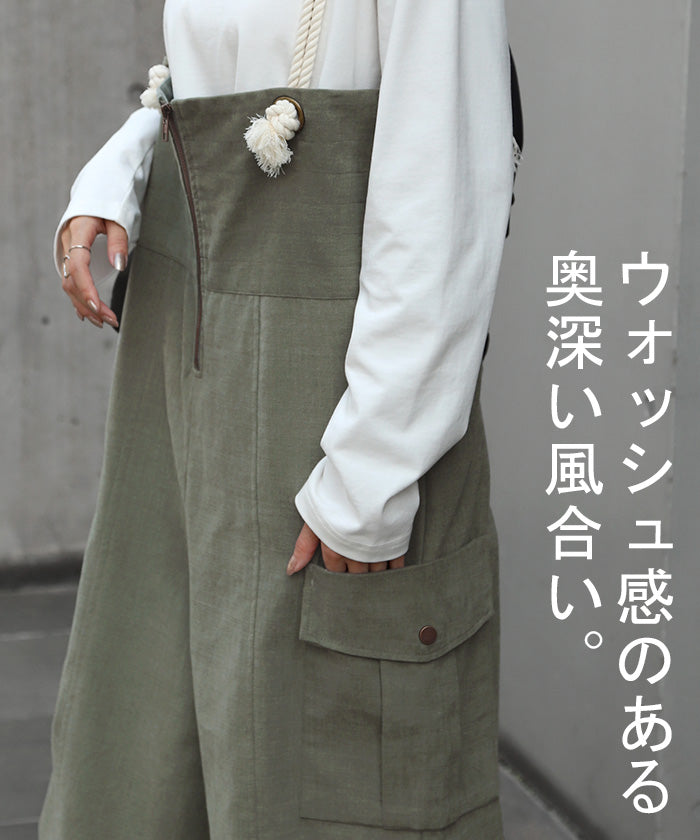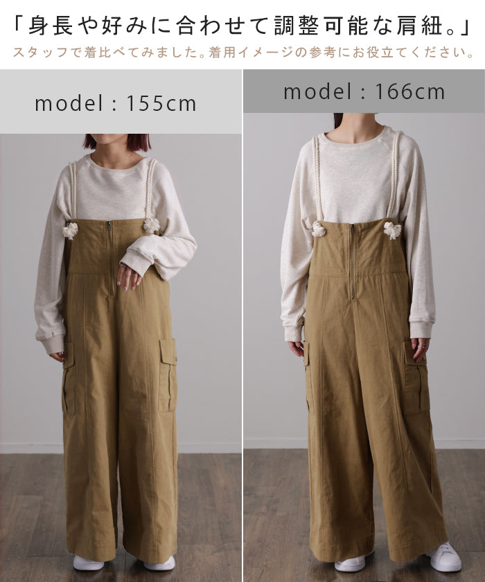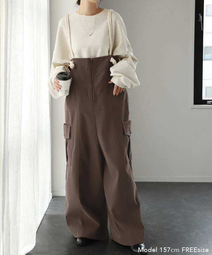 サイドのビッグカーゴポケットが大人可愛いワイドサロペットパンツです。長さ調節できる肩紐で幅広いスタイリングや体型の方にご着用いただける一枚です。季節に合ったお好みのインナーを合わせれば簡単にコーディネートが決まります。