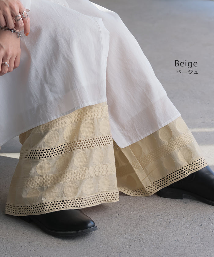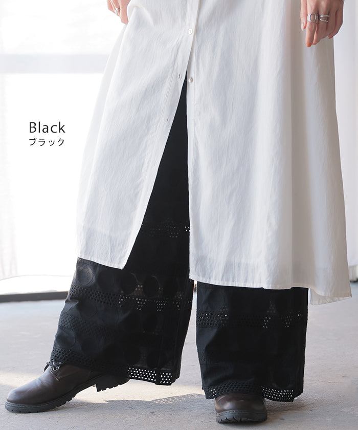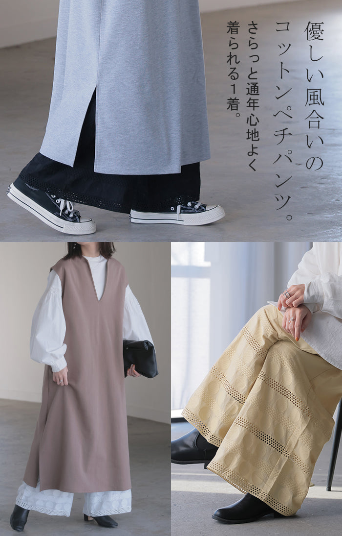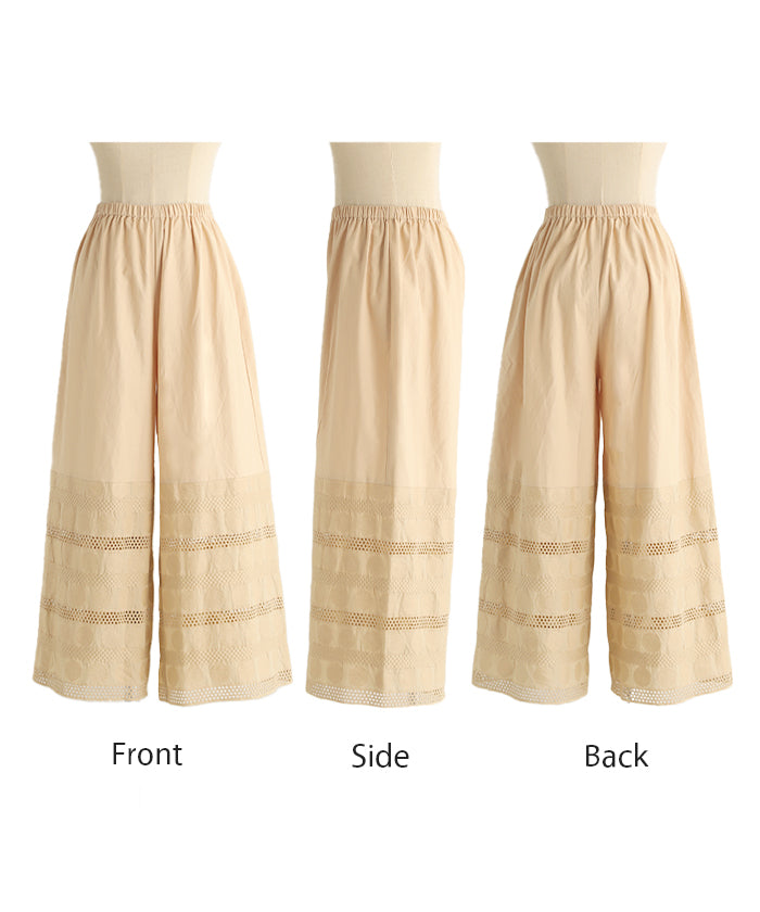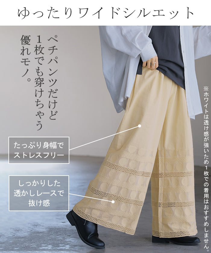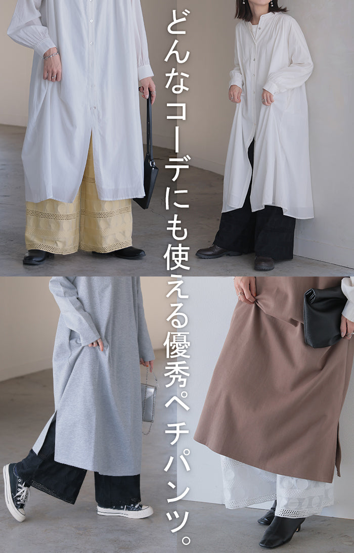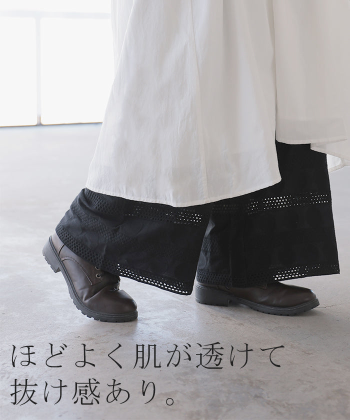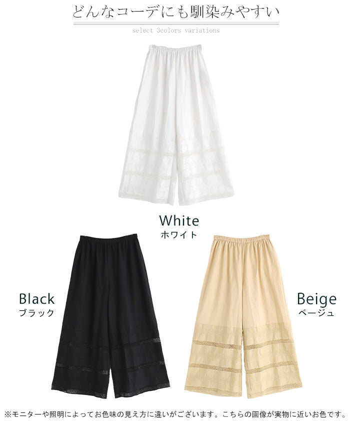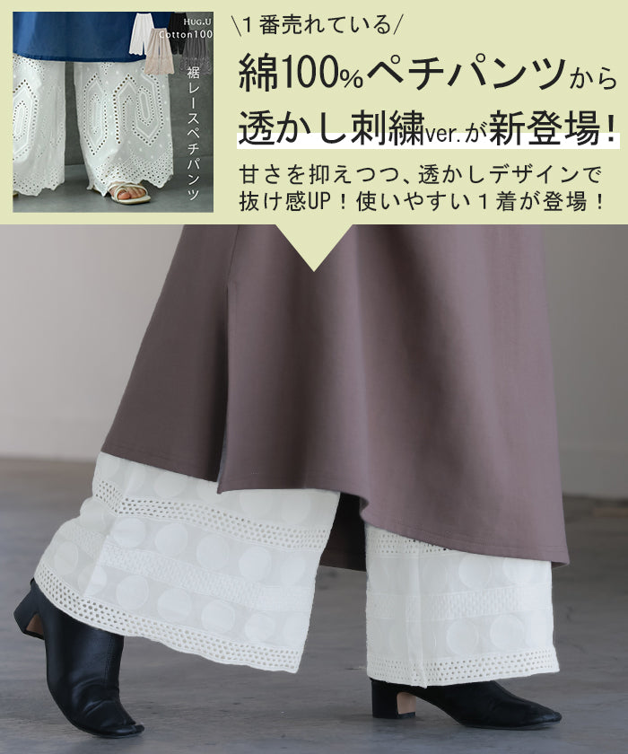 ペチパンツ 綿100% レディース レイヤード ペチコート レース 刺繍 ワイド パンツ 無地 コットン 選べる丈 シアー 切り替え ズボン フレア 裾パンツ ボトムス 体型カバー ウエストゴム ロング インナー 涼しい 重ね着 大きいサイズ 白 黒 春 夏 HUG.U