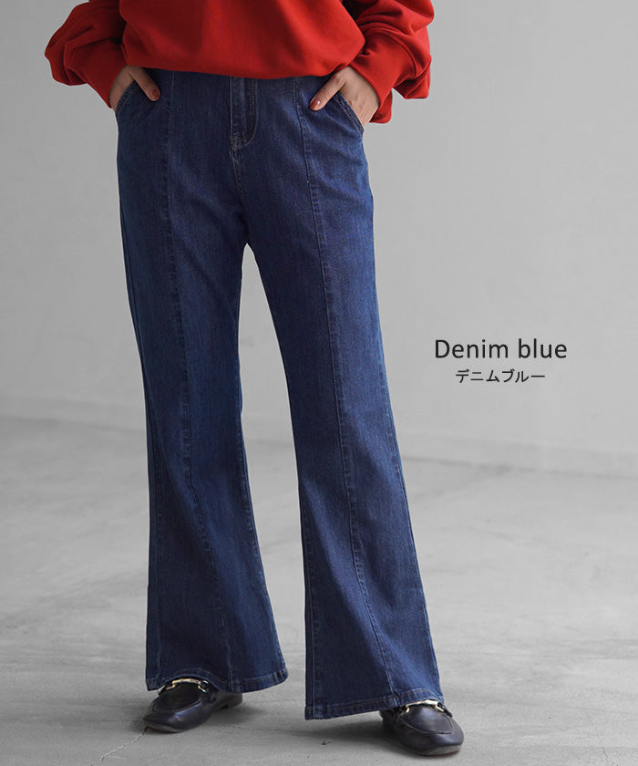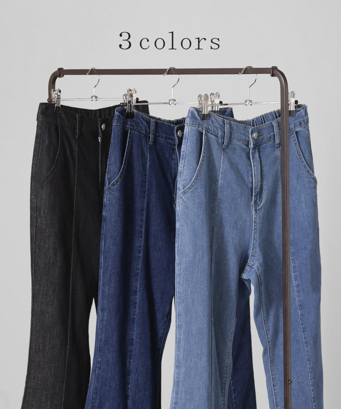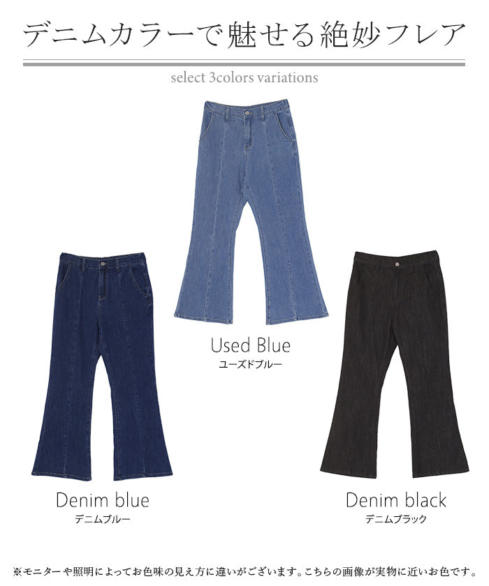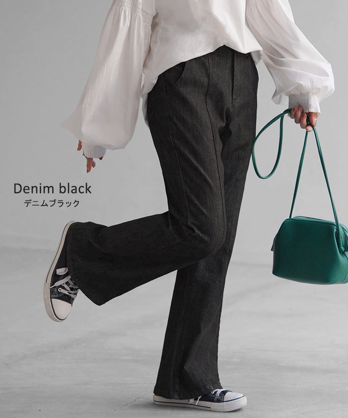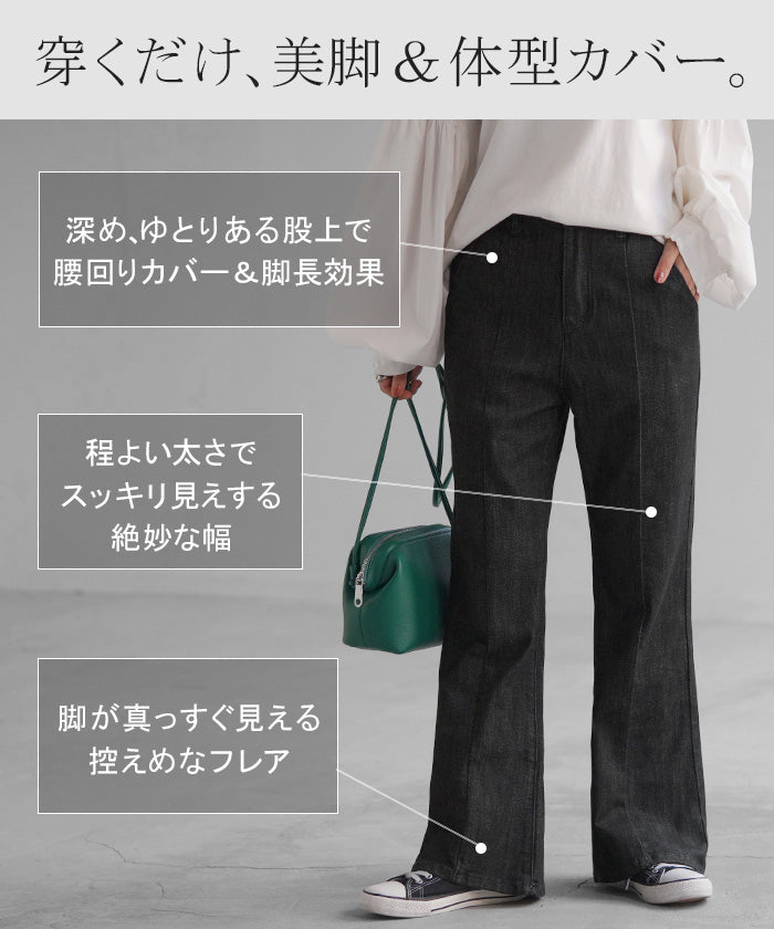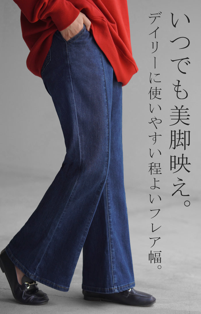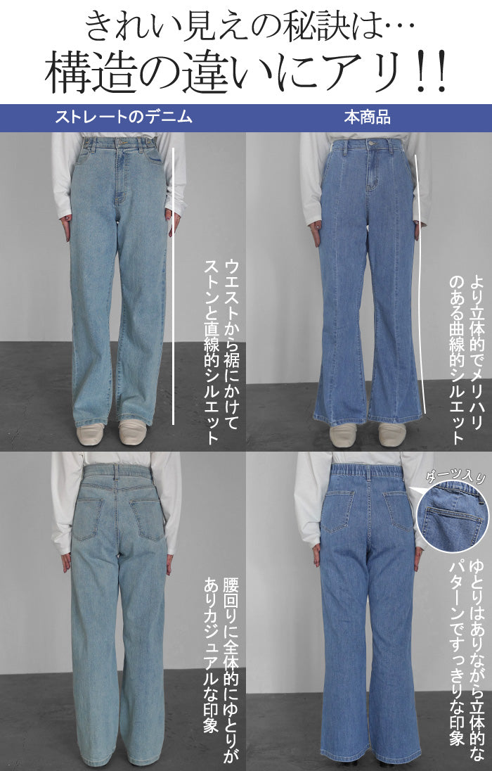 パンツ デニム フレア レディース ボトムス ストレッチ 伸縮 ウエストゴム ズボン ずぼん 無地 センターライン ロングパンツ ジーパン ジーンズ 脚長 フレアパンツ ハイウエスト ブーツカット 大きいサイズ 体型カバー 黒 ネイビー 春 夏 HUG.U