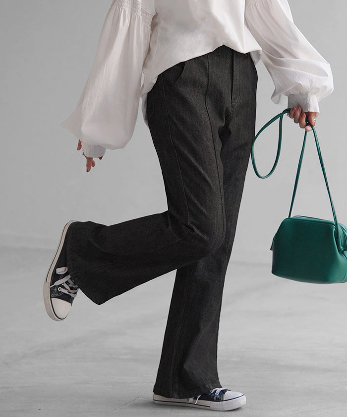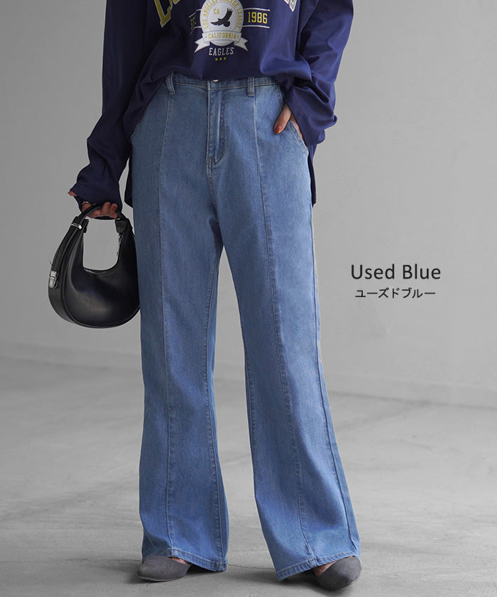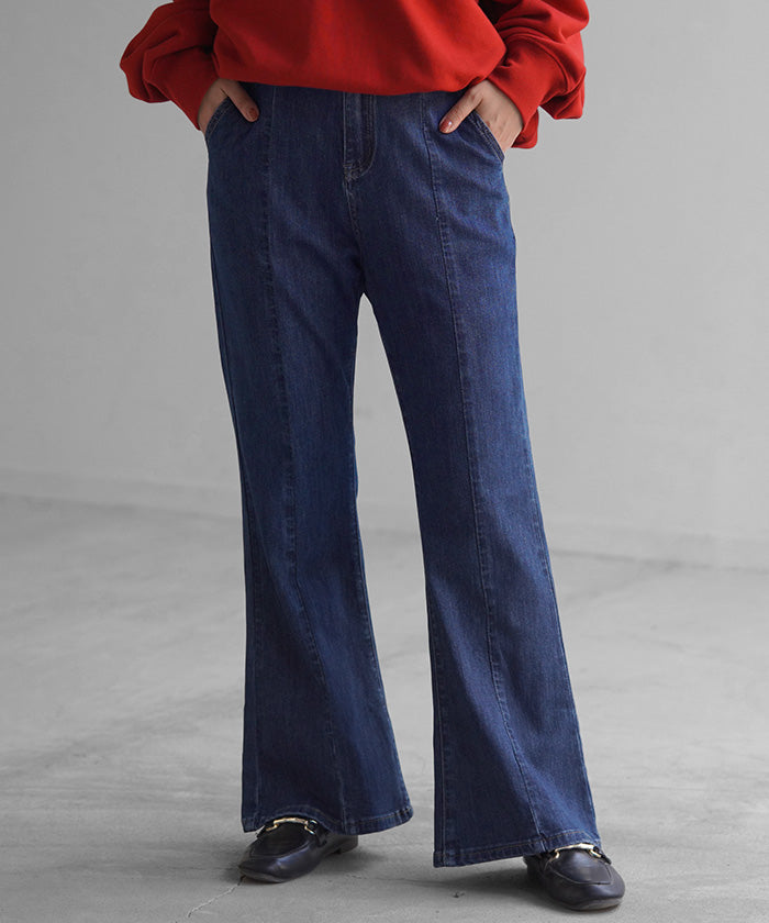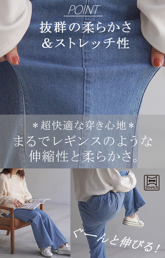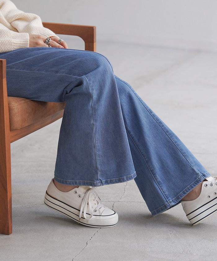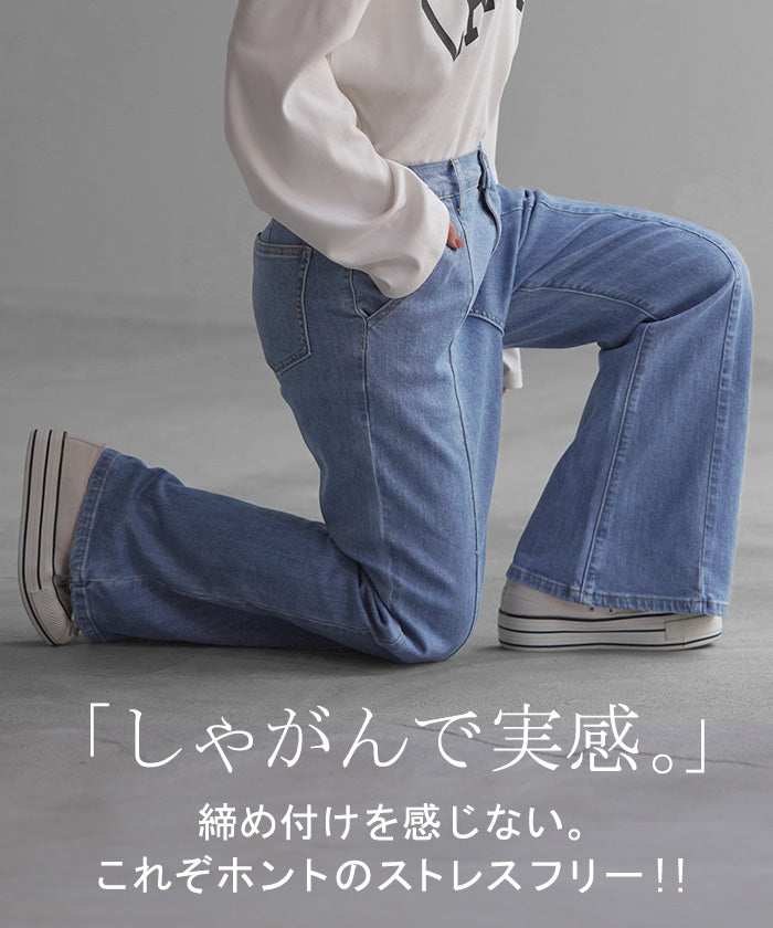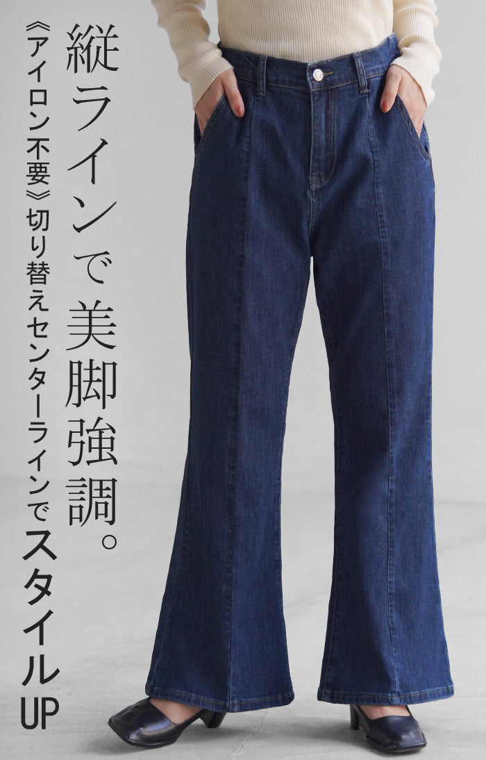 パンツ デニム フレア レディース ボトムス ストレッチ 伸縮 ウエストゴム ズボン ずぼん 無地 センターライン ロングパンツ ジーパン ジーンズ 脚長 フレアパンツ ハイウエスト ブーツカット 大きいサイズ 体型カバー 黒 ネイビー 春 夏 HUG.U