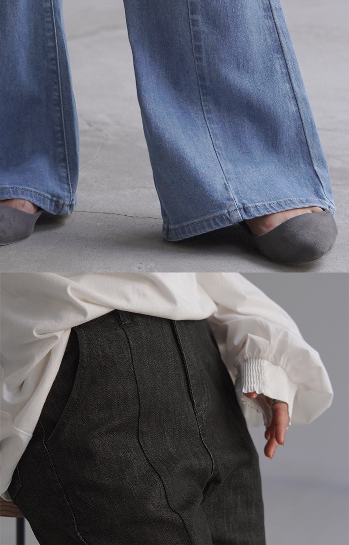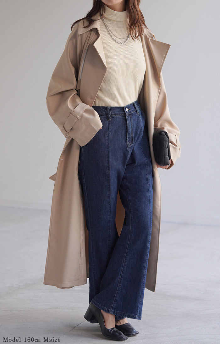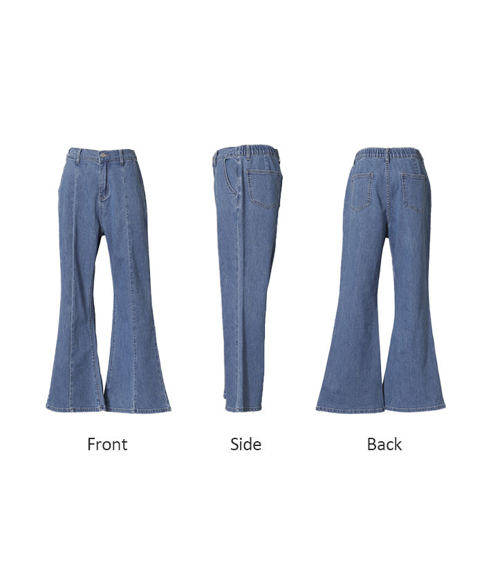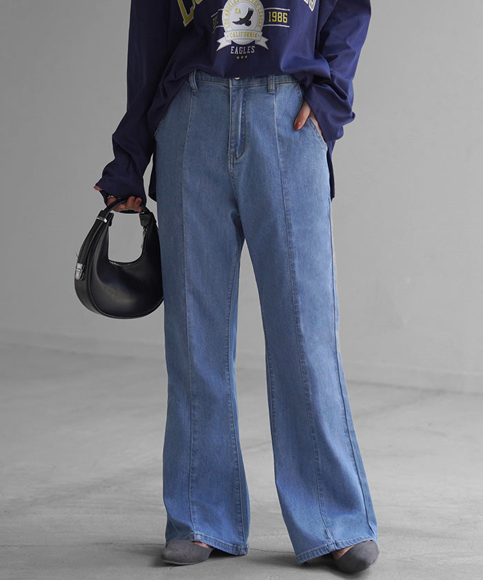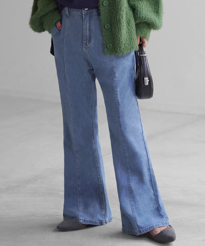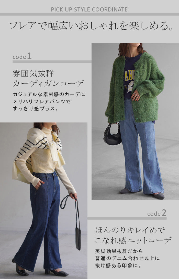 パンツ デニム フレア レディース ボトムス ストレッチ 伸縮 ウエストゴム ズボン ずぼん 無地 センターライン ロングパンツ ジーパン ジーンズ 脚長 フレアパンツ ハイウエスト ブーツカット 大きいサイズ 体型カバー 黒 ネイビー 春 夏 HUG.U