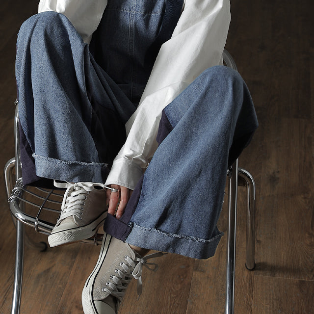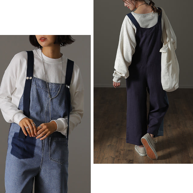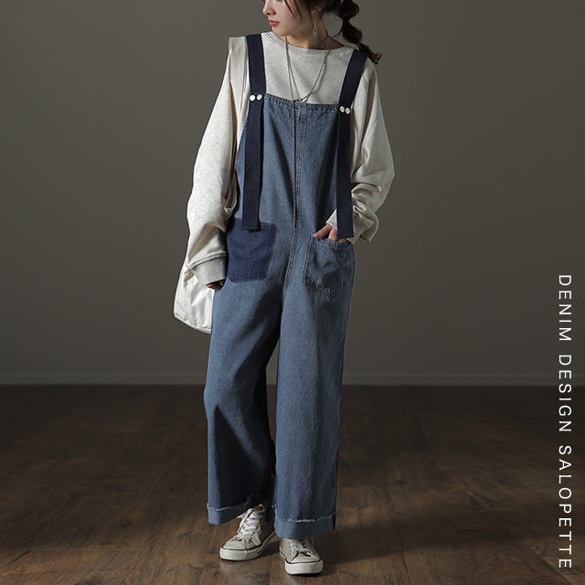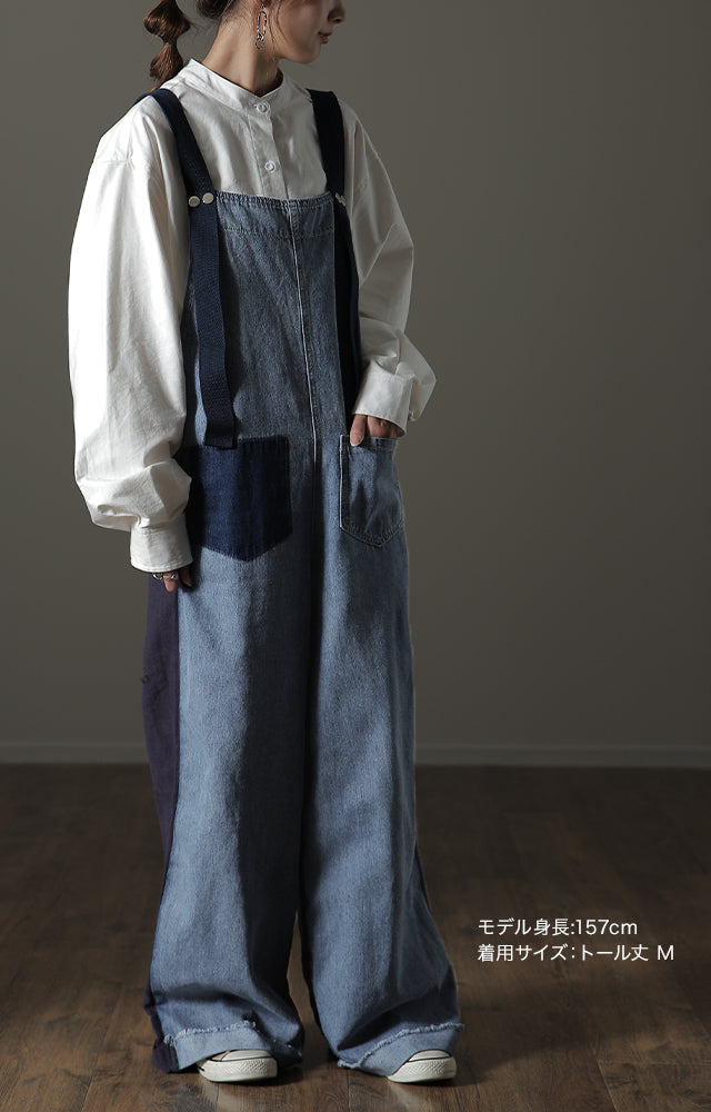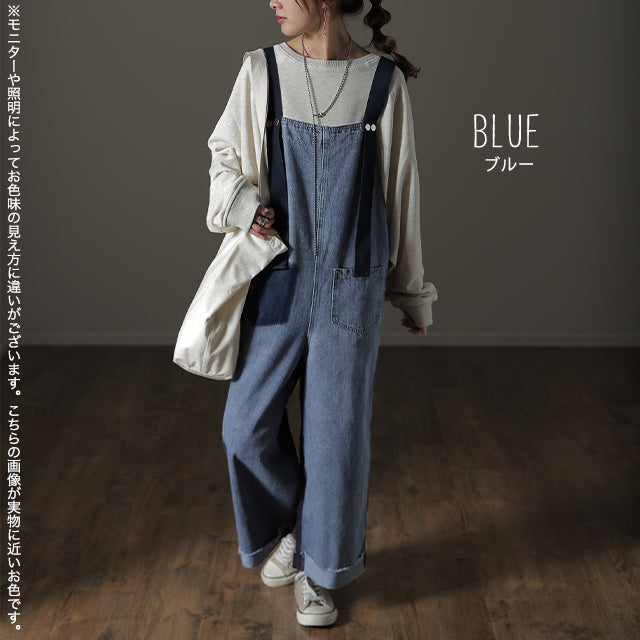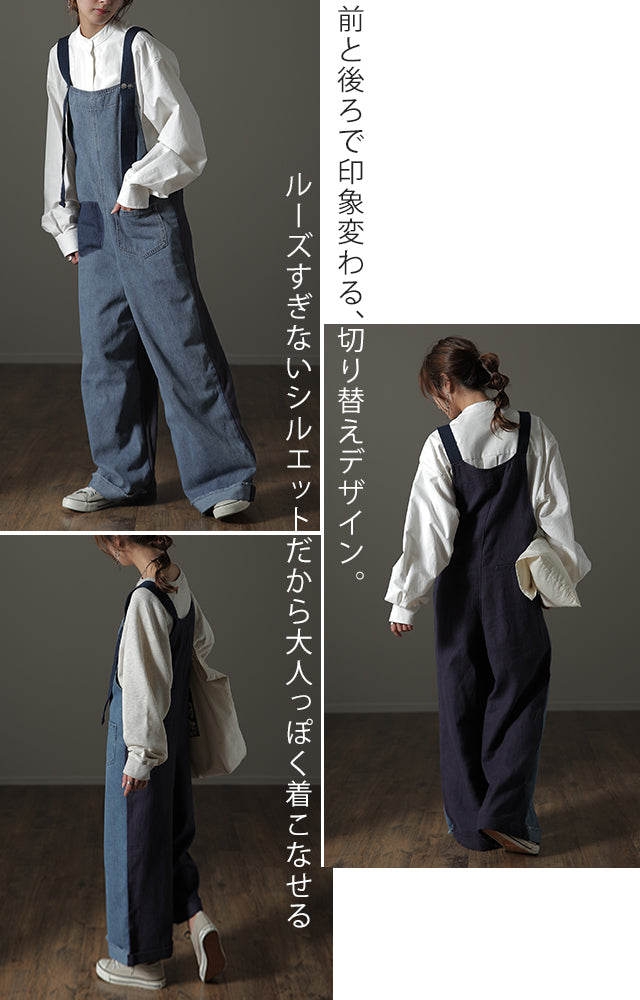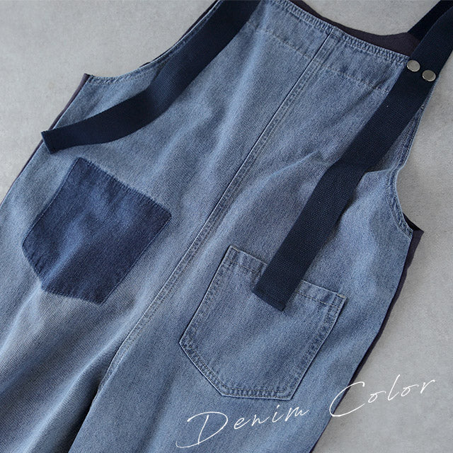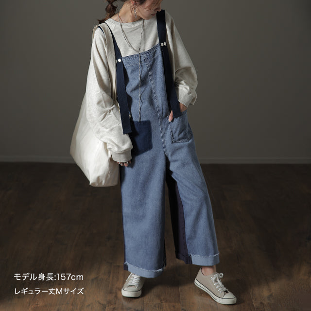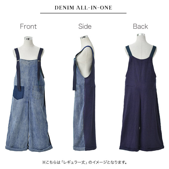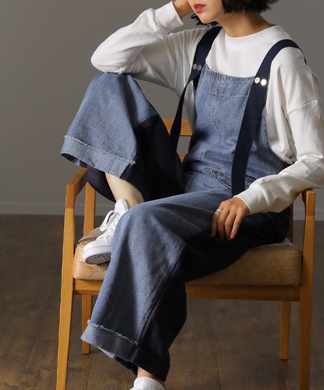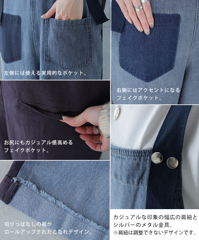 カジュアルな印象が漂うデニムのオールインワン。前後で生地が違う個性的なデザインで、肩紐の装飾や裾の折り返しなど細部にもこだわりが見られます。シンプルなトップスとも相性がよく着回し力抜群のアイテムです。着やすいデニム生地で季節を問わず着られる優れものです。 ※生地によっては染料によるデニム特有の匂いがすることがございます。気になさる場合は一度洗濯していただくと軽減できます。