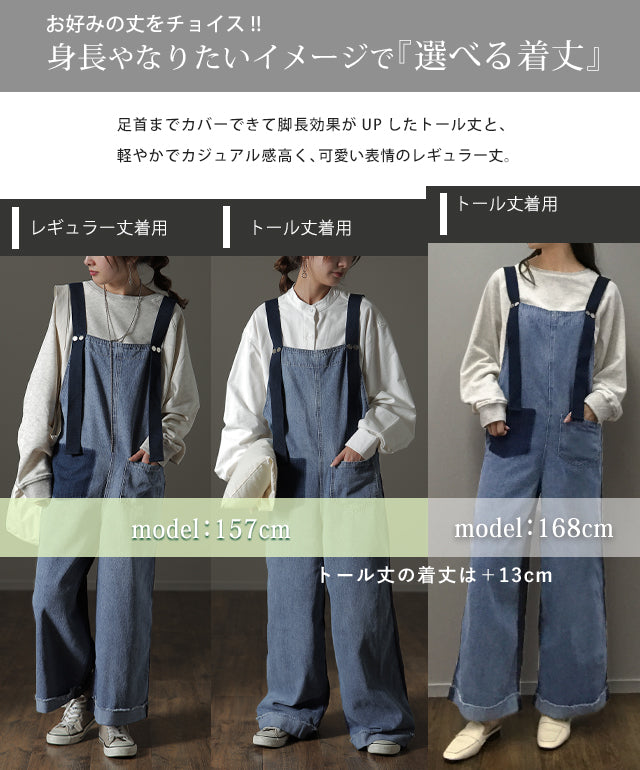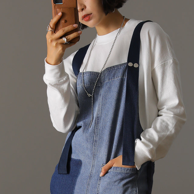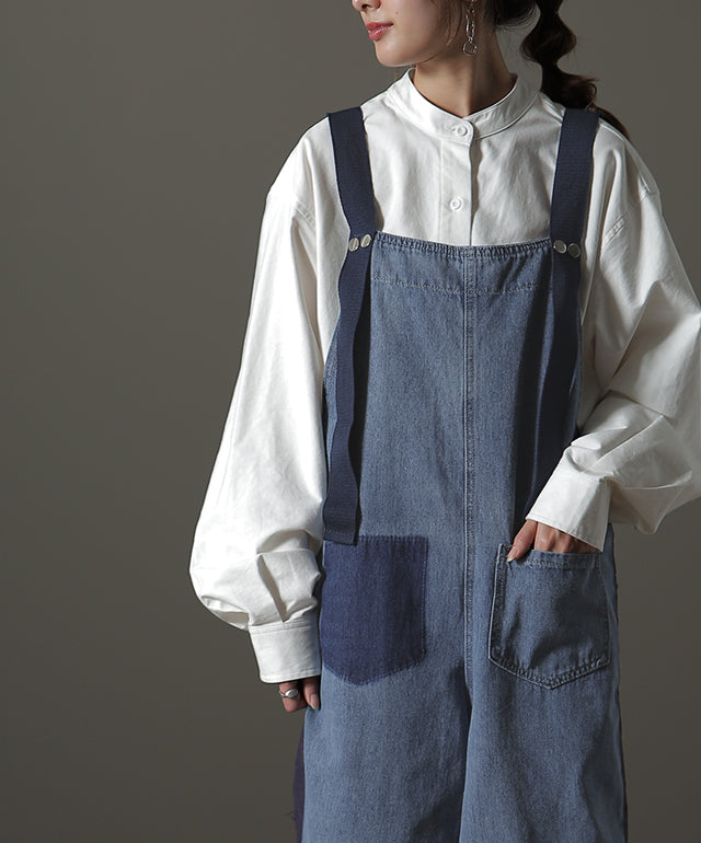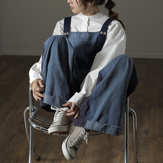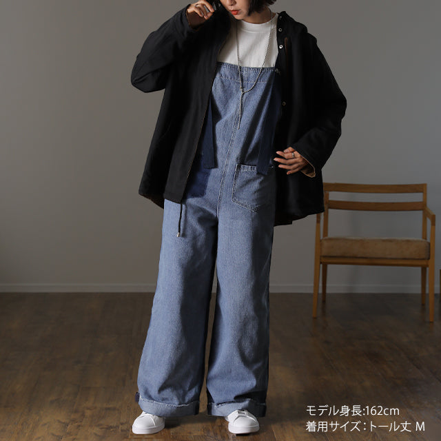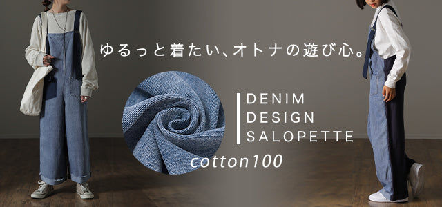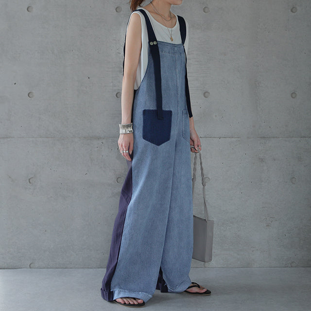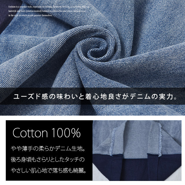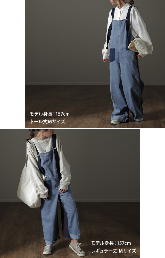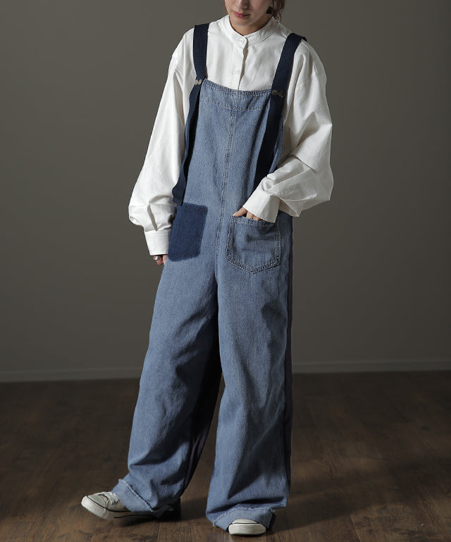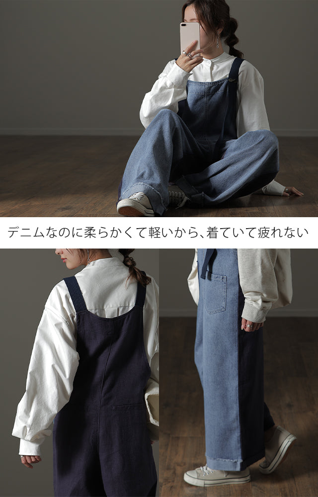 カジュアルな印象が漂うデニムのオールインワン。前後で生地が違う個性的なデザインで、肩紐の装飾や裾の折り返しなど細部にもこだわりが見られます。シンプルなトップスとも相性がよく着回し力抜群のアイテムです。着やすいデニム生地で季節を問わず着られる優れものです。 ※生地によっては染料によるデニム特有の匂いがすることがございます。気になさる場合は一度洗濯していただくと軽減できます。