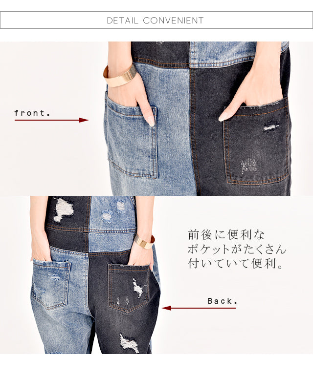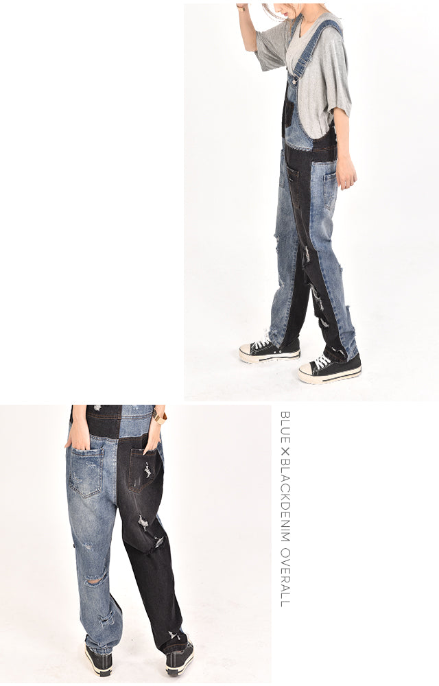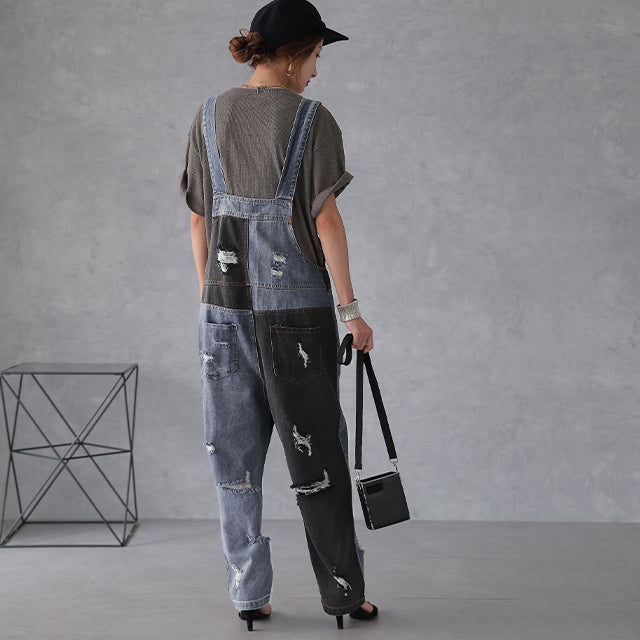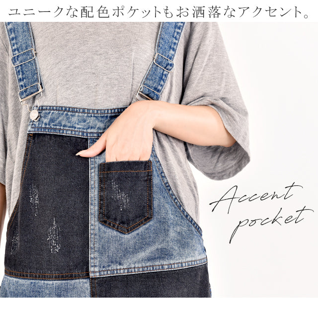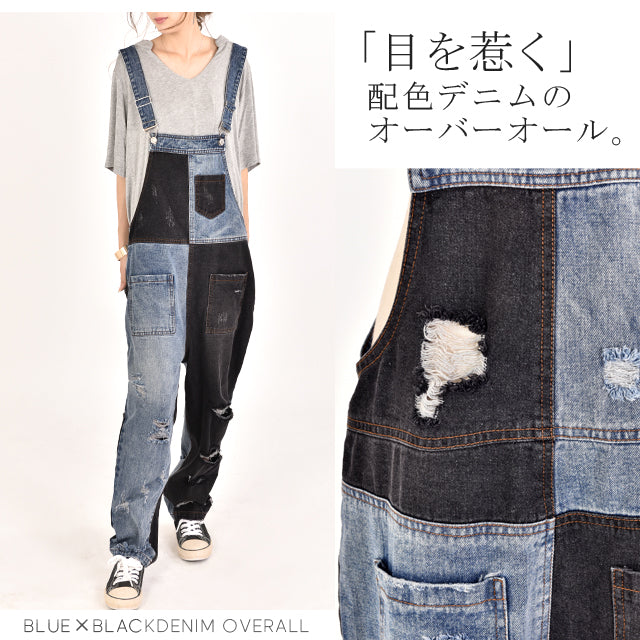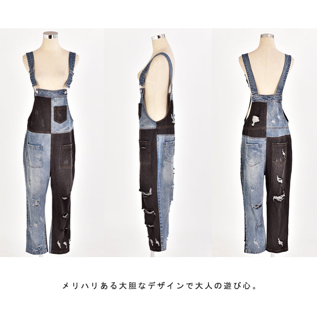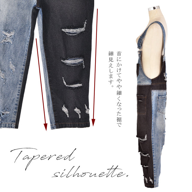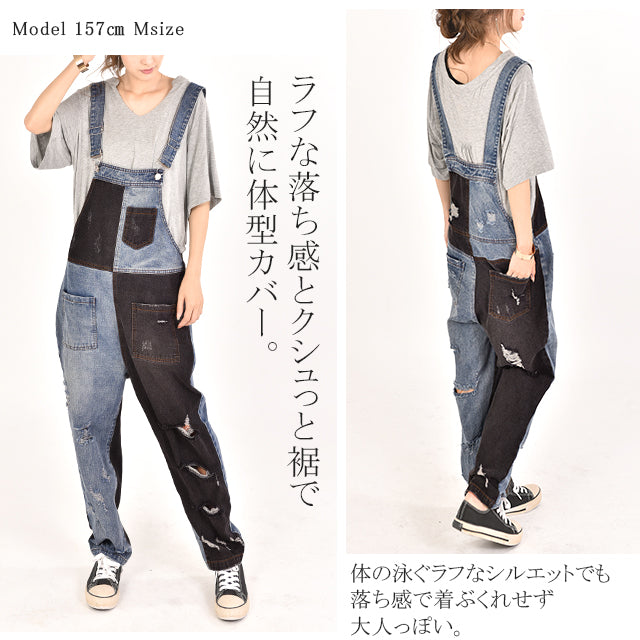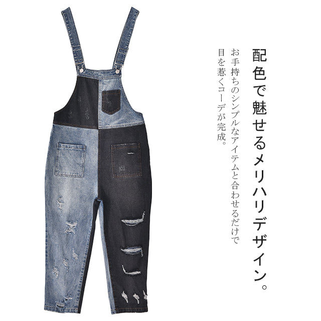 カジュアルな印象が漂う配色デニムのオールインワン。ダメージ加工と切り替えで、個性的なデザインです。シンプルなトップスとも相性がよく、時短コーデにも最適なアイテムとなっております。着やすいデニム生地で季節を問わず着られる優れものです。スッキリしたシルエットでスタイルよく見えます。