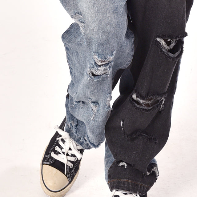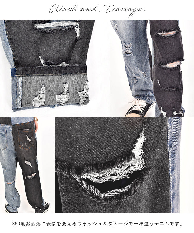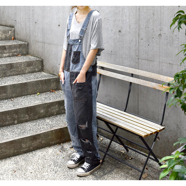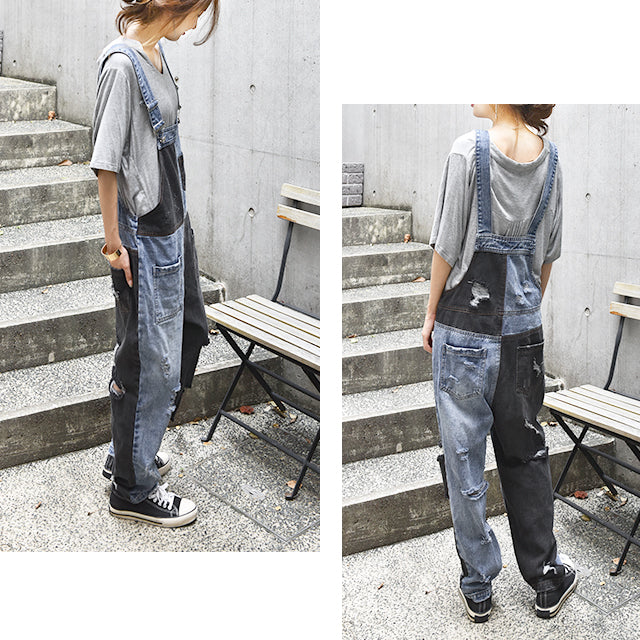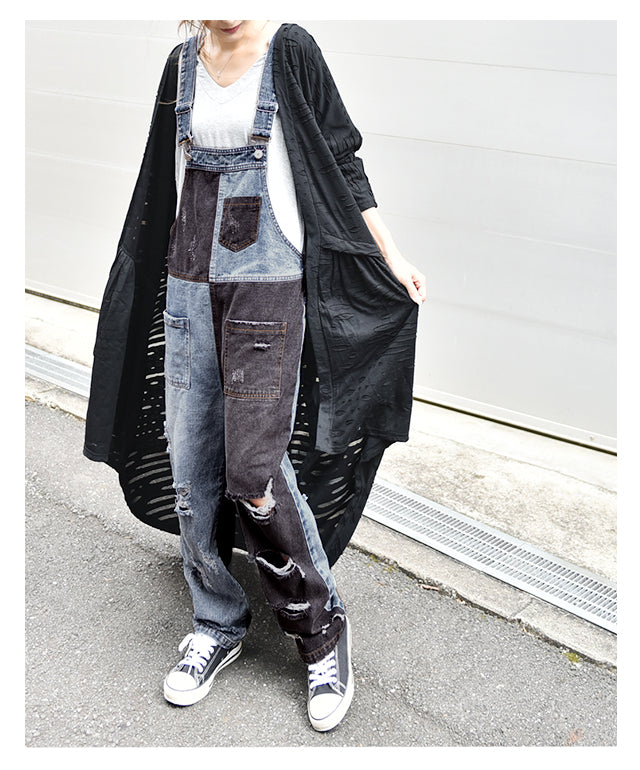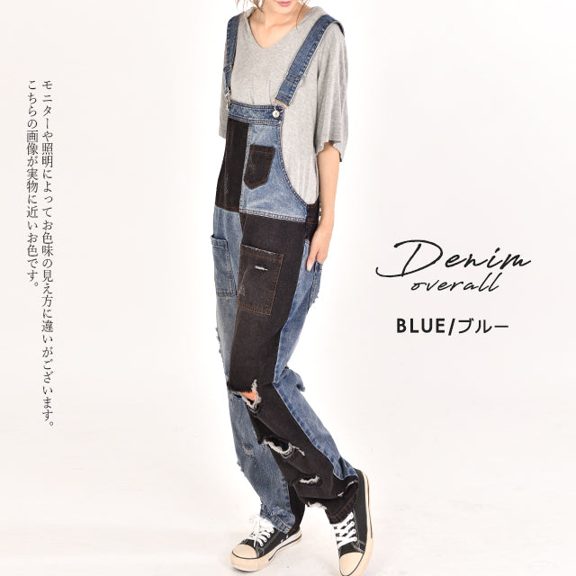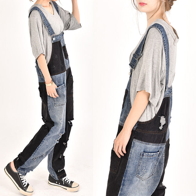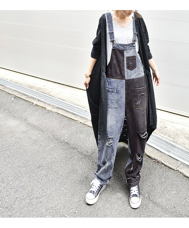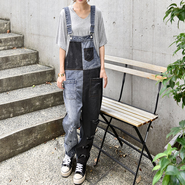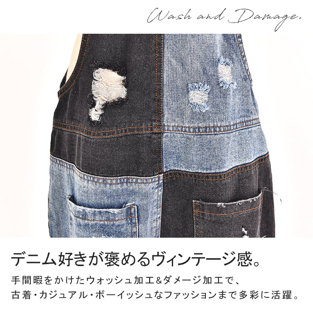 カジュアルな印象が漂う配色デニムのオールインワン。ダメージ加工と切り替えで、個性的なデザインです。シンプルなトップスとも相性がよく、時短コーデにも最適なアイテムとなっております。着やすいデニム生地で季節を問わず着られる優れものです。スッキリしたシルエットでスタイルよく見えます。