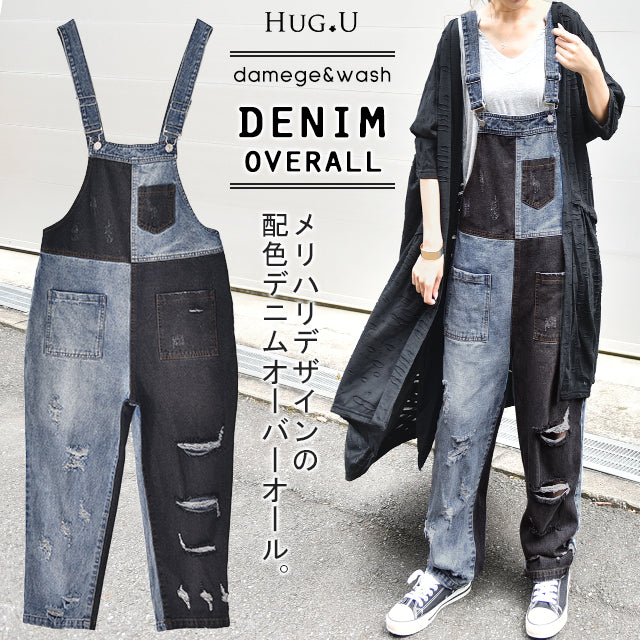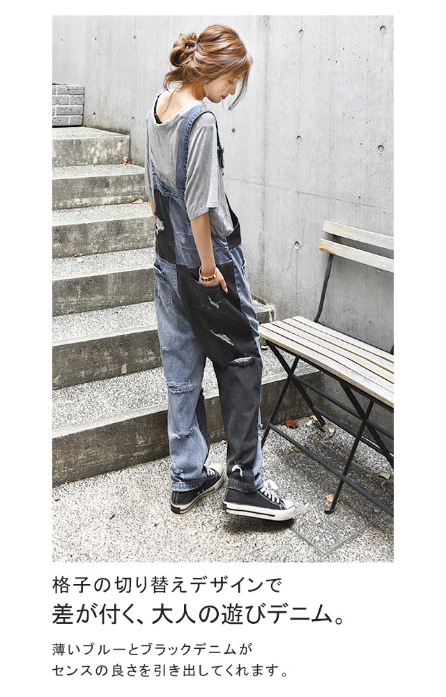 オールインワン デニム レディース サロペット ダメージ加工 デニムオールインワン 大きいサイズ サロペ つなぎ ワイドパンツ ワイド オーバーオール デニムサロペット パンツ ボトムス ロング ジーンズ 体型カバー チェック 配色 春 夏 HUG.U