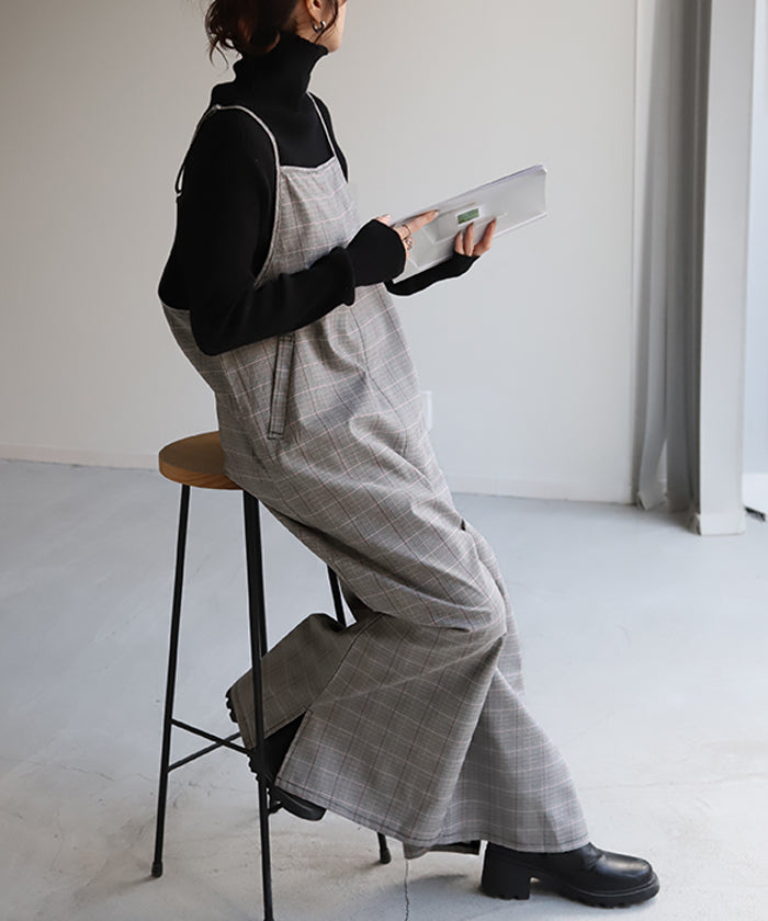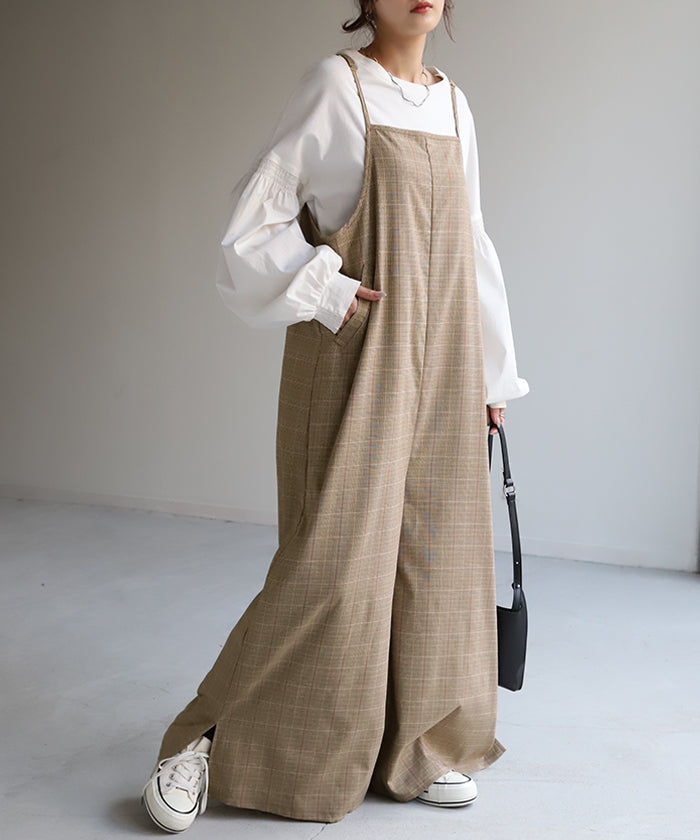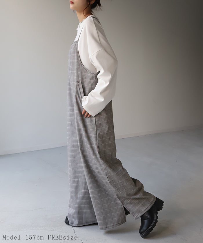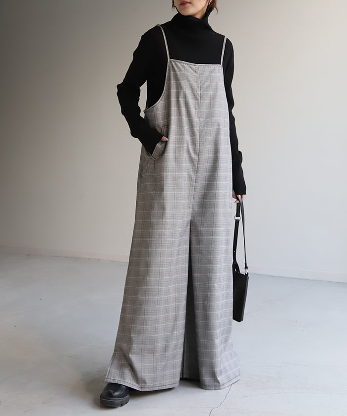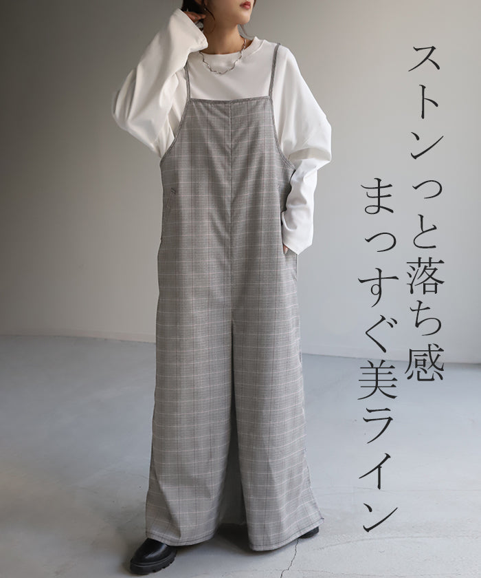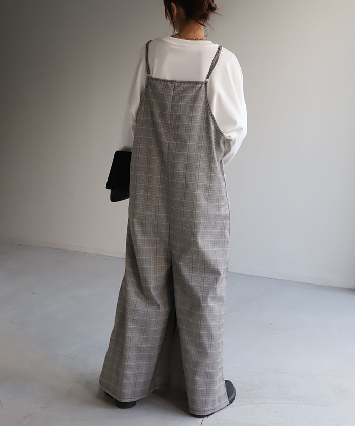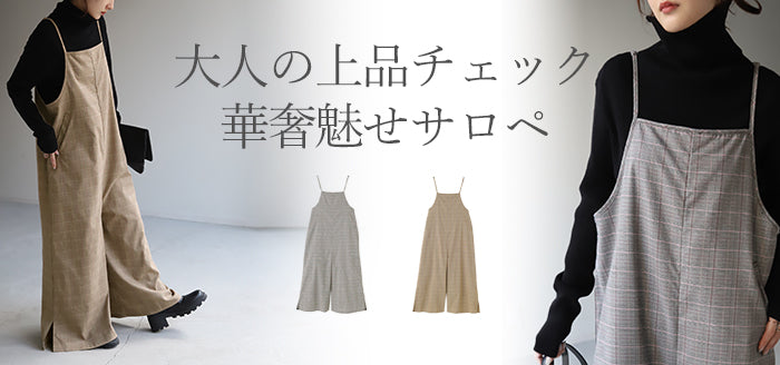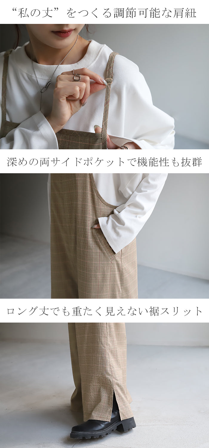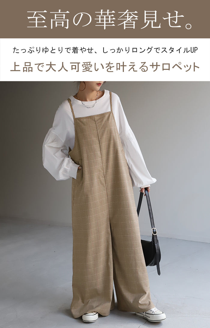 グレンチェック柄のオールインワンサロペット。トラッド柄なので、ラフなのに何処か上品な雰囲気に。スラッと見せるために計算された縦長デザインは体型を絶妙にカバーしてスタイルアップしてくれます。