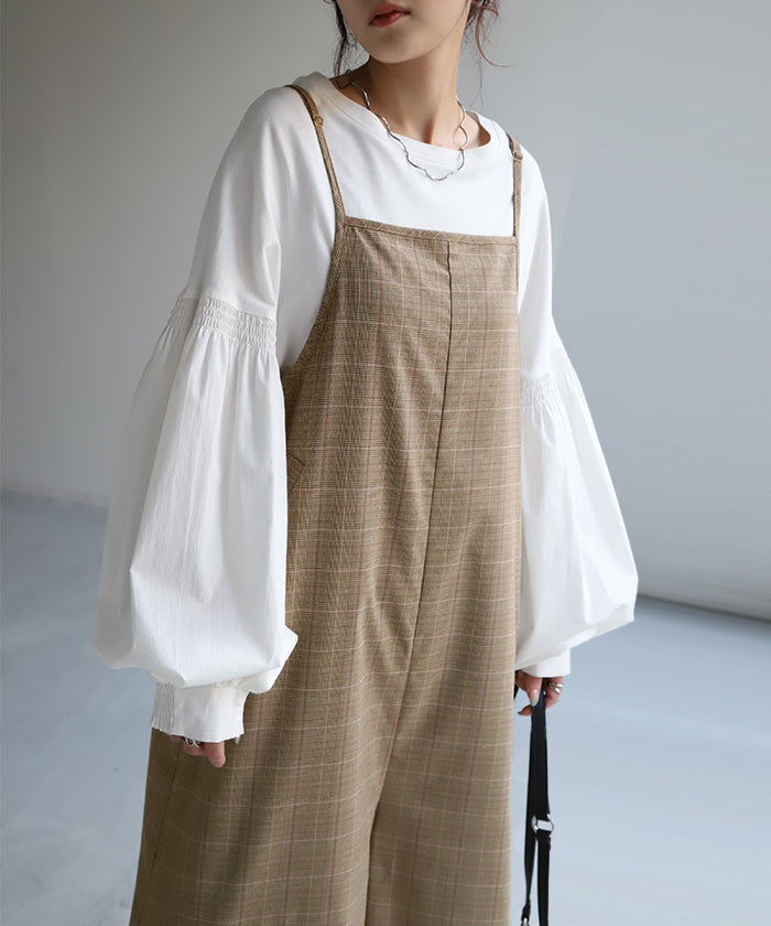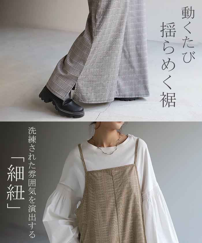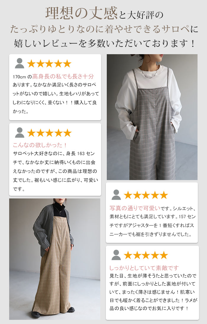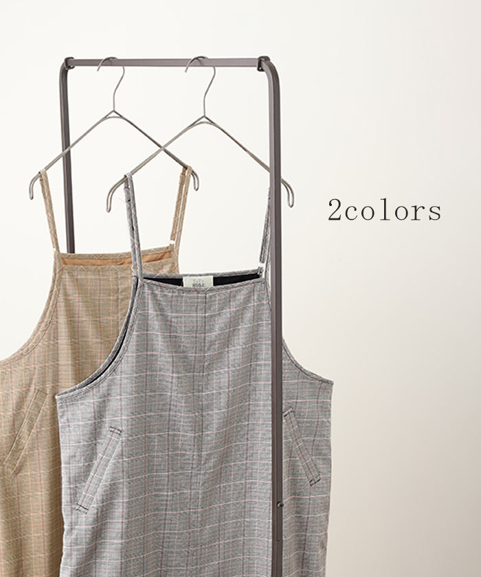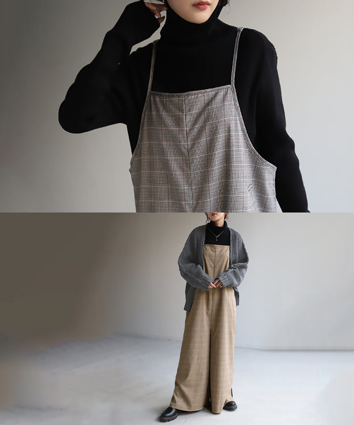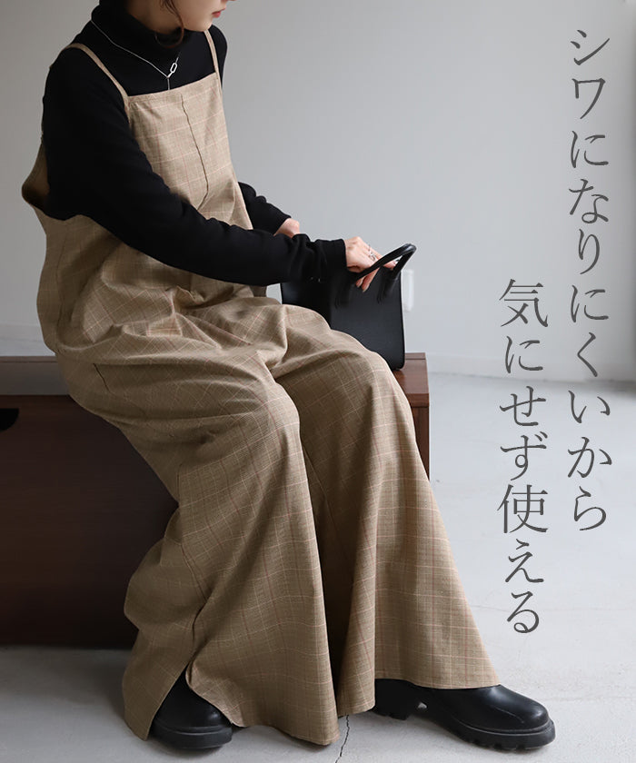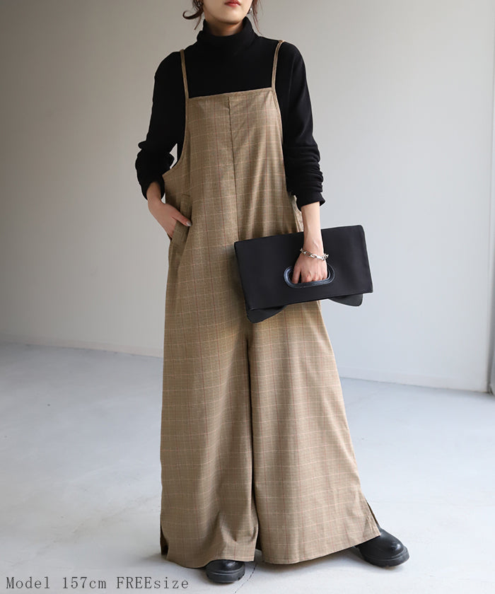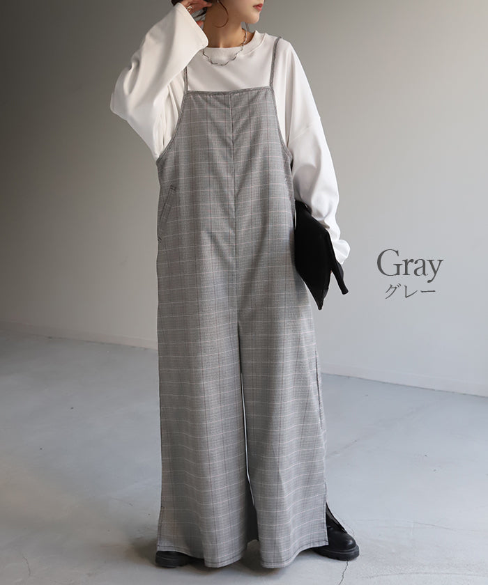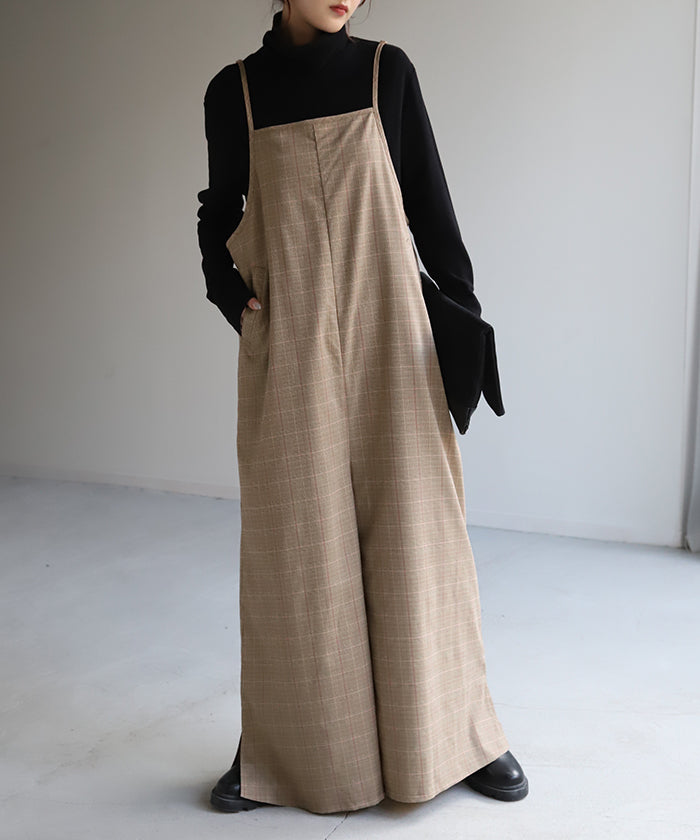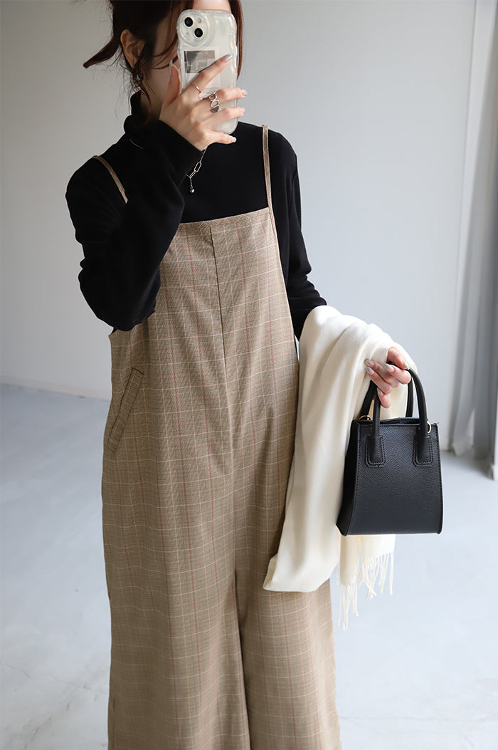 グレンチェック柄のオールインワンサロペット。トラッド柄なので、ラフなのに何処か上品な雰囲気に。スラッと見せるために計算された縦長デザインは体型を絶妙にカバーしてスタイルアップしてくれます。