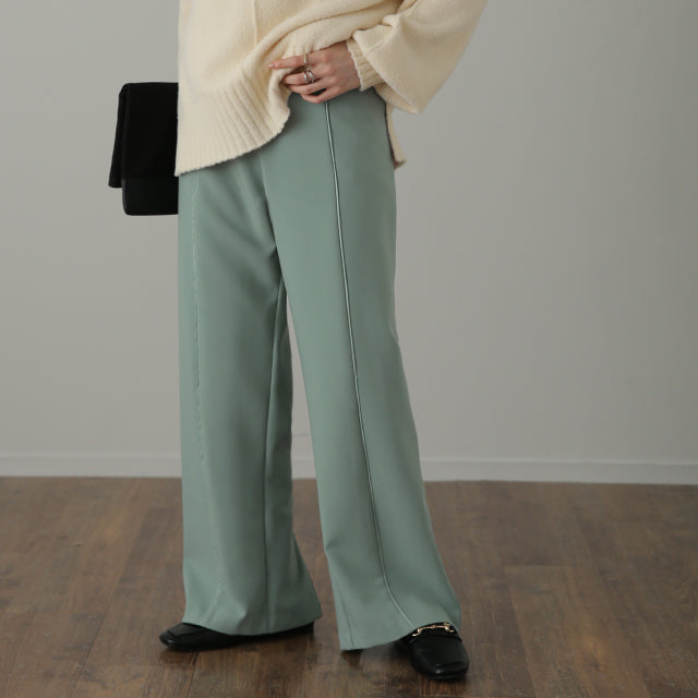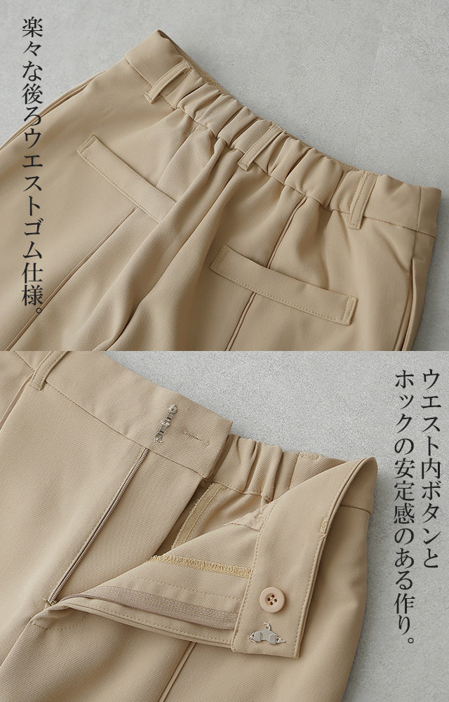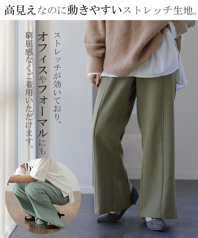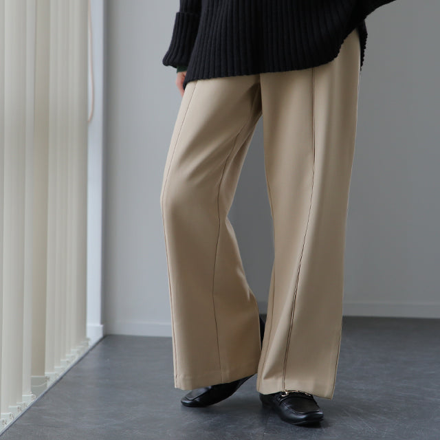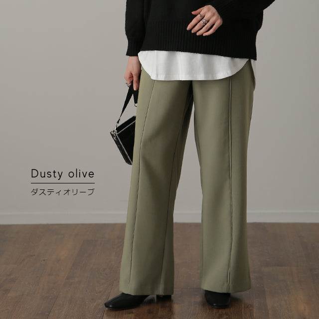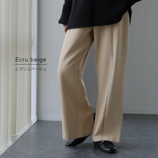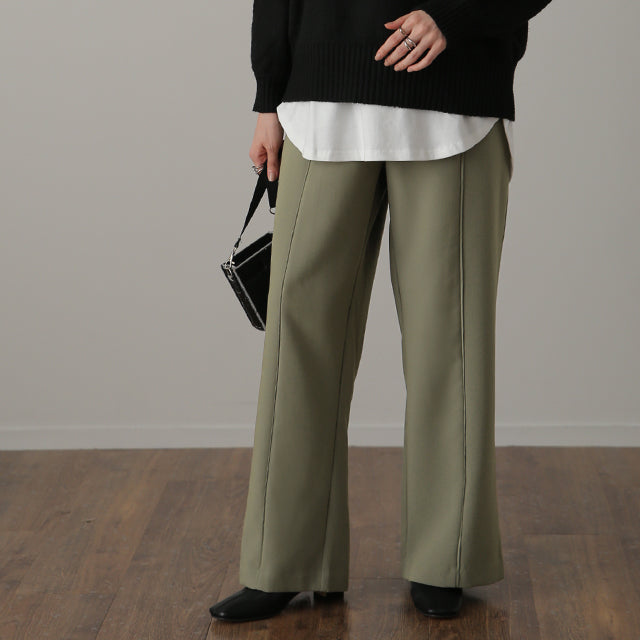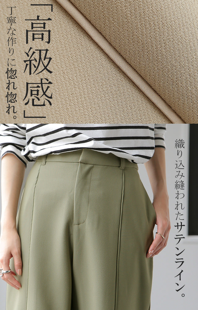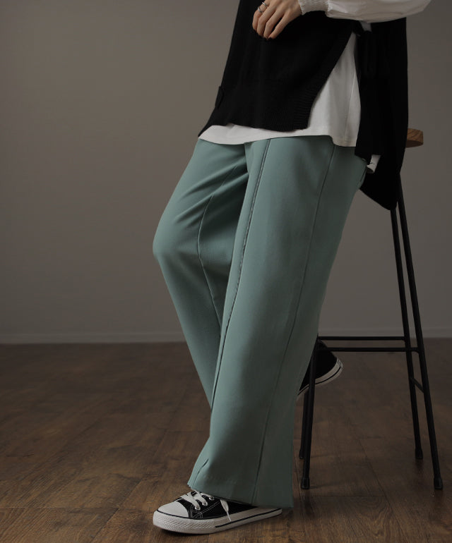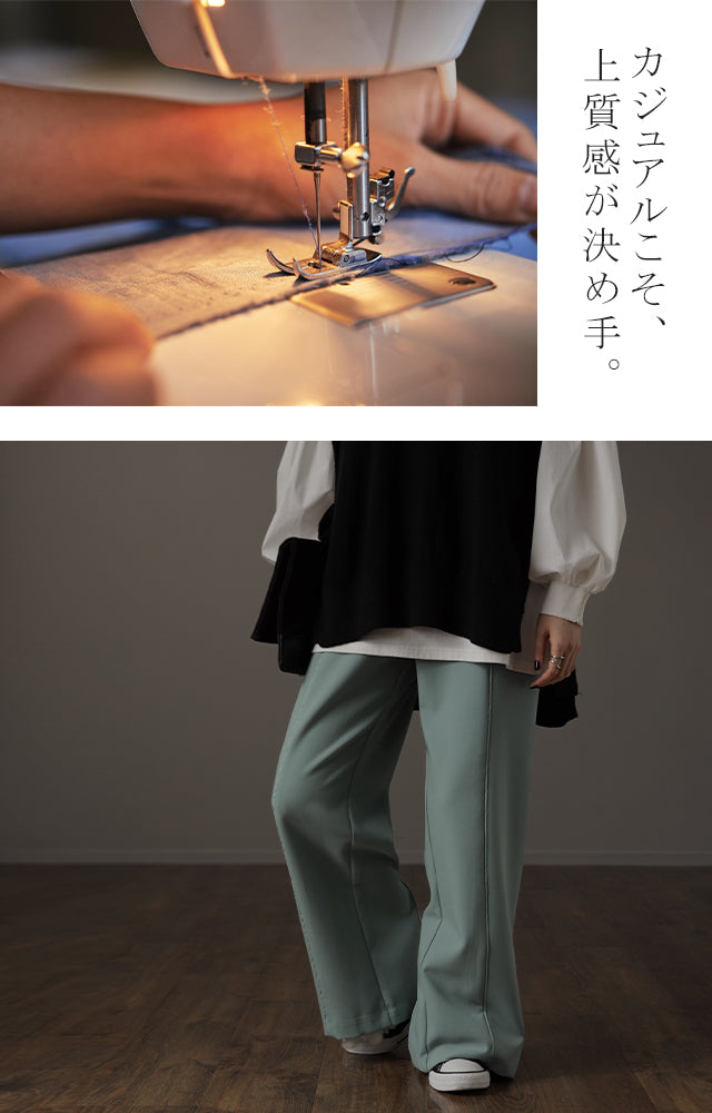 こなれ感を演出するセンターライン入りイージーパンツ。細すぎず太すぎない絶妙なシルエットで足長効果も◎。ラクにはけて足が抜群にきれいに見える優秀な一本です。