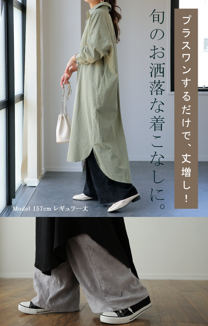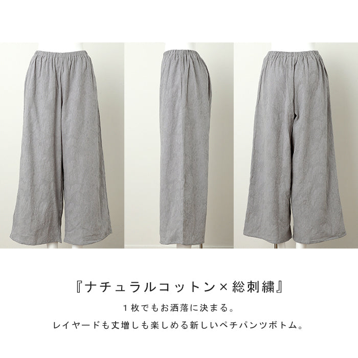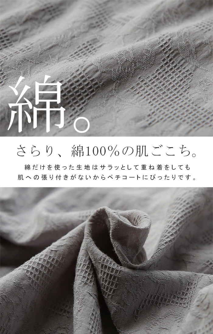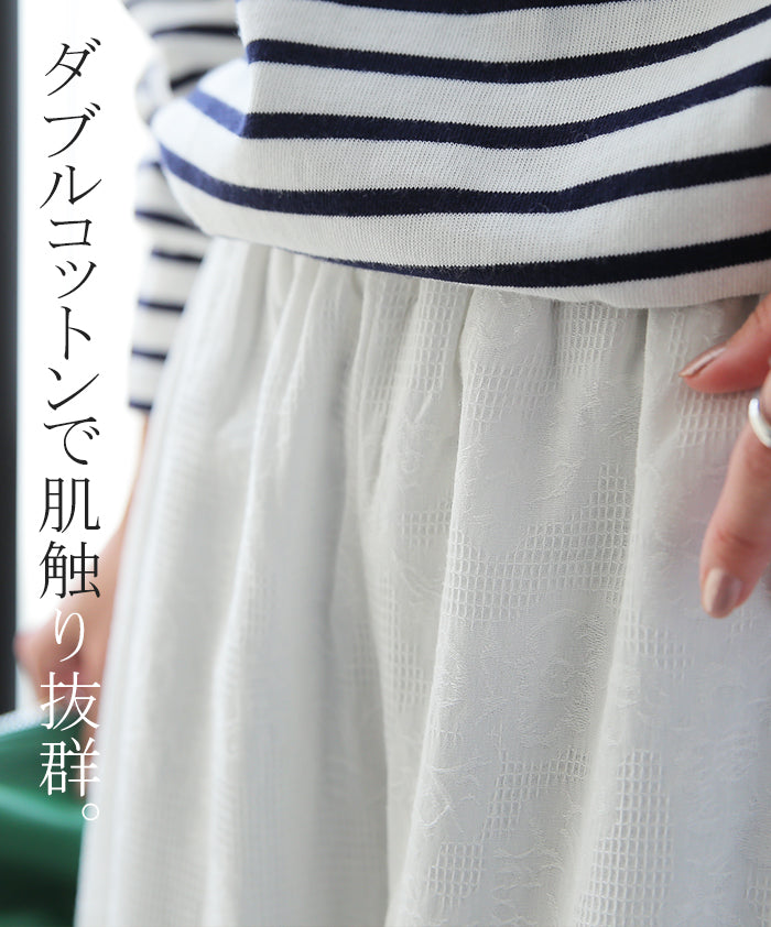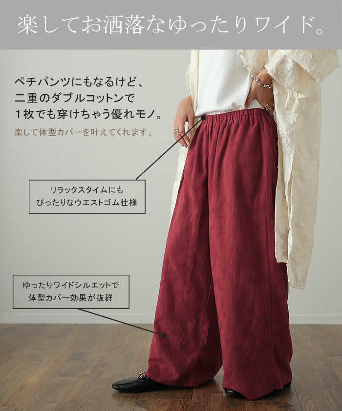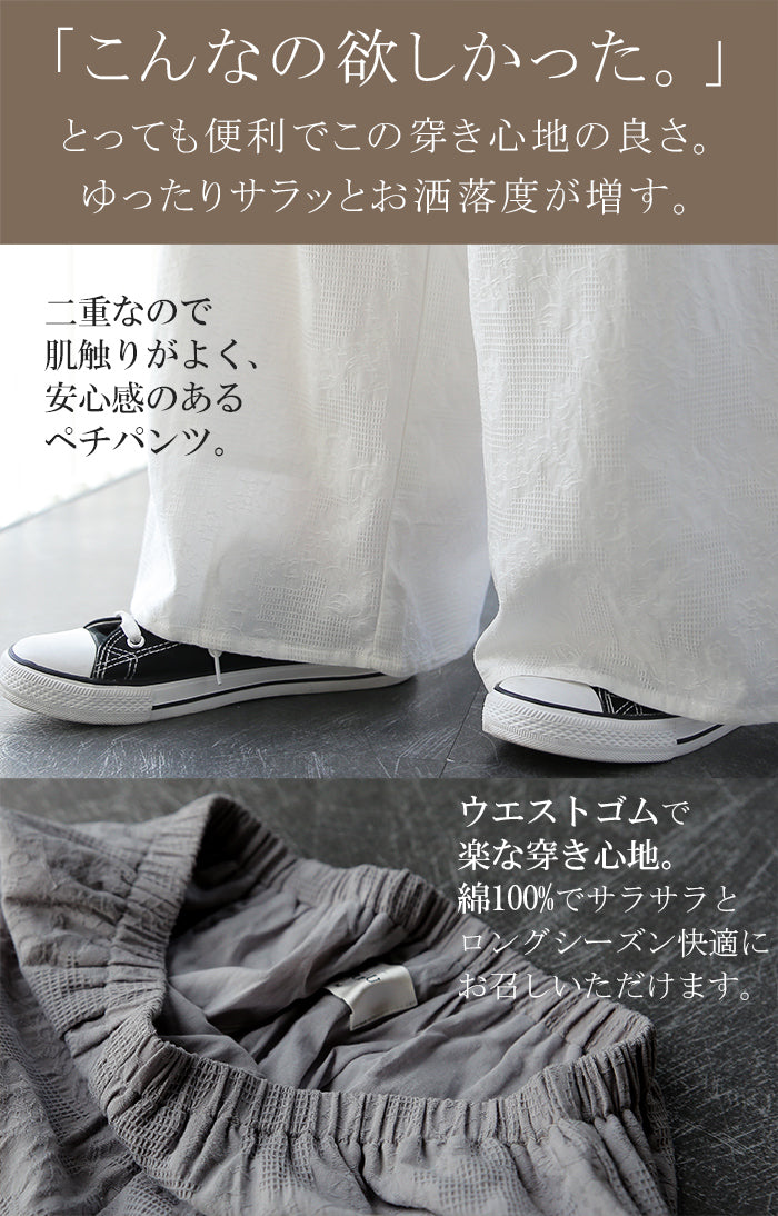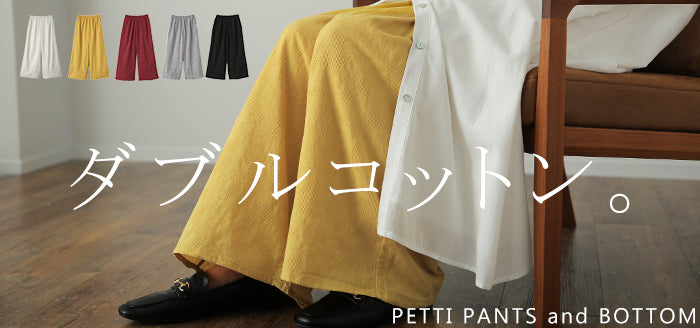 大人のレイヤードが華やぐ重ね着用ペチパンツ。 リラックス感あるワイドシルエットなので体型をカバーし自然に着痩せ。 ダブルコットンのさらっとした素材感で快適な履き心地です。