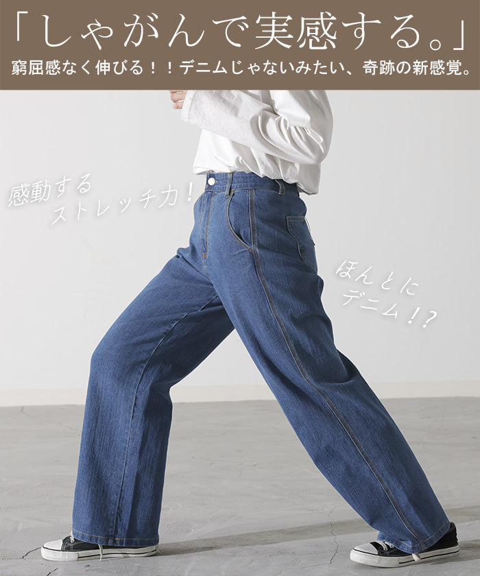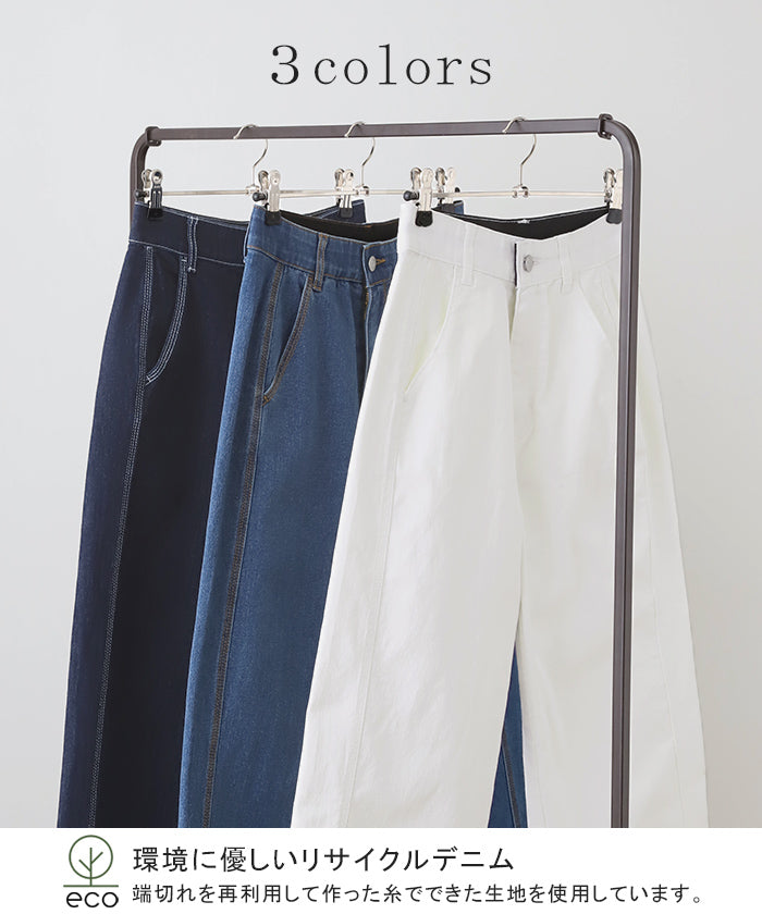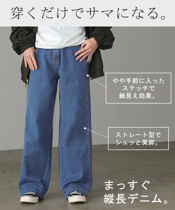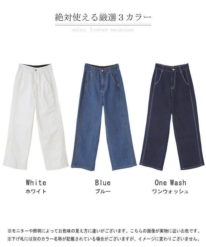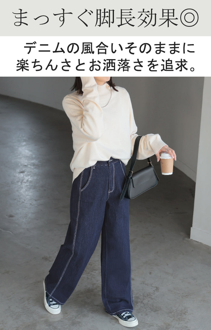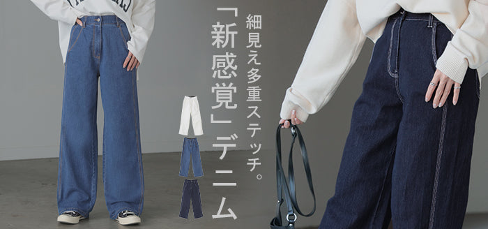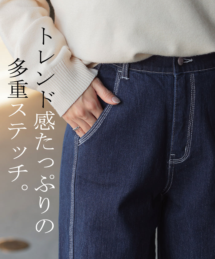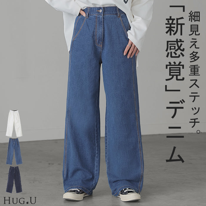 デニム 新感覚 多重ステッチ パンツ デニムパンツ レディース ハイライズ ワイドパンツ ワイド 大きいサイズ ジーンズ ジーパン 体型カバー ボトムス ストレート ズボン ゆったり ステッチ ハイウエスト 伸びる ゴム ストレッチ 美脚 白 春 夏 HUG.U
