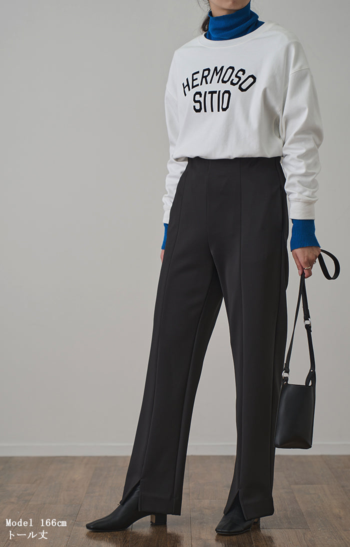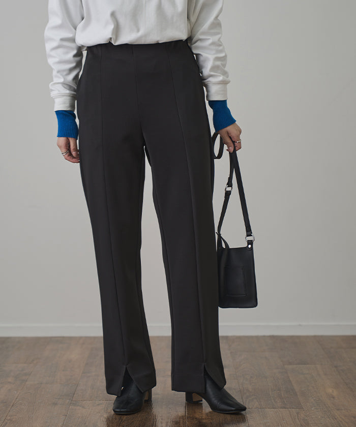 ハイウエストで美スタイルが叶うイージーパンツです。伸縮のある素材で綺麗めな見た目ながらもリラクシーな着用感です。オンオフで使いやすく幅広いシーンで活躍できるアイテムです。