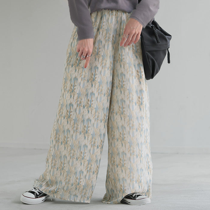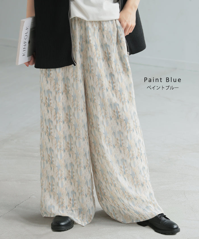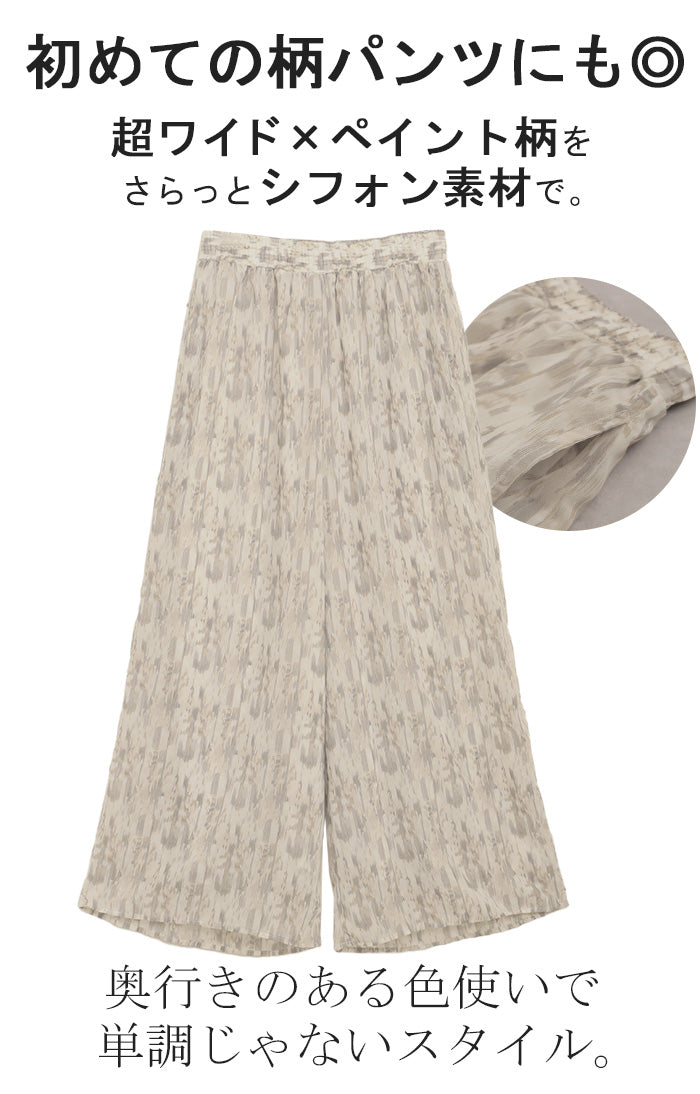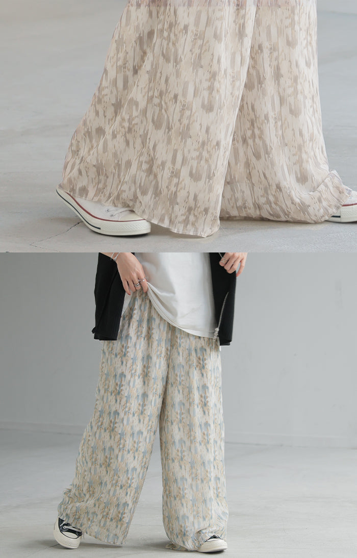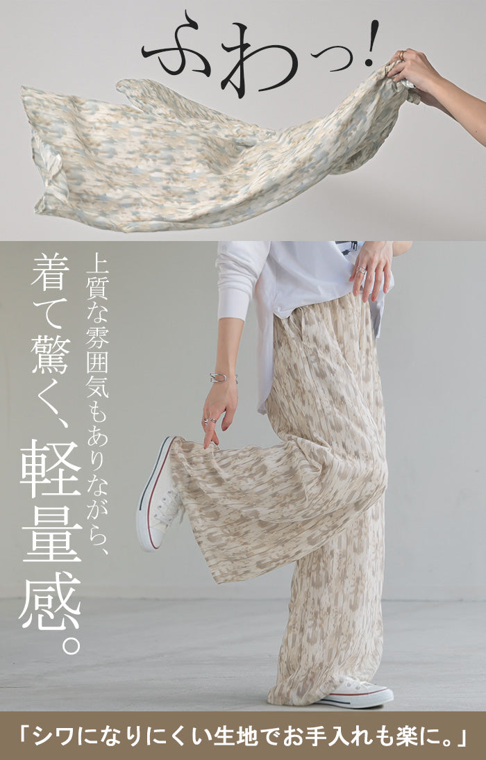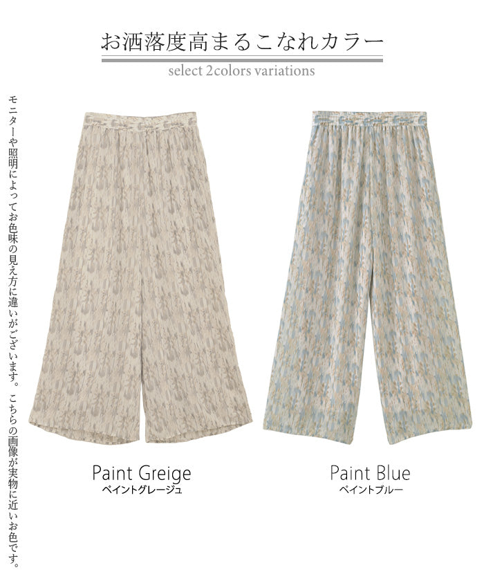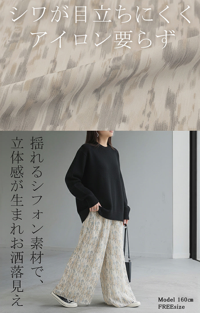 パンツ 柄 ワイド シフォン レディース 総柄 ペイント ワイドパンツ ロング ロングパンツ シフォンパンツ 体型カバー ボトムス ボトム ストレート ズボン ゆったり ハイウエスト 美脚 ゴム 大きいサイズ おしゃれ 水彩画 ブルー 青 春 夏 HUG.U