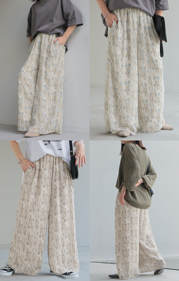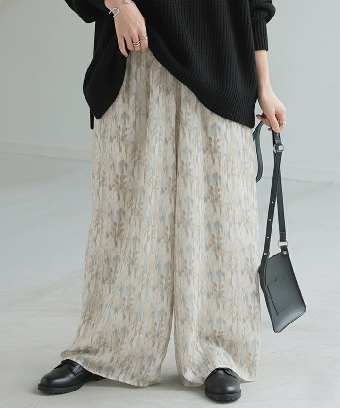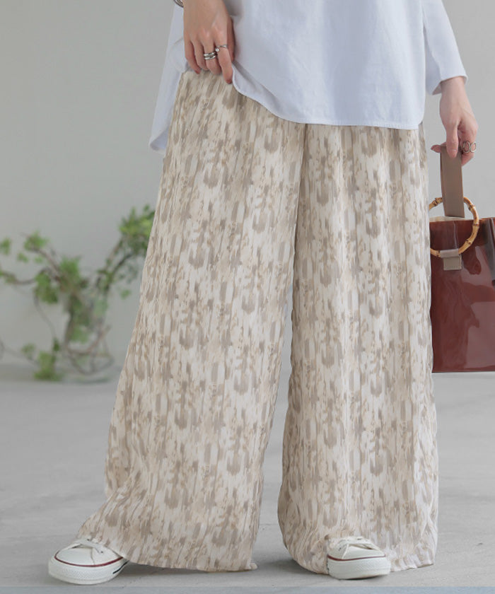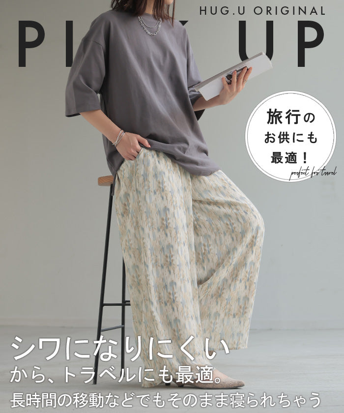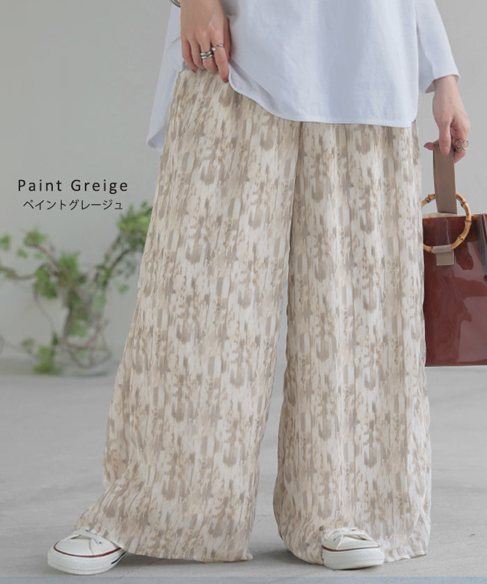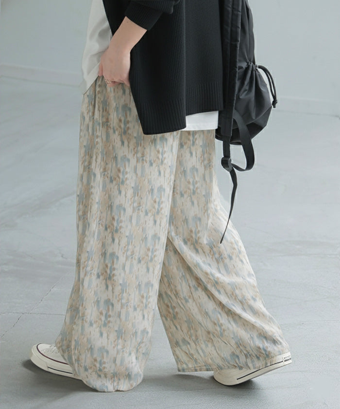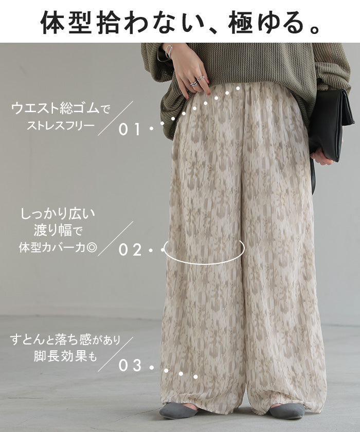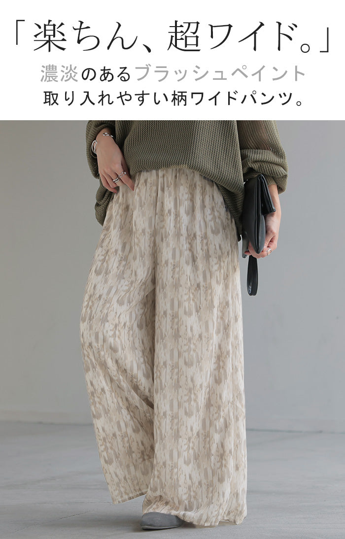 パンツ 柄 ワイド シフォン レディース 総柄 ペイント ワイドパンツ ロング ロングパンツ シフォンパンツ 体型カバー ボトムス ボトム ストレート ズボン ゆったり ハイウエスト 美脚 ゴム 大きいサイズ おしゃれ 水彩画 ブルー 青 春 夏 HUG.U