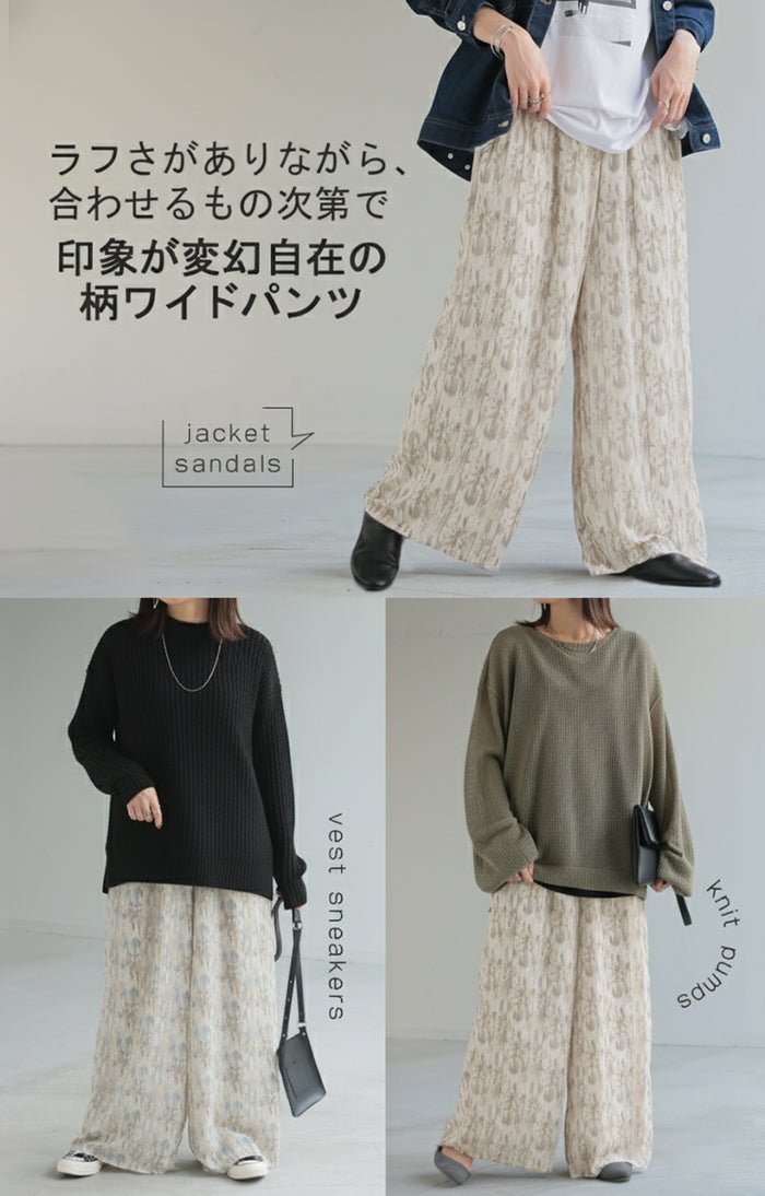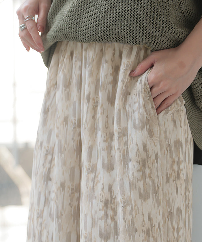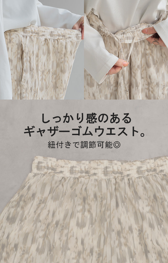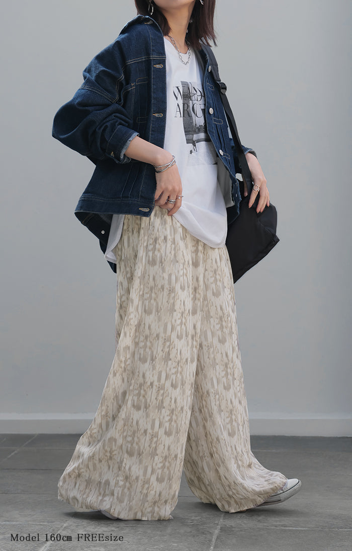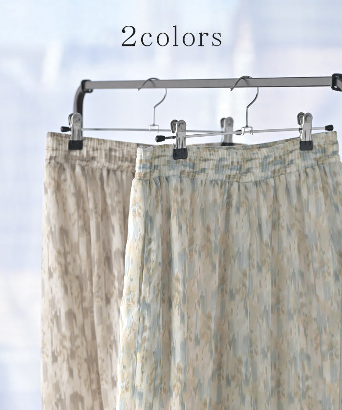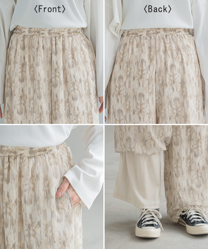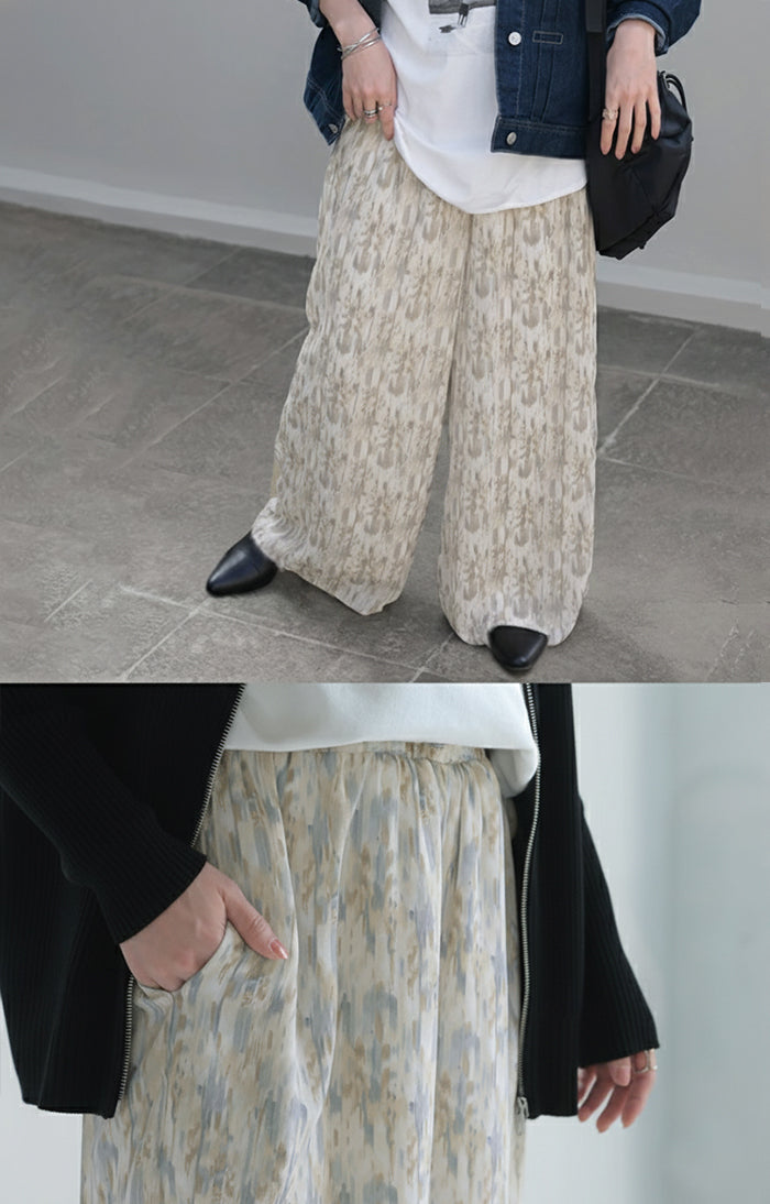 パンツ 柄 ワイド シフォン レディース 総柄 ペイント ワイドパンツ ロング ロングパンツ シフォンパンツ 体型カバー ボトムス ボトム ストレート ズボン ゆったり ハイウエスト 美脚 ゴム 大きいサイズ おしゃれ 水彩画 ブルー 青 春 夏 HUG.U