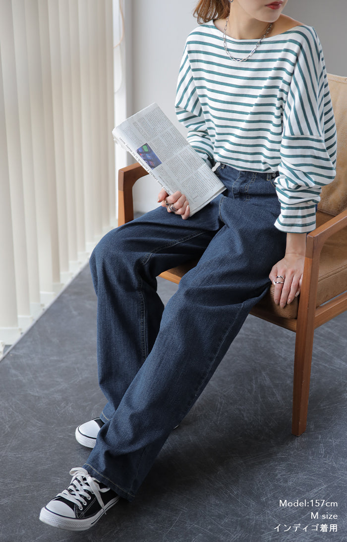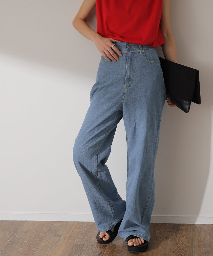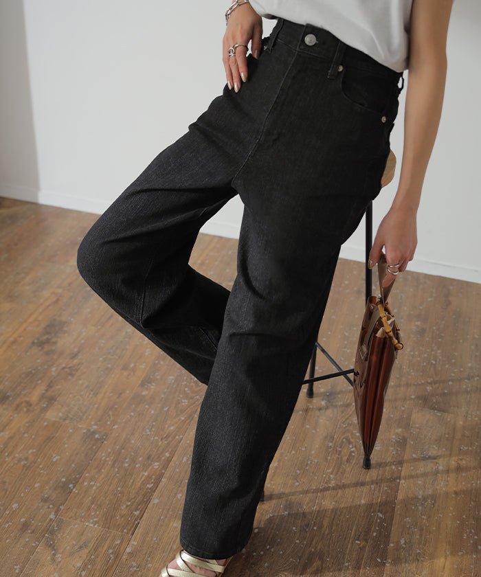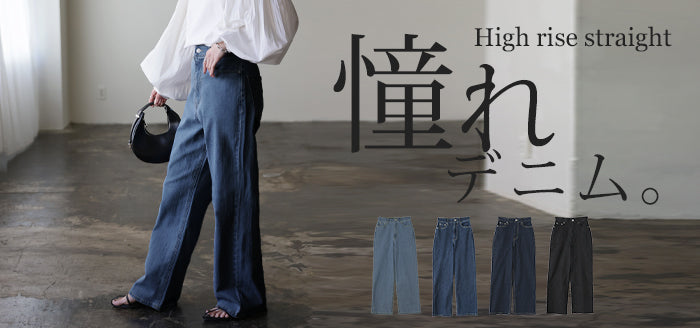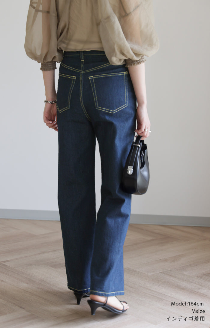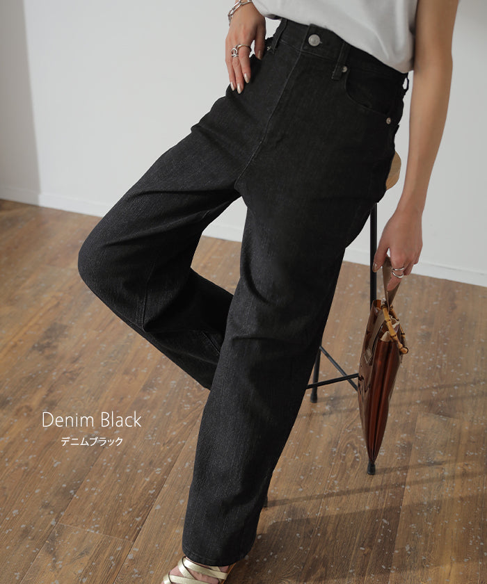 ストレートシルエットが綺麗なハイウエストデニムパンツです。すっきり見せながらもゆとりのあるシルエットが体型を拾わないのでスタイルアップ効果があります。オールシーズン使えるので1着あると重宝するアイテムです。