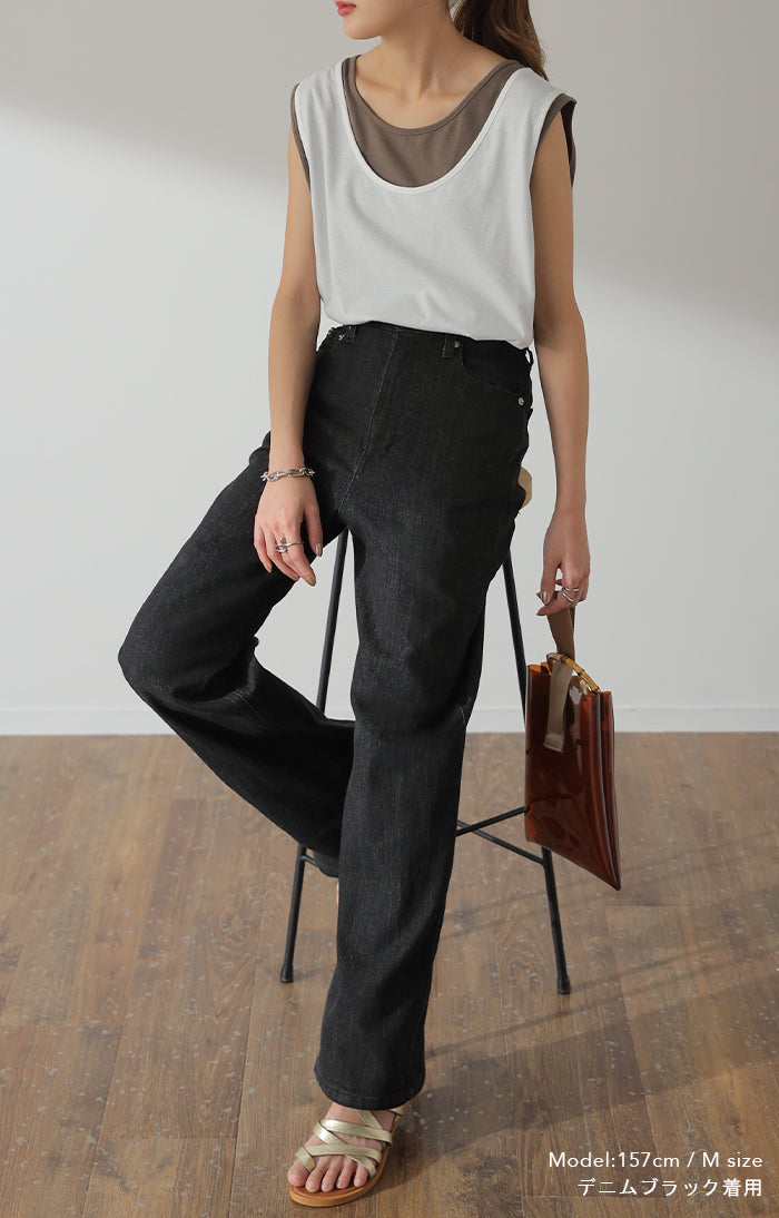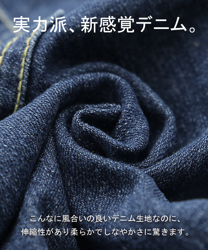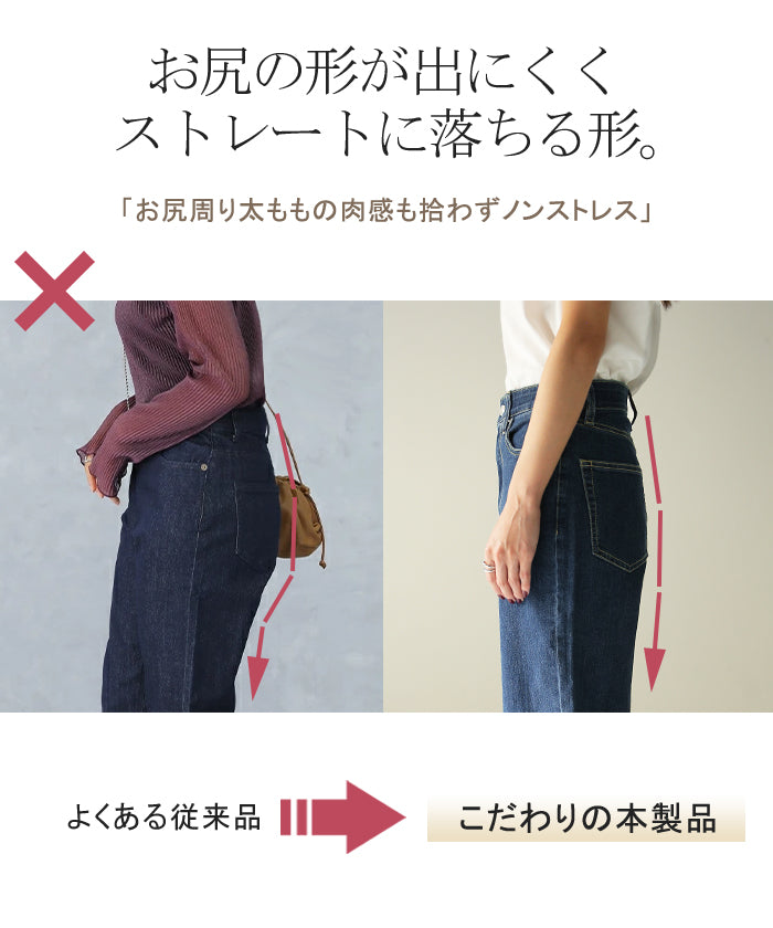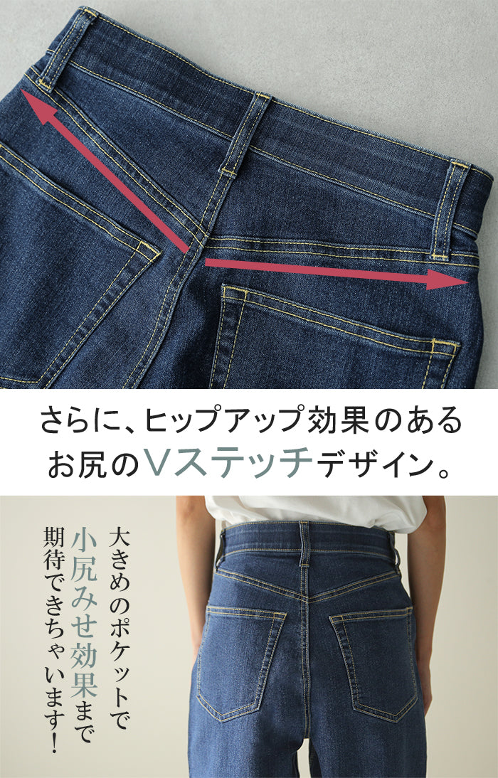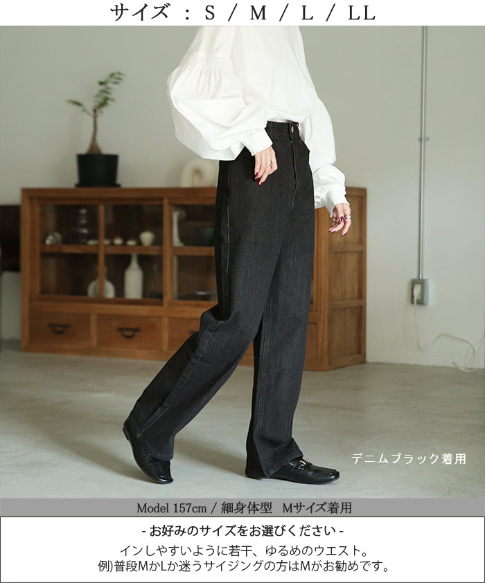 ストレートシルエットが綺麗なハイウエストデニムパンツです。すっきり見せながらもゆとりのあるシルエットが体型を拾わないのでスタイルアップ効果があります。オールシーズン使えるので1着あると重宝するアイテムです。