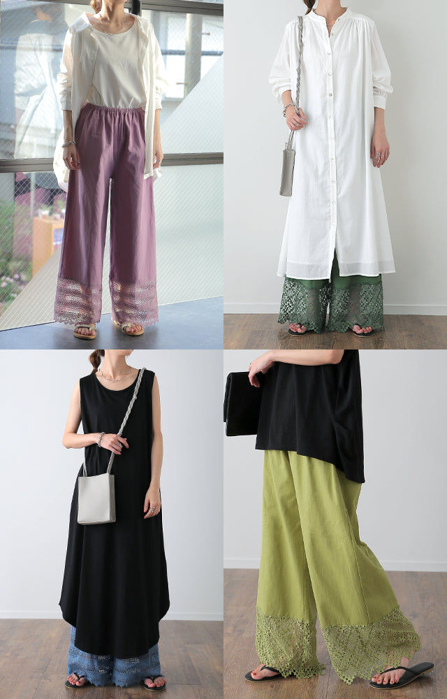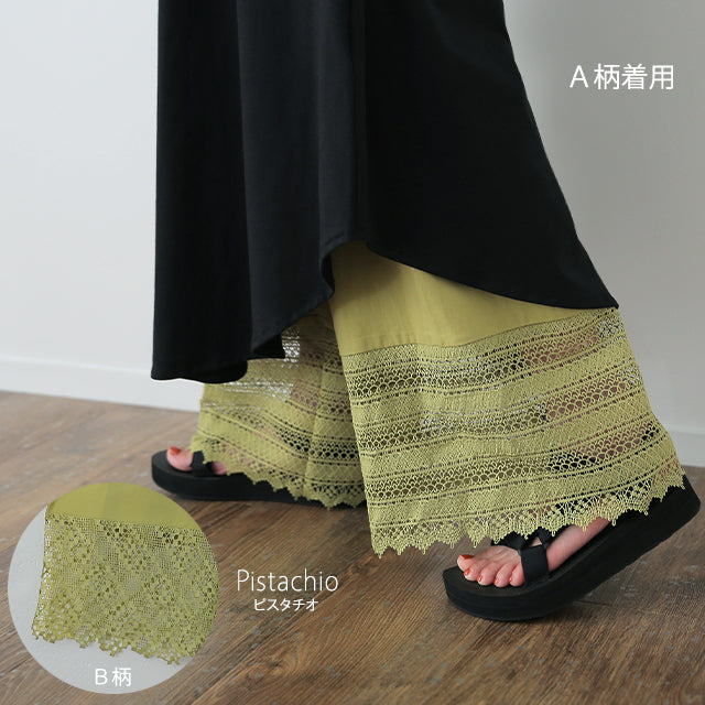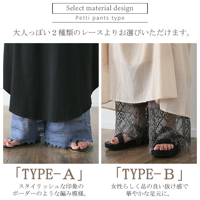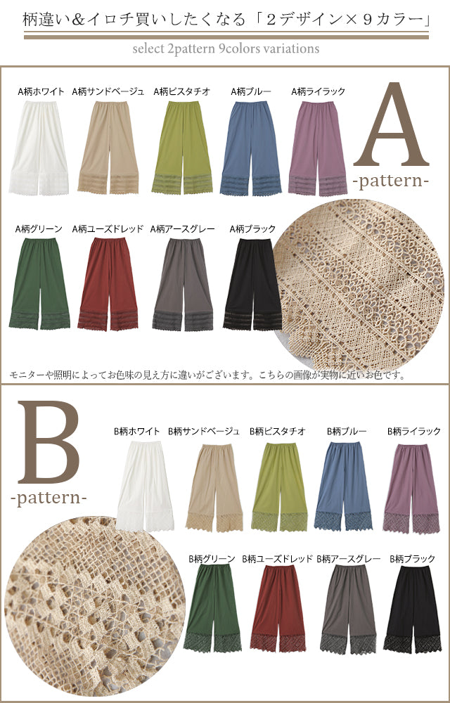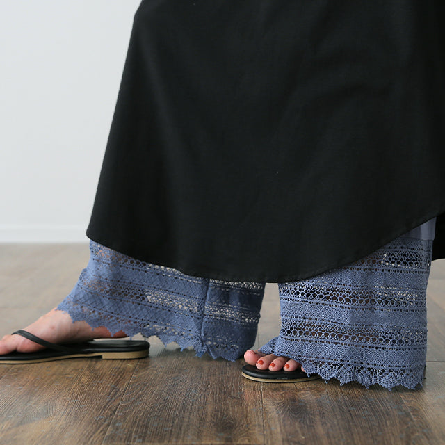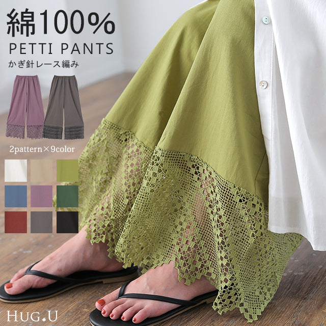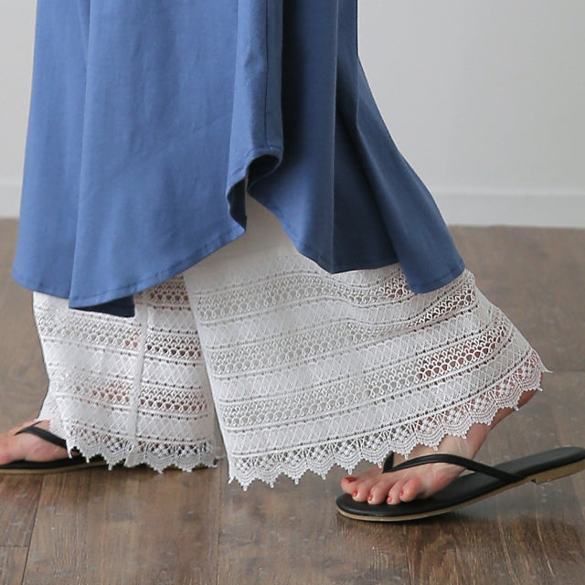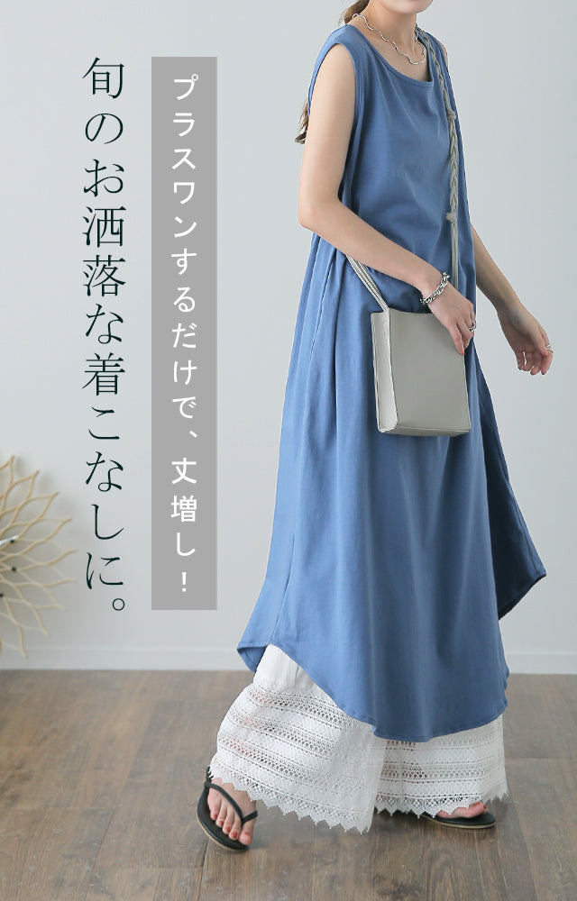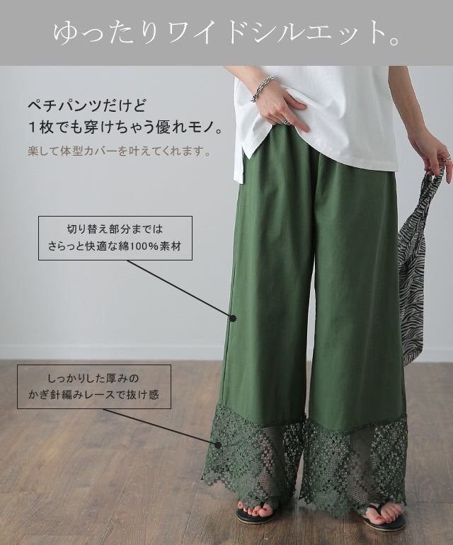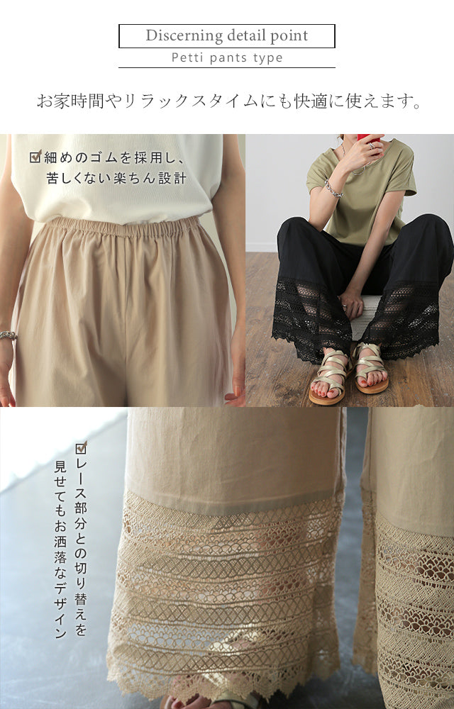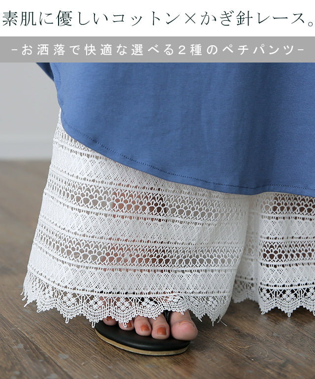 大人のレイヤードが華やぐ重ね着用ペチパンツ。 ゆったりワイドシルエットで着心地も楽々。 風を感じる裾レースで華やかにレイヤードを楽しむ1枚です。