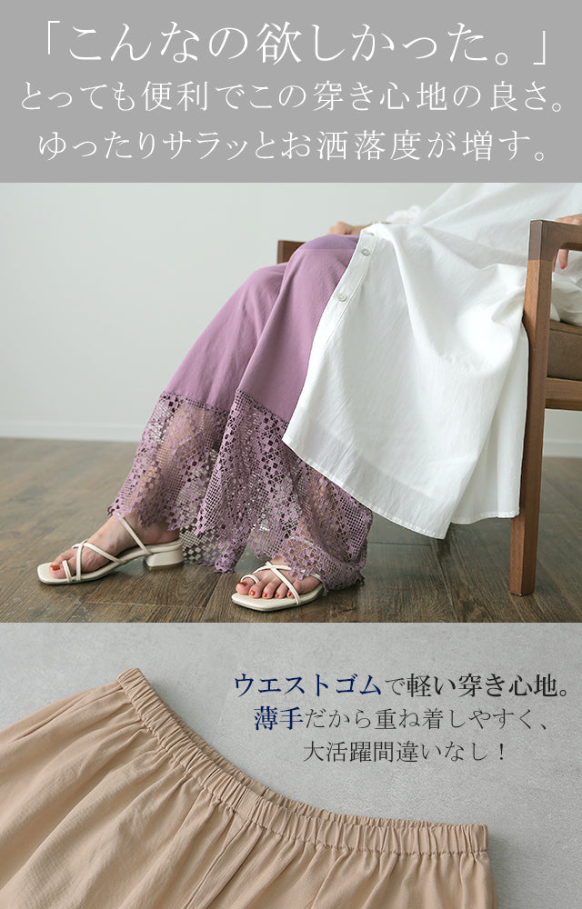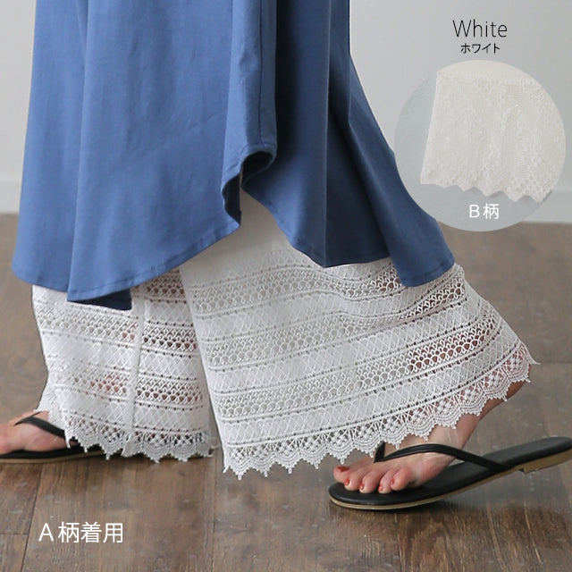 プラスワンするだけで気になる露出をオシャレに防止できます。ウエストはゴムだから苦しくなく楽ちんです。選べる9色×2種類のレースでコーデを華やかにしませんか?