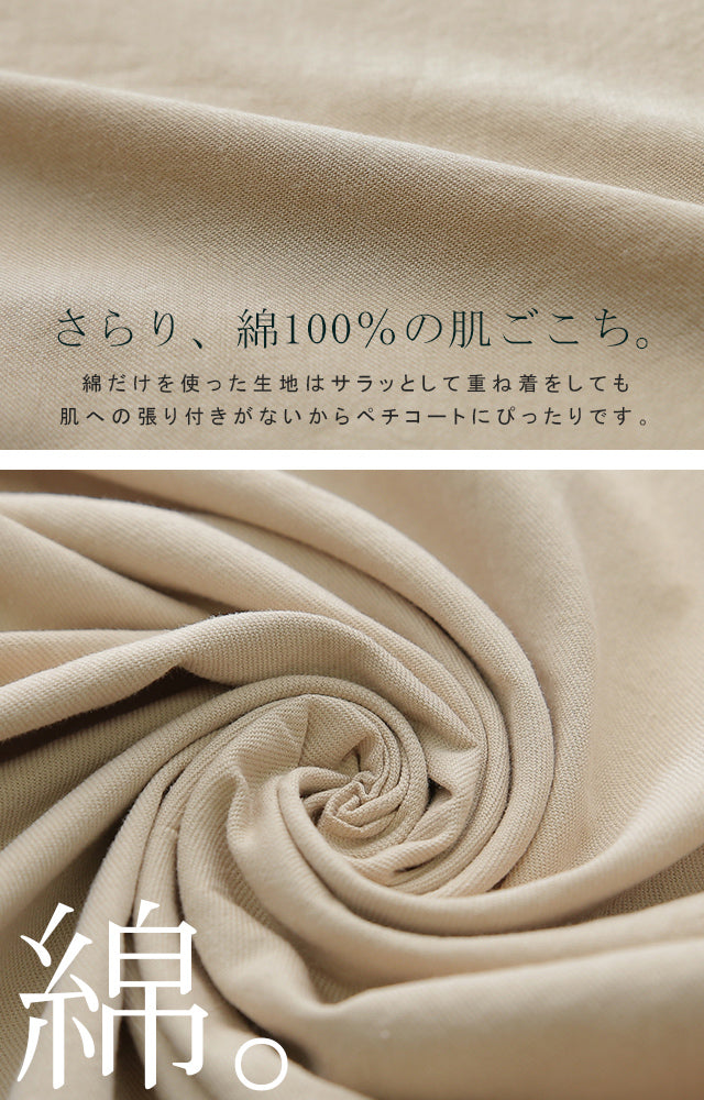 綿100%だからさらっとしていて肌に張り付かない素材を使用しています。柔らかくて優しい着心地はペチコートにピッタリです。