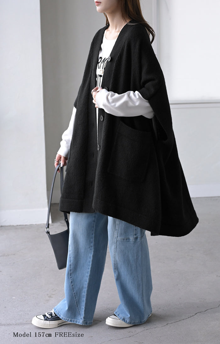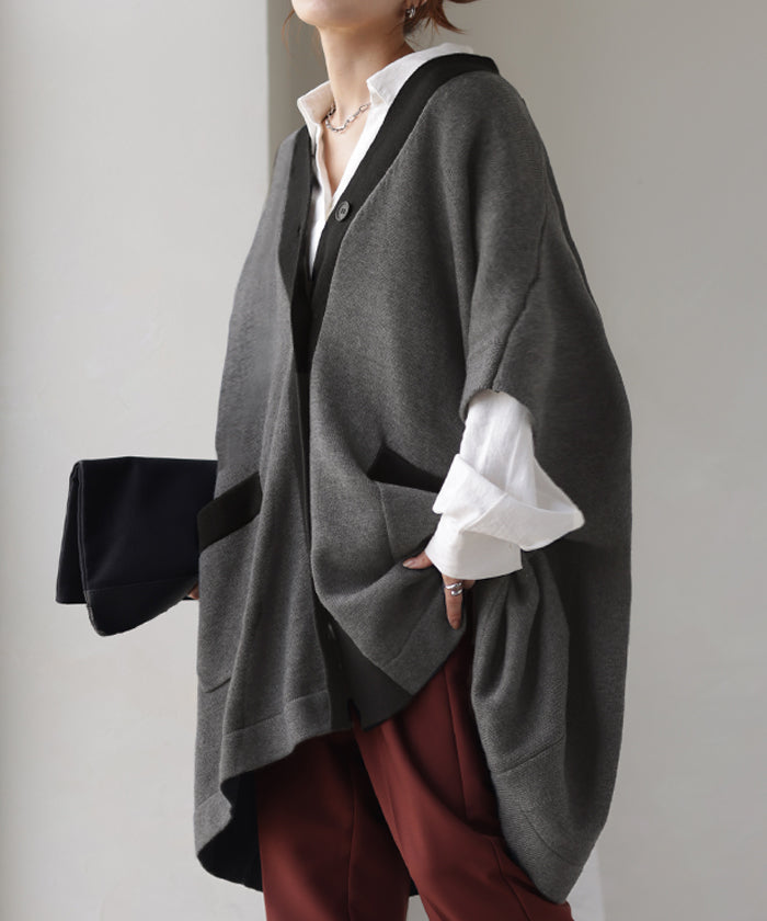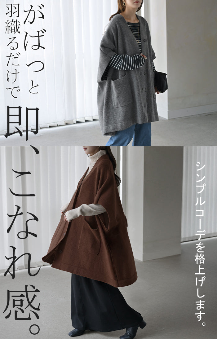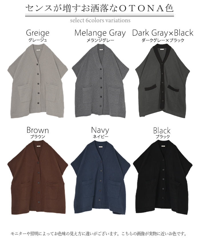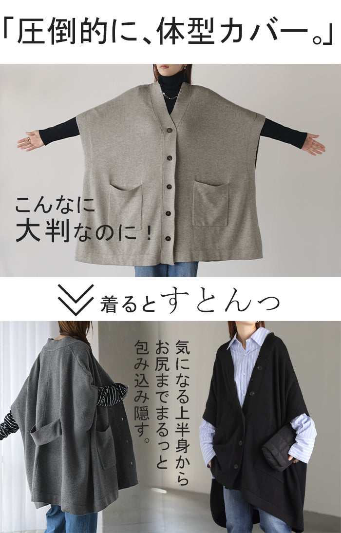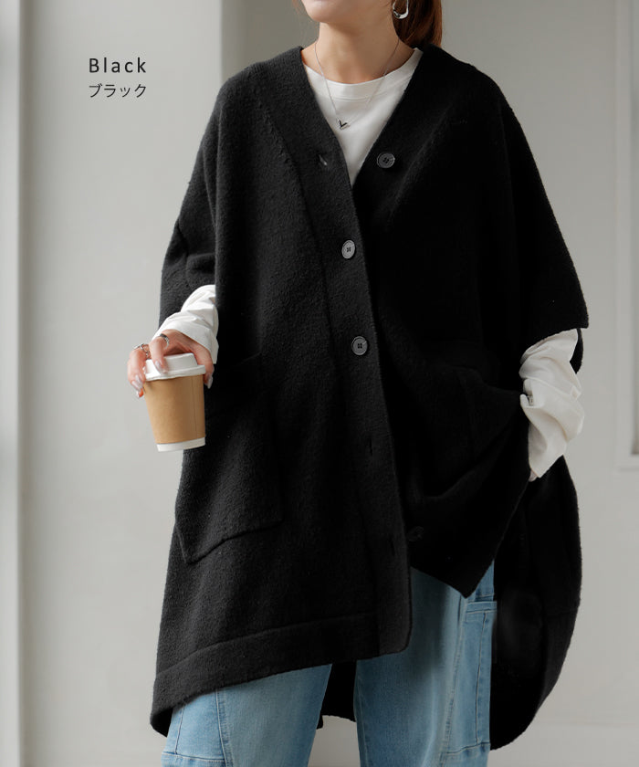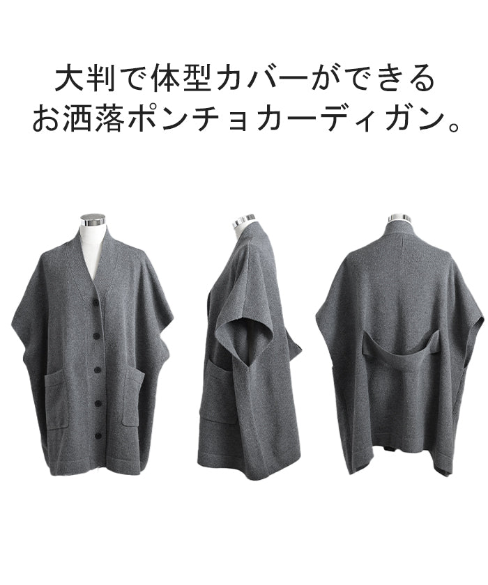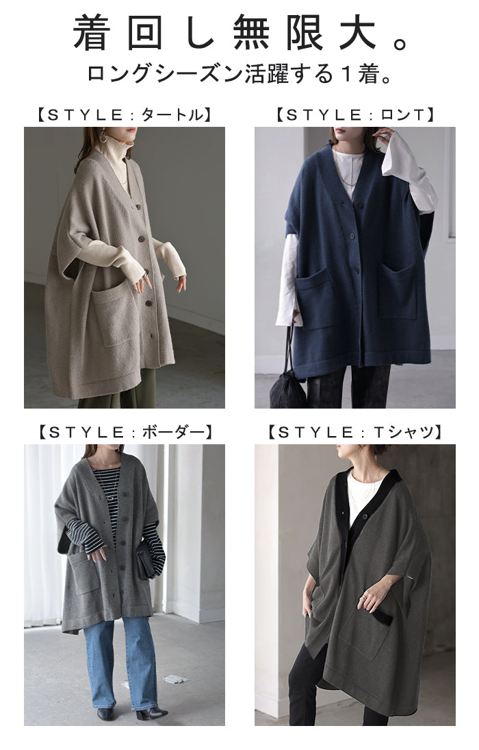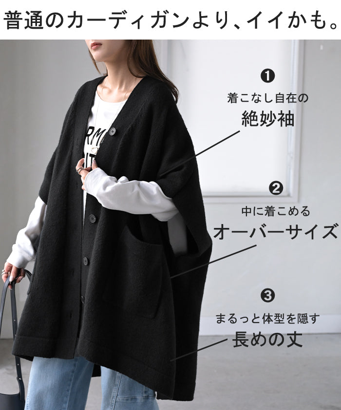 カーディガン ポンチョ ロング ■一部11月上旬入荷 レディース トップス アウター ニット ケープ Vネック レイヤード 重ね着 ロングカーディガン カーデ 半袖 お尻が隠れる 羽織 二の腕カバー オーバーサイズ オーバー 無地 体型カバー 大きいサイズ きれいめ ネイビー 黒 秋 冬 HUG.U