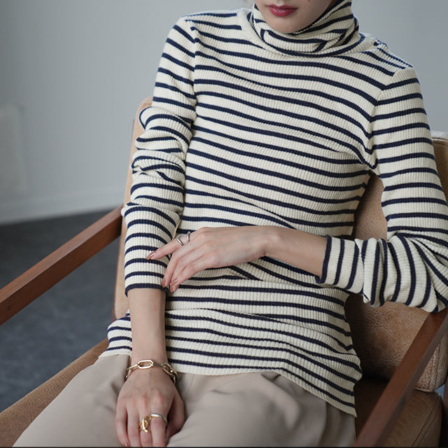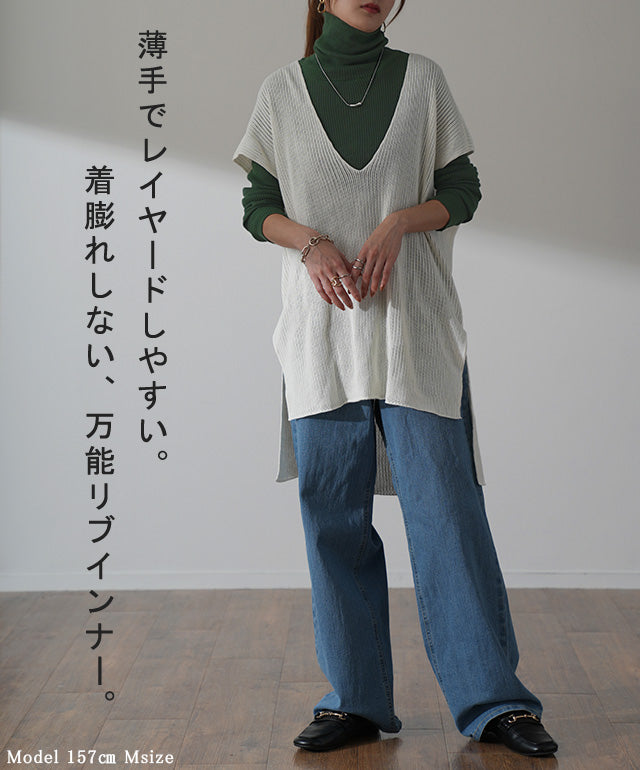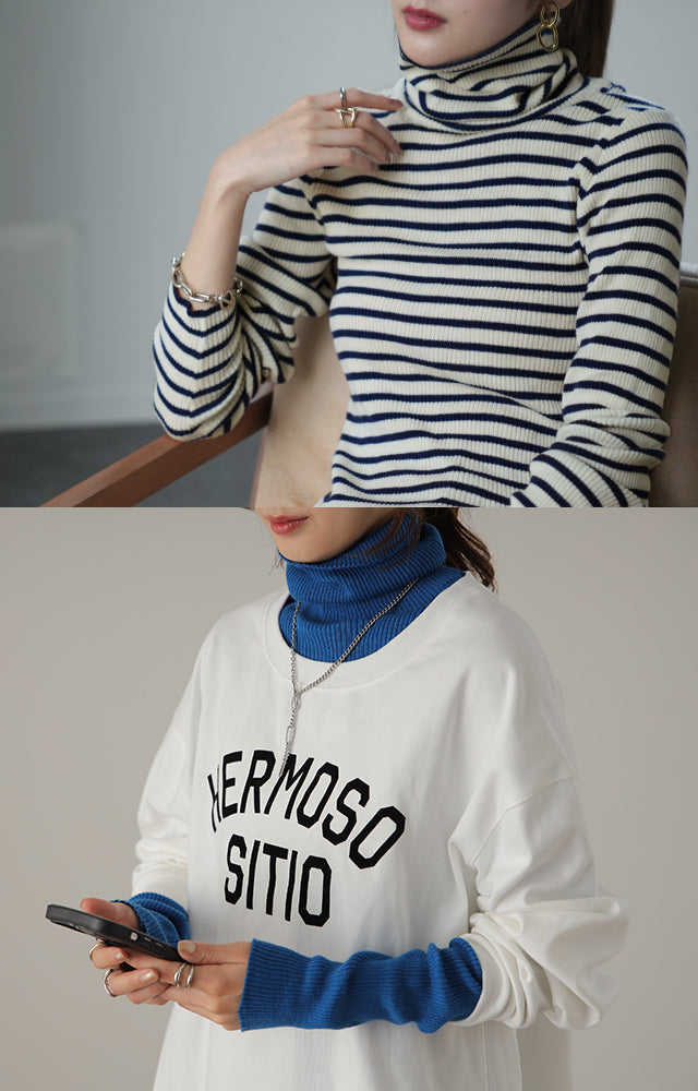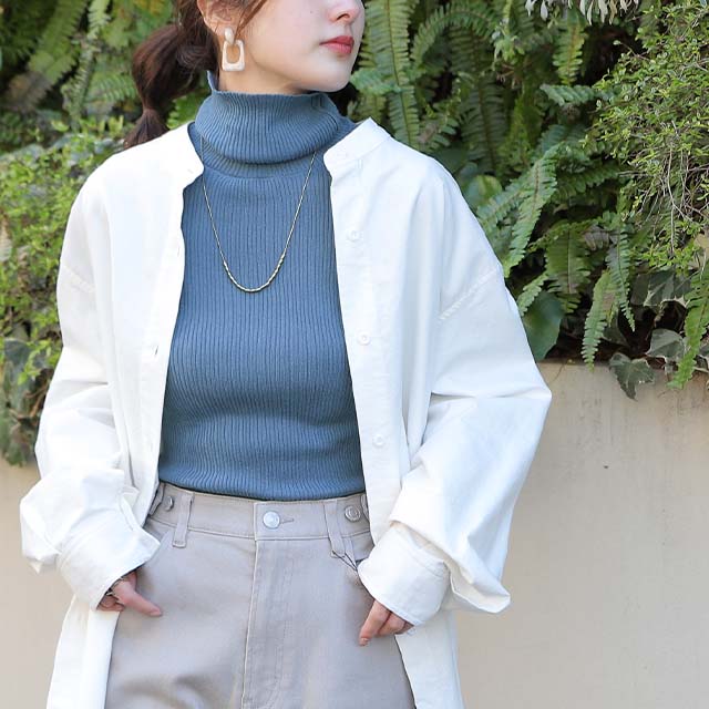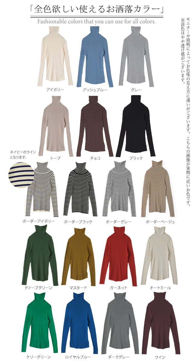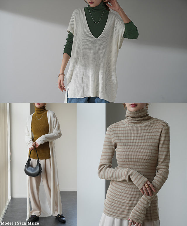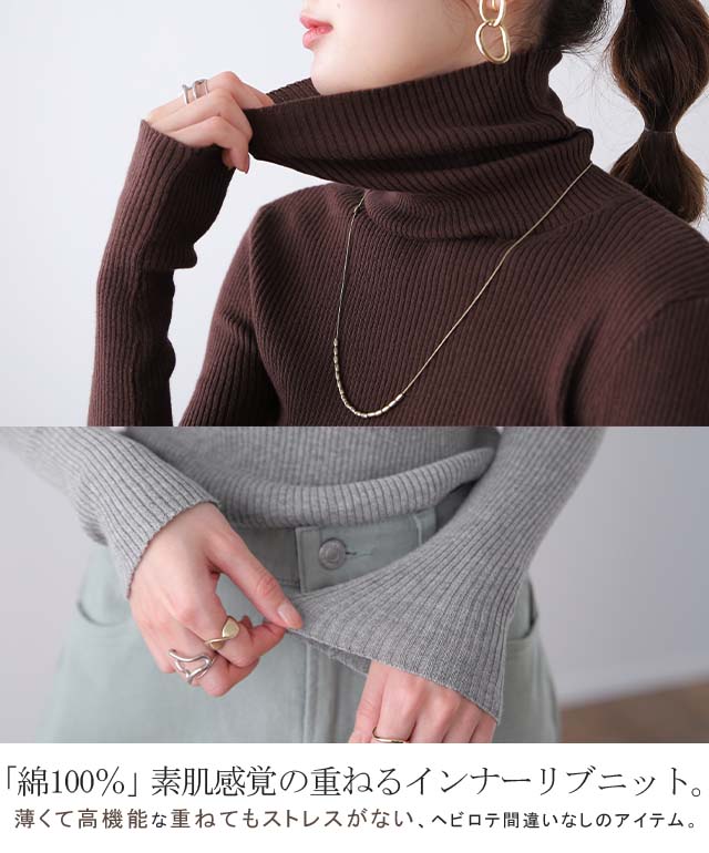 秋服コーディネートに重宝する、リブニットインナー。見た目はシンプルですが、チクチクと毛玉防止で素材はあえて綿糸を使用。 肌が弱い方にも優しいタッチに仕上がっております。綿は発色が良い素材なので、定番のカラーから少しアンニュイなカラー、ボーダー柄と様々なカラーをご用意しました。薄手ではありますが、肌との接触面が多いため保温性があり真冬にも心強いアイテムとなっております。