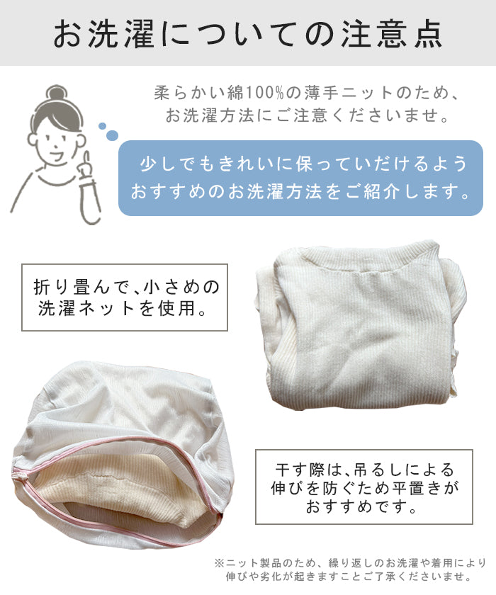 細番手の綿糸を使用し、チクチクしない比較的に毛玉も出にくい素材感を目指し制作した今作。綿のニットらしく発色がとてもきれいな為定番のカラーから少しアンニュイなカラー、ボーダー柄と様々なカラーをご用意しました。肌の接する面が多いため薄くてもしっかり暖かな点もご好評を頂いております。