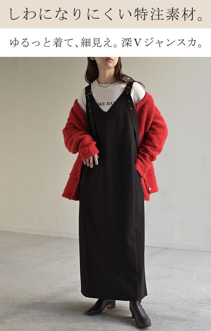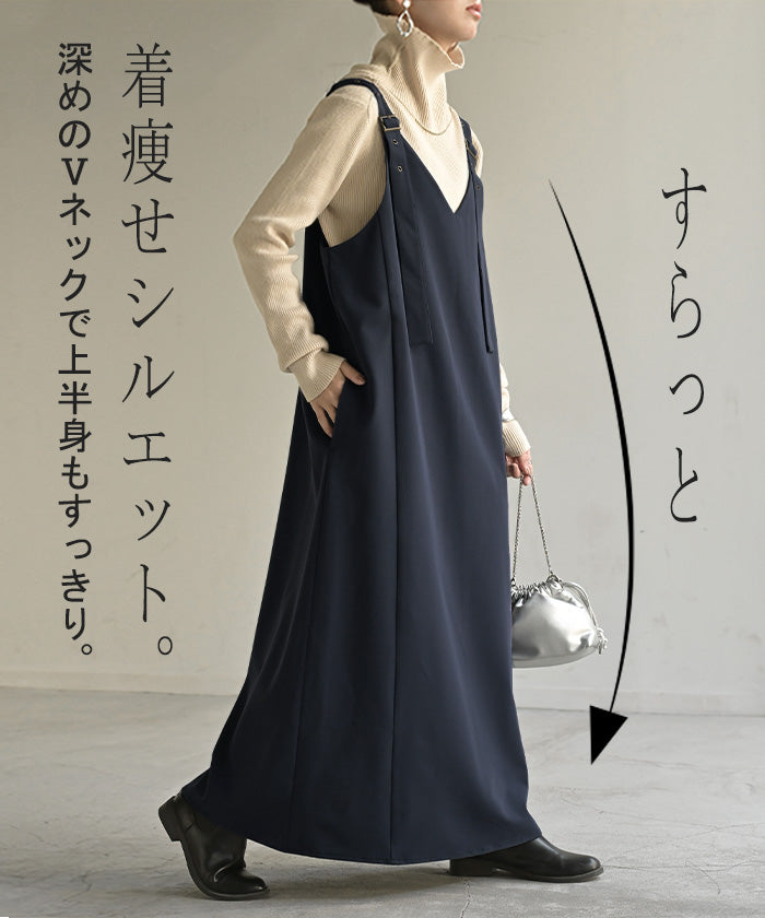 2025AW新作 ワンピース ジャンパースカート ■一部12月上旬入荷 サロペット イージーケア ウォッシャブル Aライン スカート レディース ロング ロングワンピース シワになりにくい Vネック レイヤード 調節可能 きれいめ オーバーサイズ 大きいサイズ 体型カバー 黒 ネイビー 秋 冬 HUG.U