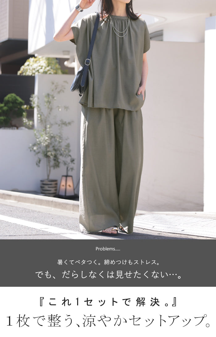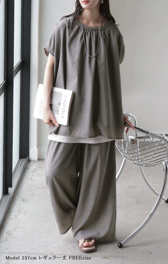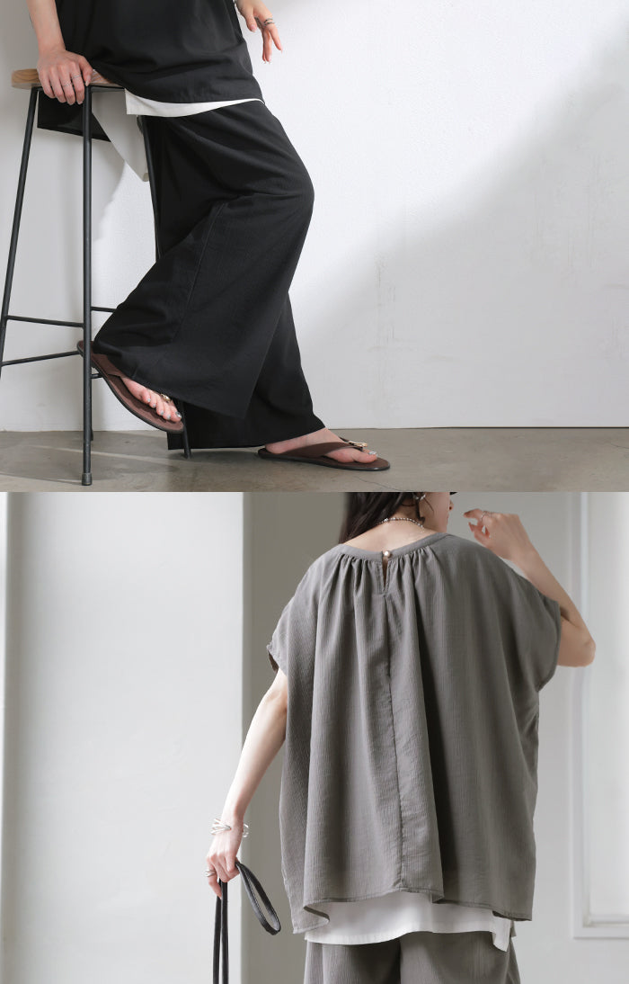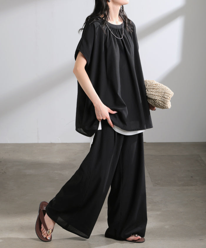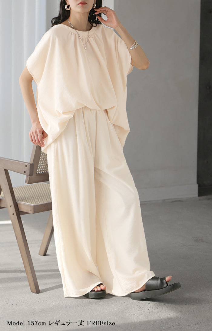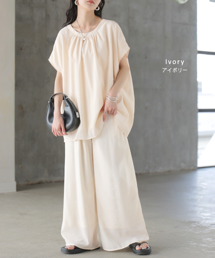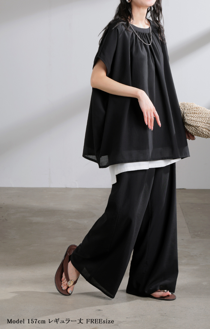 2026SS新作 セットアップ 上下セット ■一部5月中旬入荷 2点セット レディース ボトムス パンツ トップス ブラウス フレンチスリーブ ギャザー 楊柳 ジョーゼット 半袖 無地 ワイドパンツ ロング 体型カバー お尻が隠れる ゆったり 大きいサイズ カジュアル ブラック ホワイト 春 夏 HUG.U