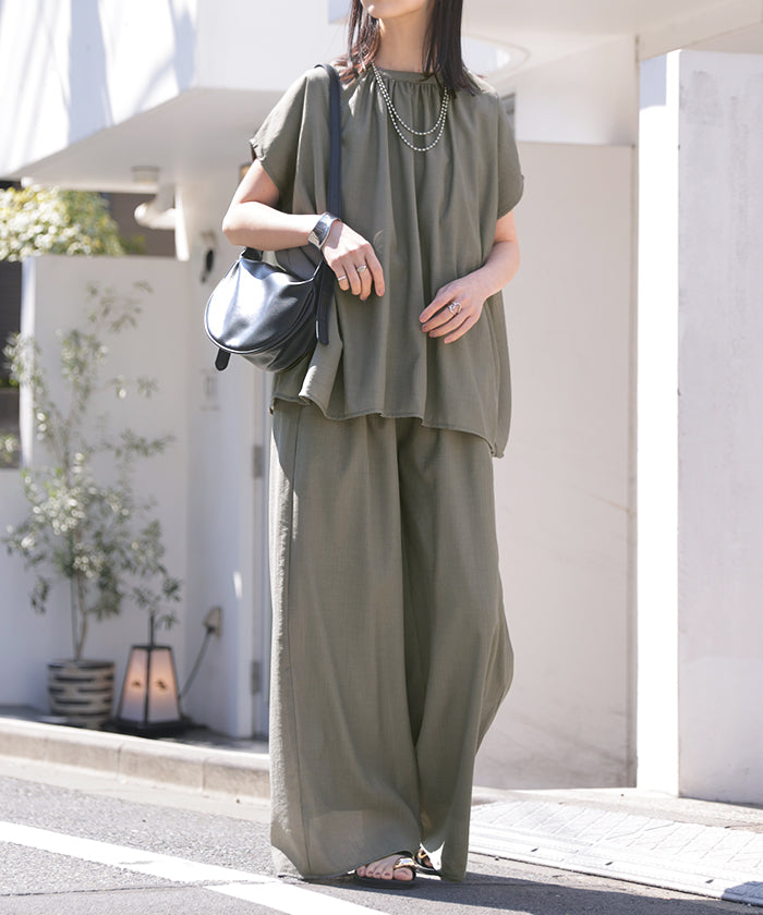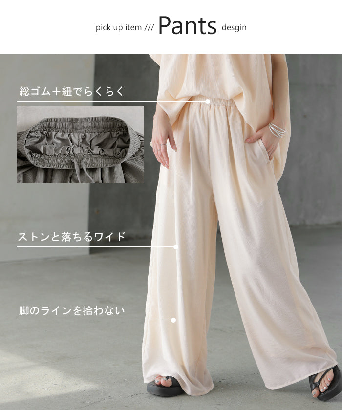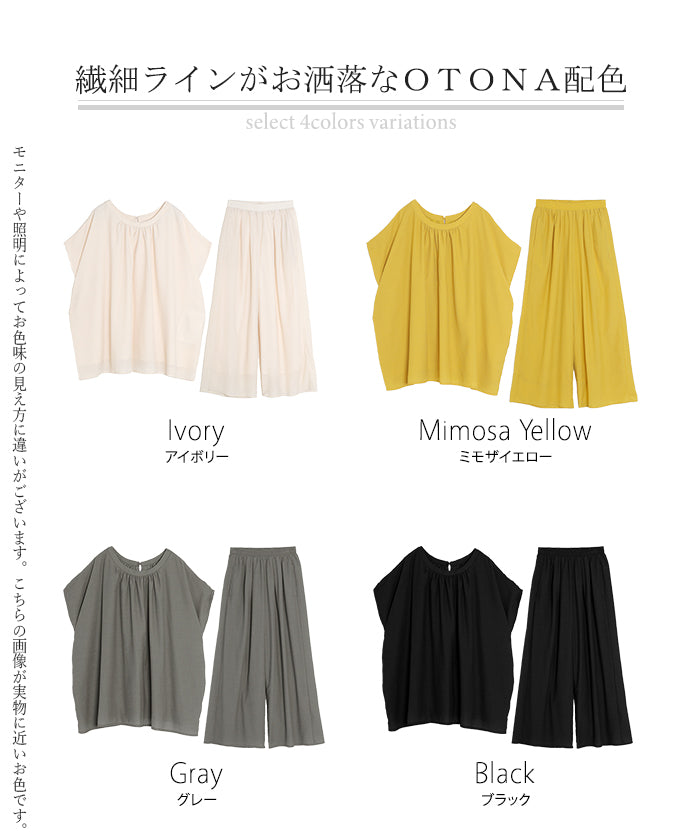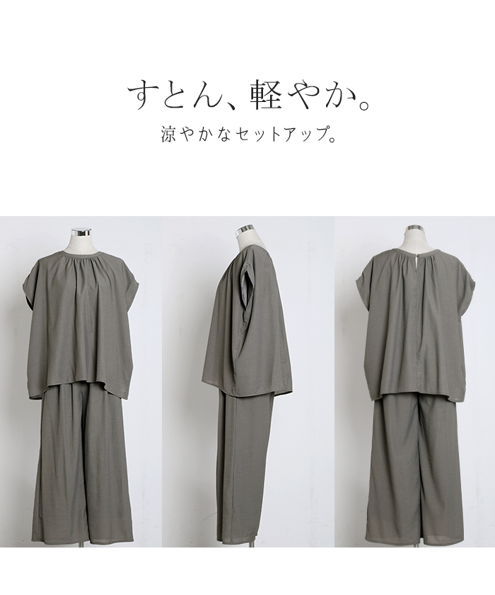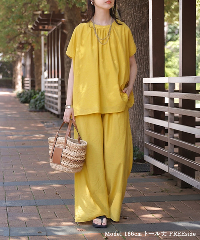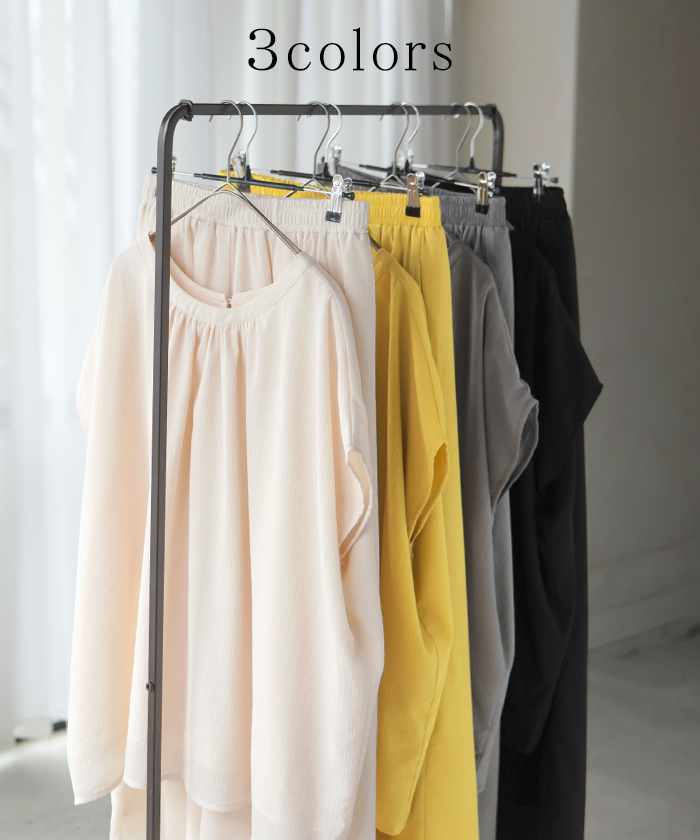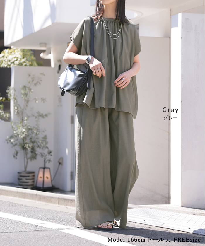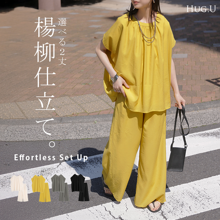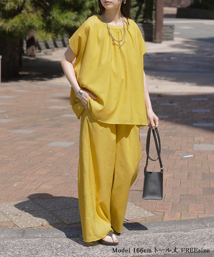 2026SS新作 セットアップ 上下セット ■一部5月中旬入荷 2点セット レディース ボトムス パンツ トップス ブラウス フレンチスリーブ ギャザー 楊柳 ジョーゼット 半袖 無地 ワイドパンツ ロング 体型カバー お尻が隠れる ゆったり 大きいサイズ カジュアル ブラック ホワイト 春 夏 HUG.U