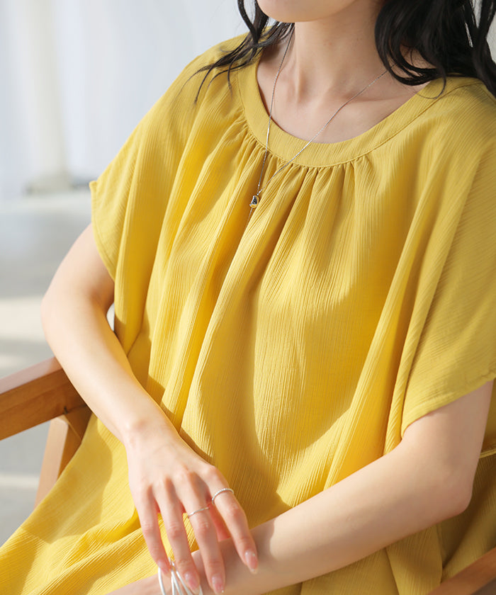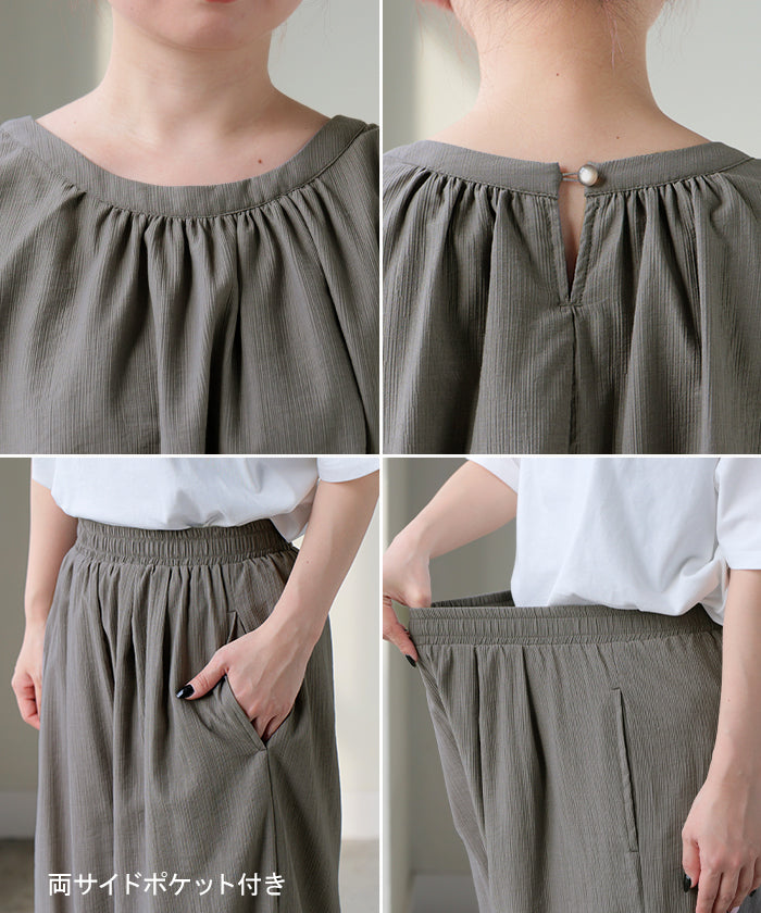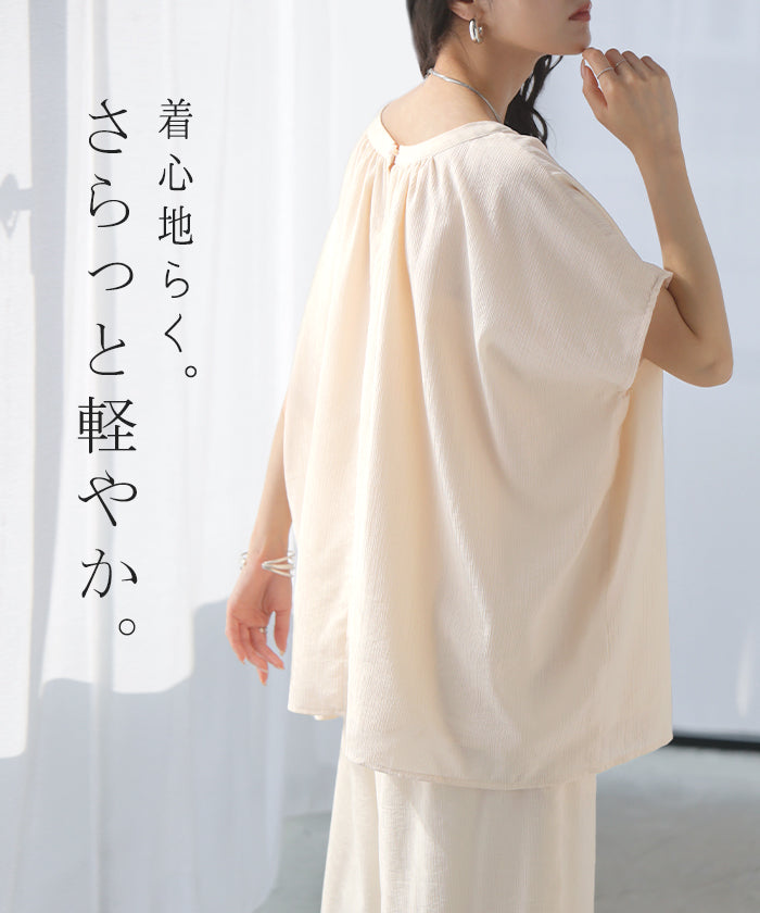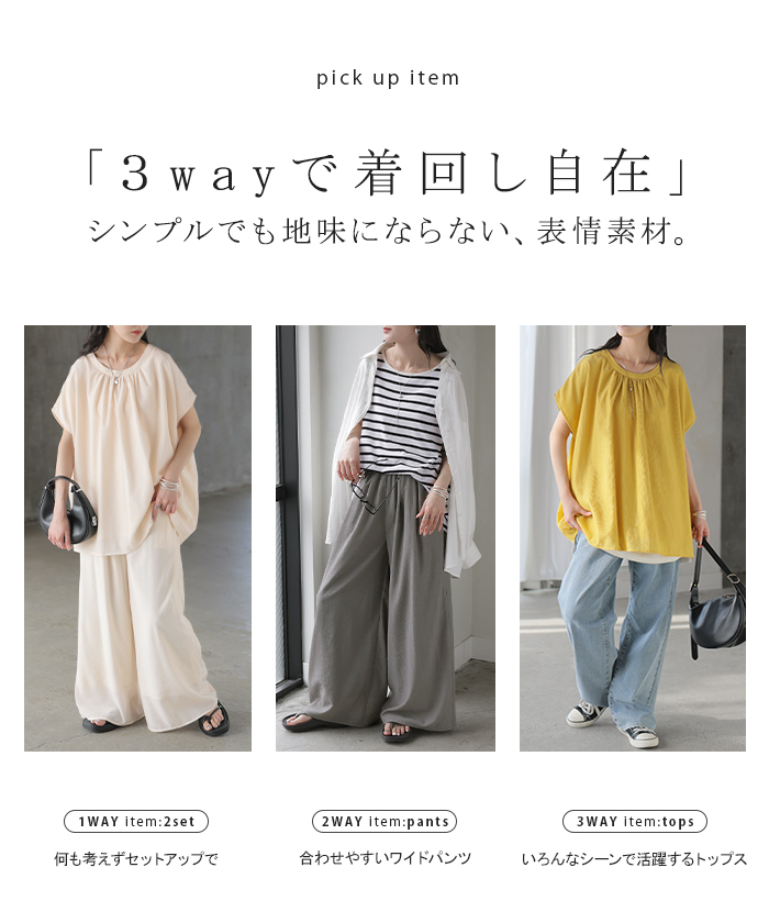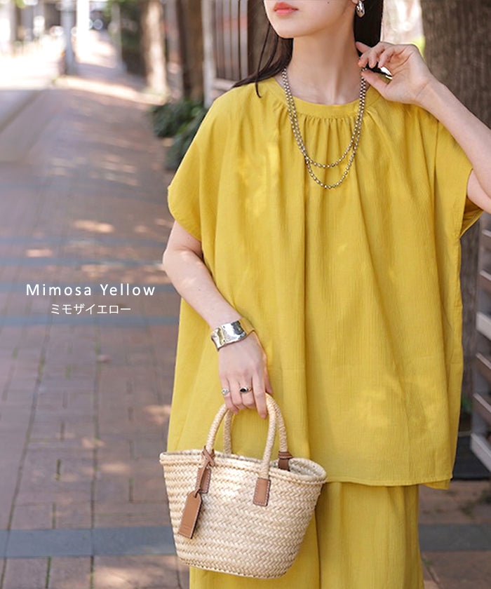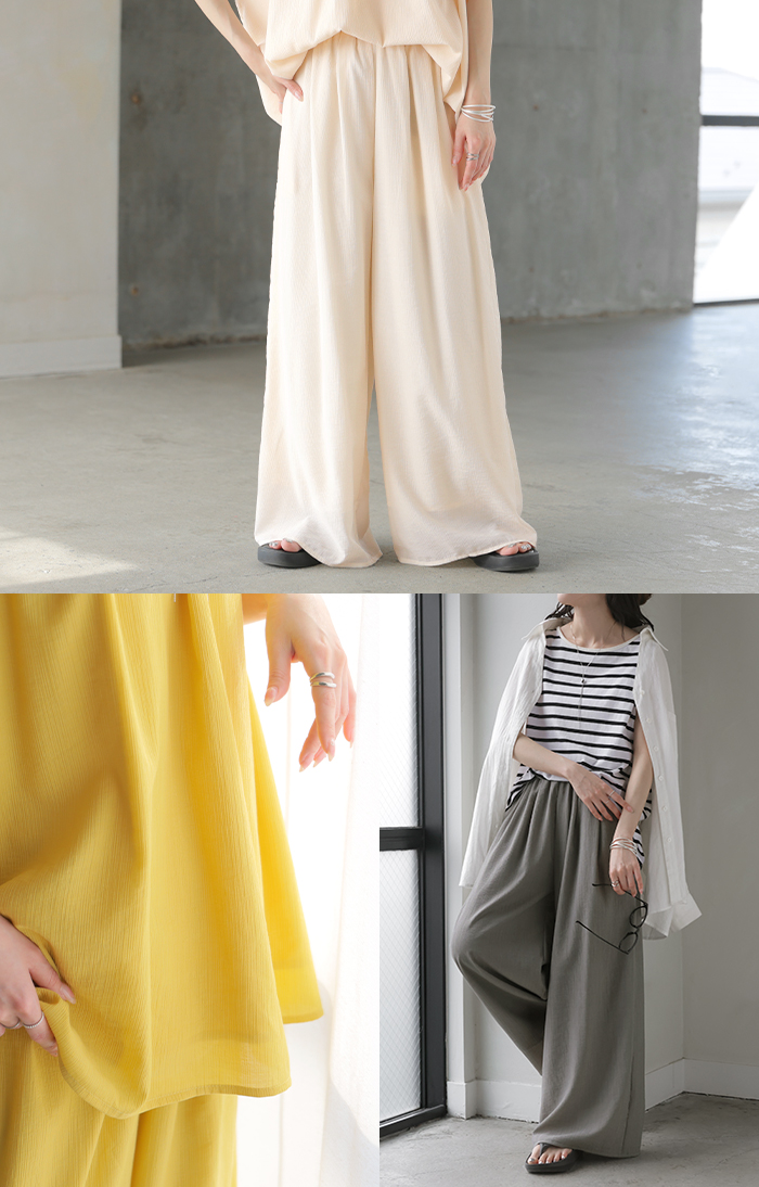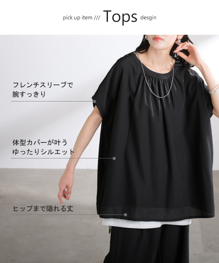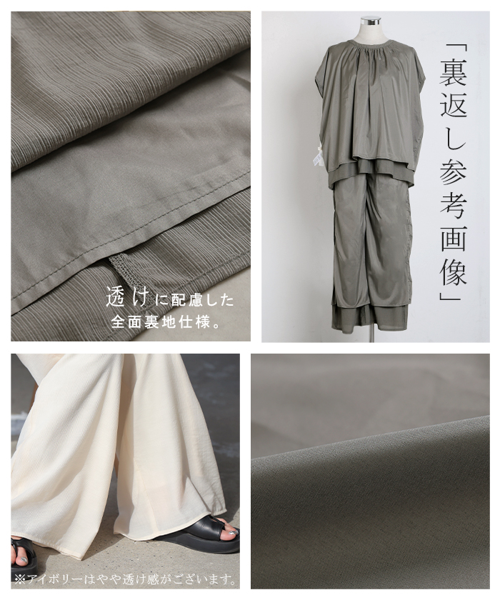 2026SS新作 セットアップ 上下セット ■一部5月中旬入荷 2点セット レディース ボトムス パンツ トップス ブラウス フレンチスリーブ ギャザー 楊柳 ジョーゼット 半袖 無地 ワイドパンツ ロング 体型カバー お尻が隠れる ゆったり 大きいサイズ カジュアル ブラック ホワイト 春 夏 HUG.U