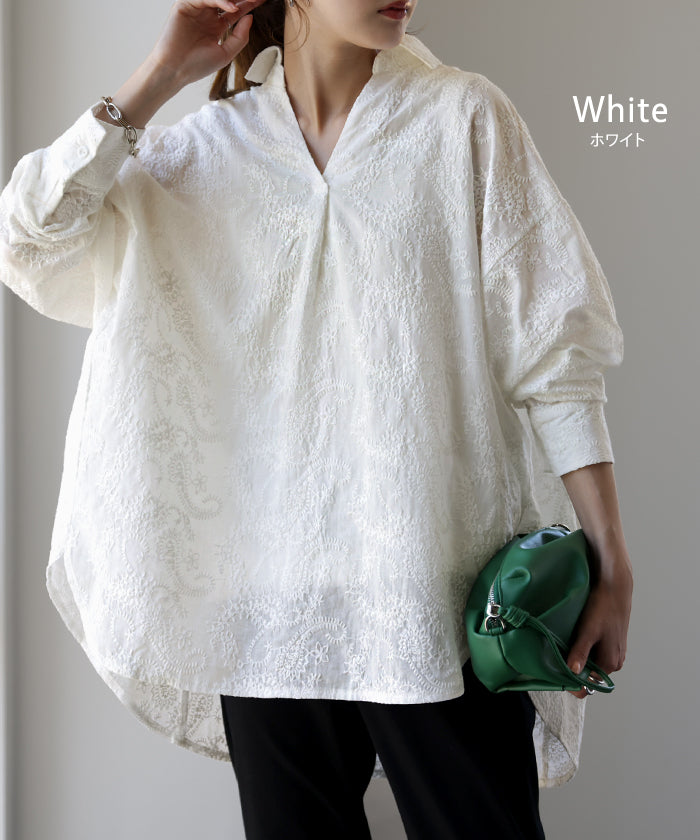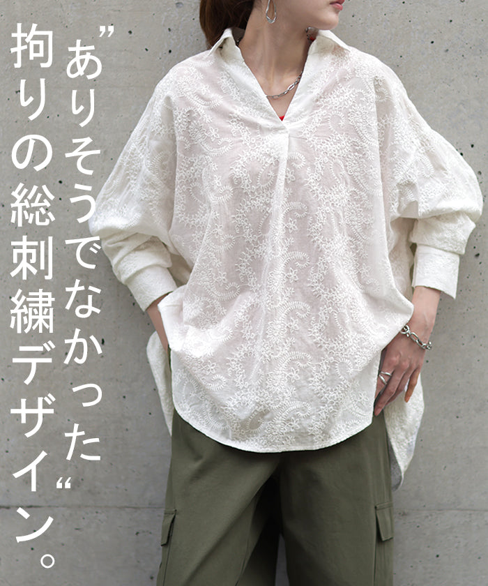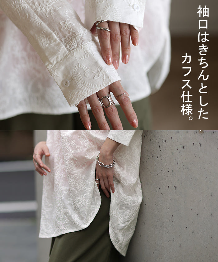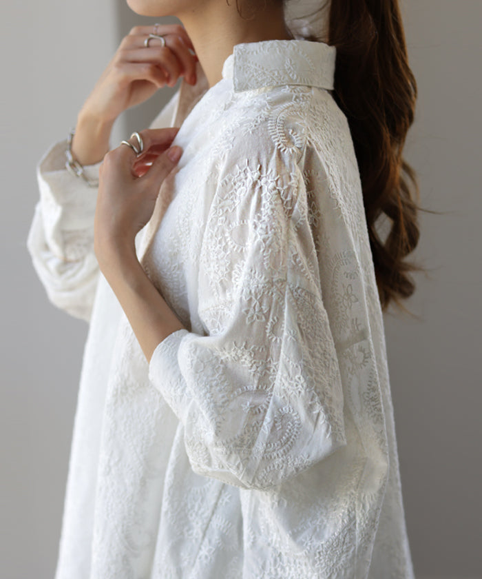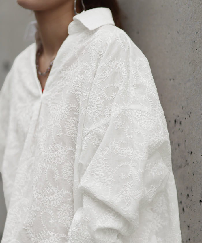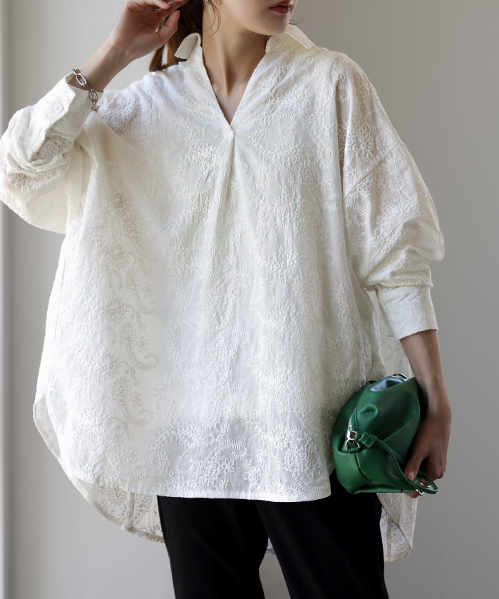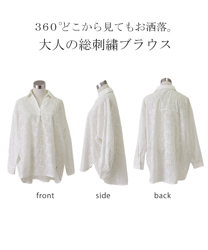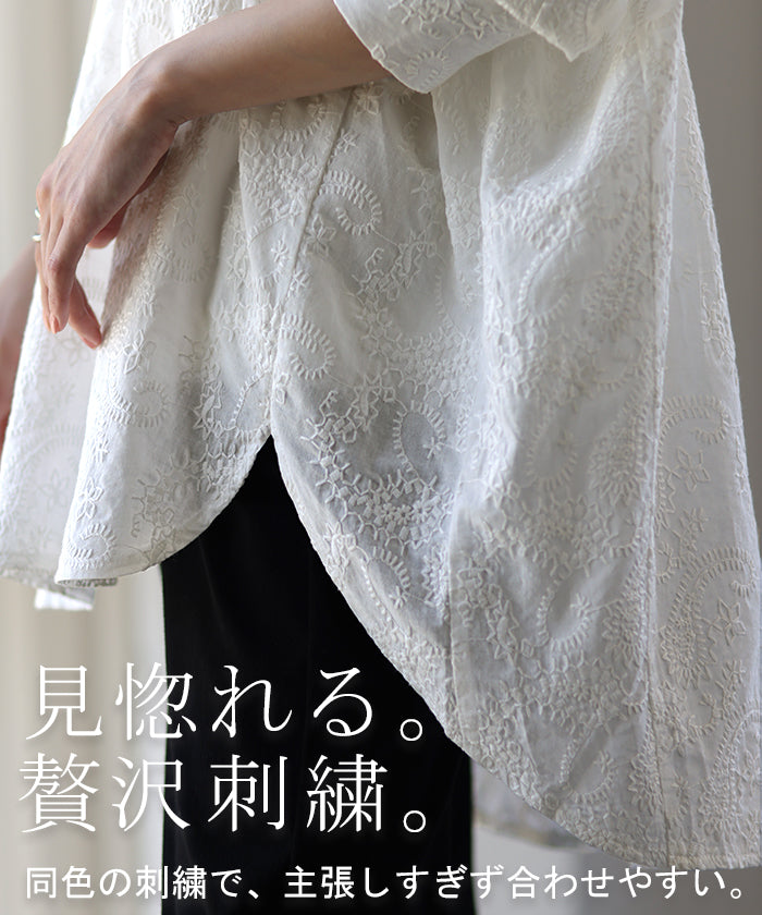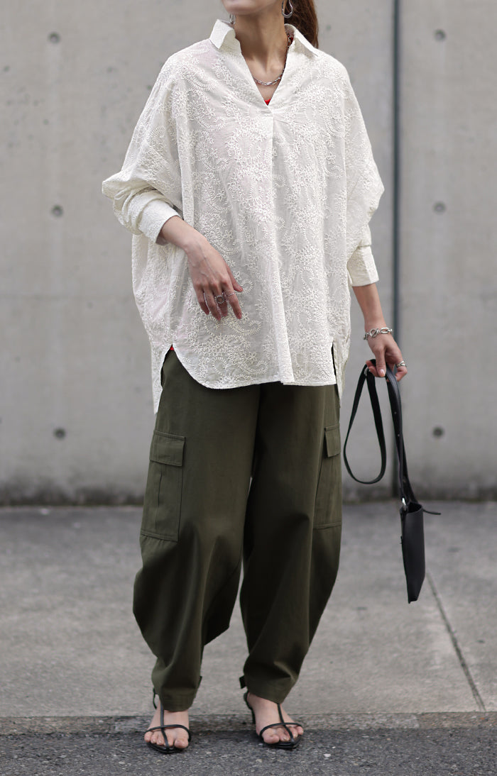 高級感のある刺繍を贅沢に施したプルオーバーブラウスです。トレンドのシアー素材もひと手間加えた刺繍で周りと差のつくスタイリングに。デザイン性がありながらもワントーンなので、柄物ボトムとも合わせるのもお勧めです。■モデル着用アイテム ⇒ パンツ■モデル着用アイテム ⇒ パンツ■モデル着用アイテム ⇒ インナー / パンツ■モデル着用アイテム ⇒ ブレスレット / リング■モデル着用アイテム ⇒ パンツ■モデル着用アイテム ⇒ パンツ※モデル着用商品は在庫切れ・販売終了・リンク切れの場合がございます。
