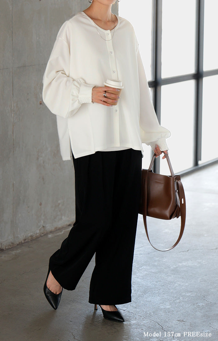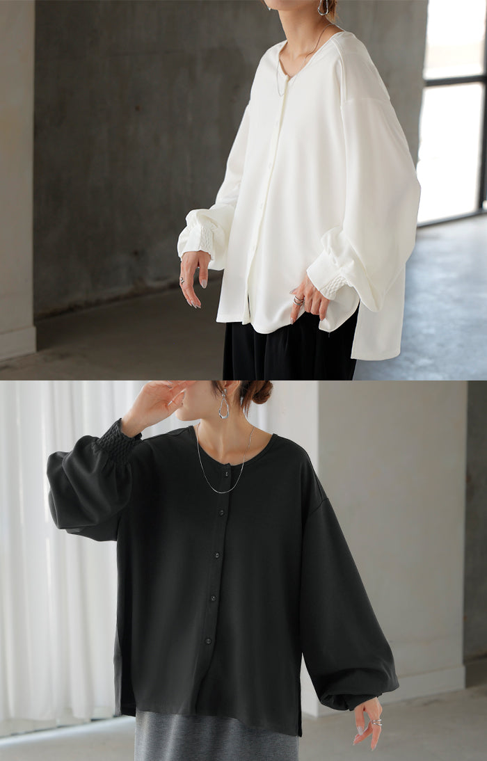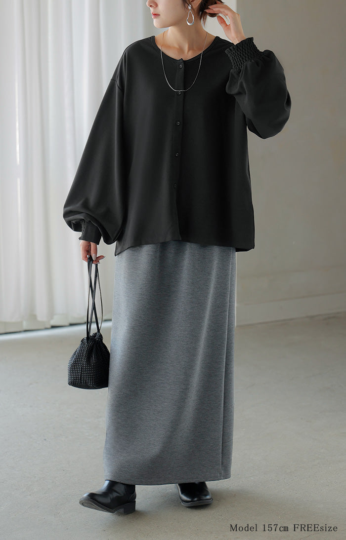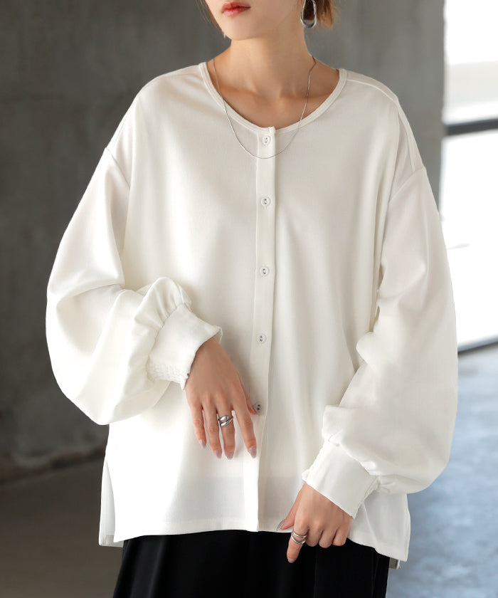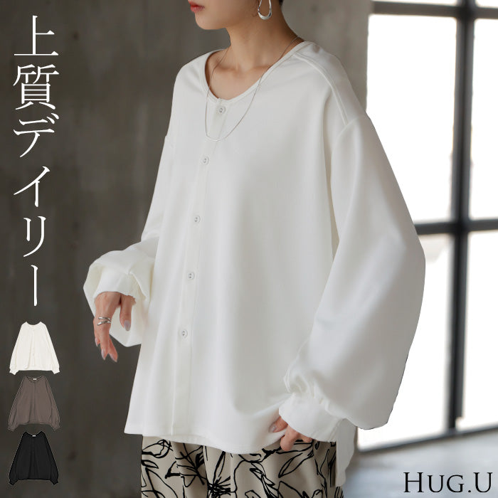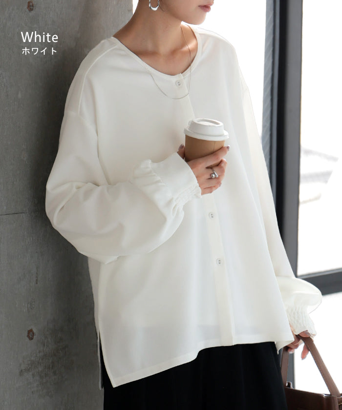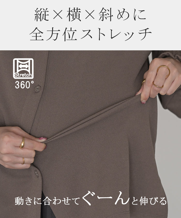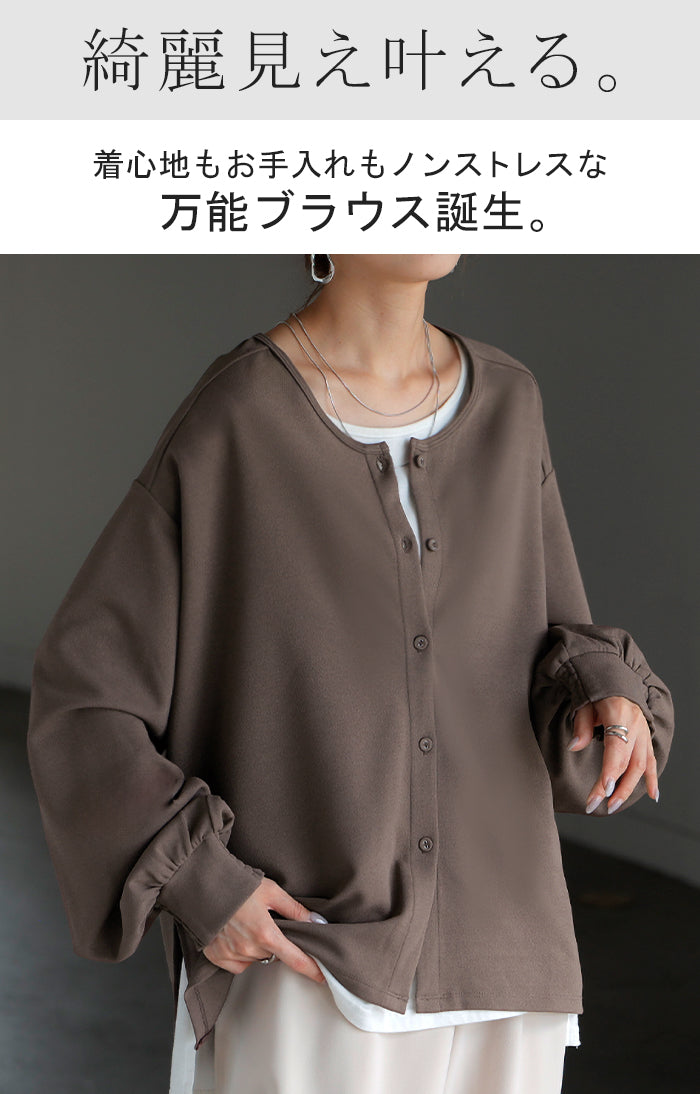 2025AW新作 ブラウス ノーカラー トップス レディース ロング バンドカラー シャツ クルーネック チュニック 長袖 無地 ボリュームスリーブ ストレッチ シワになりにくい きれいめ ゆったり オフィスカジュアル 大きいサイズ 体型カバー お尻が隠れる 黒 白 秋 冬 HUG.U