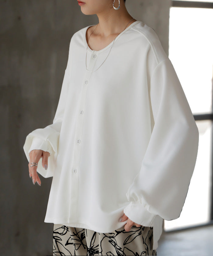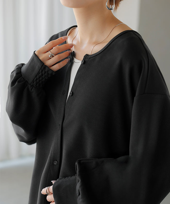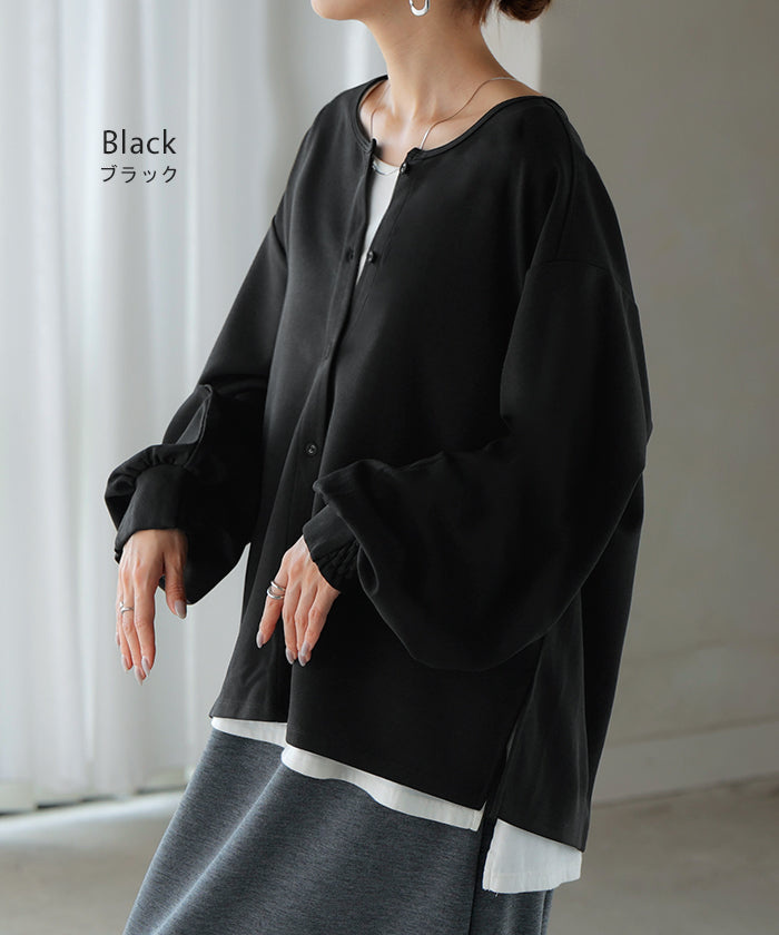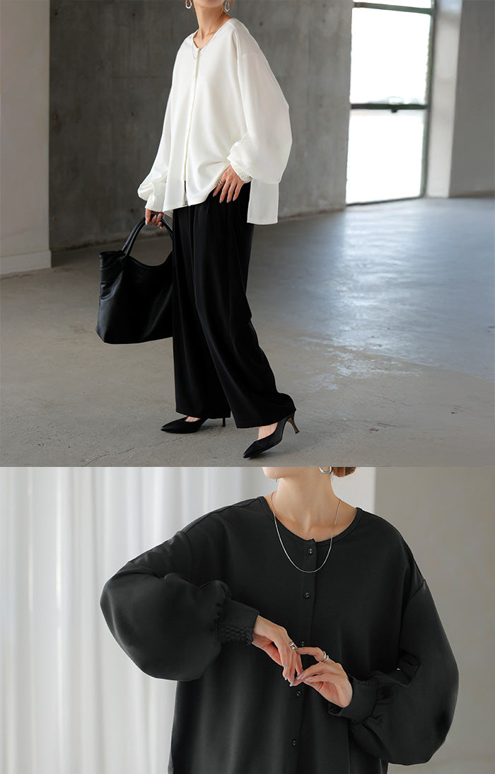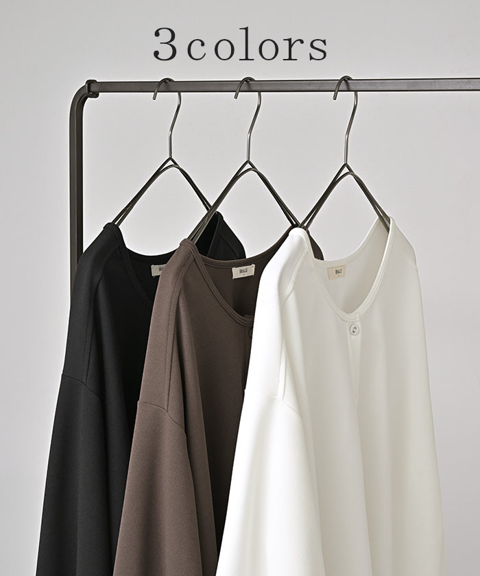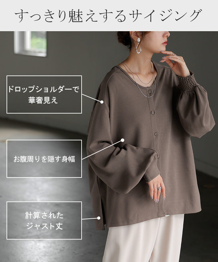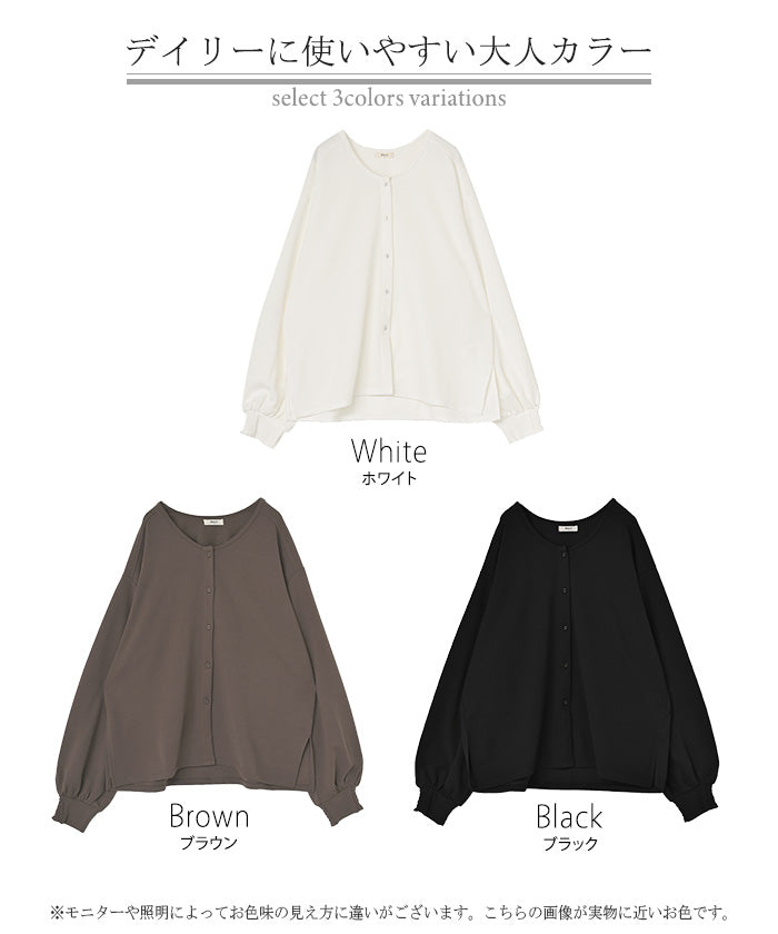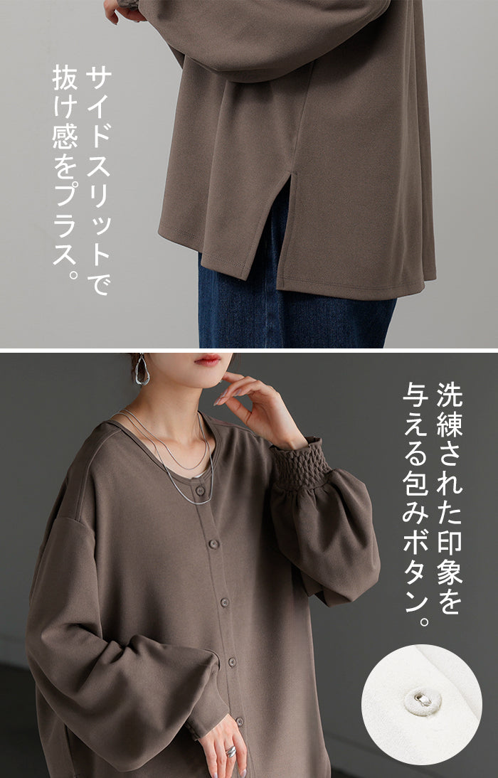 2025AW新作 ブラウス ノーカラー トップス レディース ロング バンドカラー シャツ クルーネック チュニック 長袖 無地 ボリュームスリーブ ストレッチ シワになりにくい きれいめ ゆったり オフィスカジュアル 大きいサイズ 体型カバー お尻が隠れる 黒 白 秋 冬 HUG.U