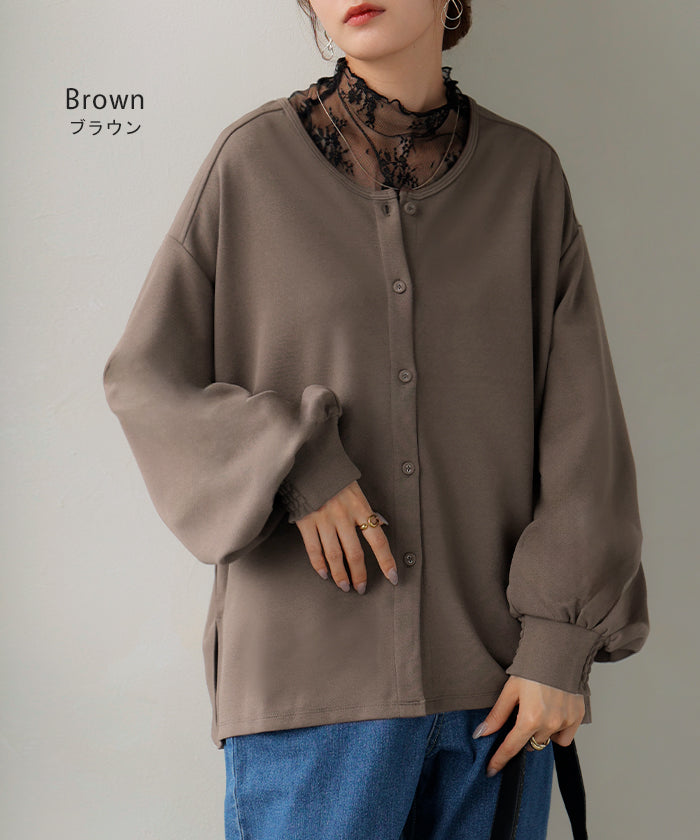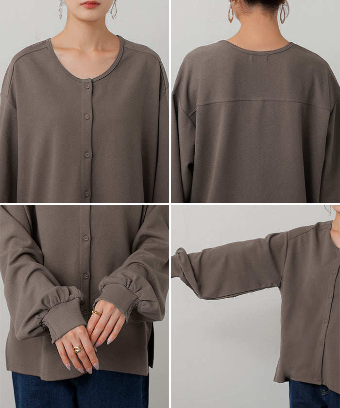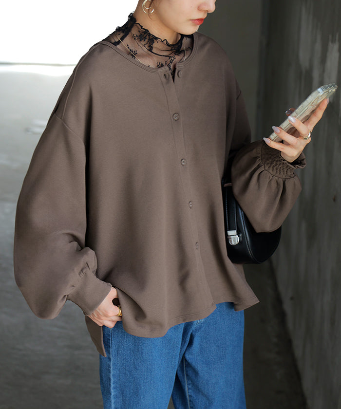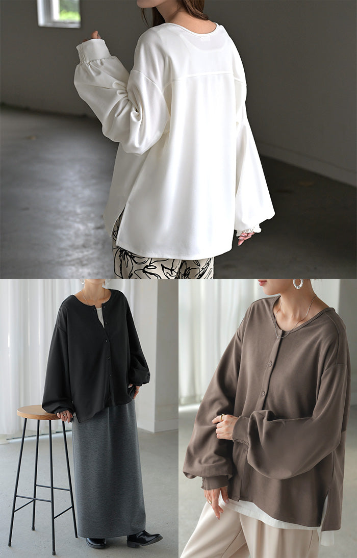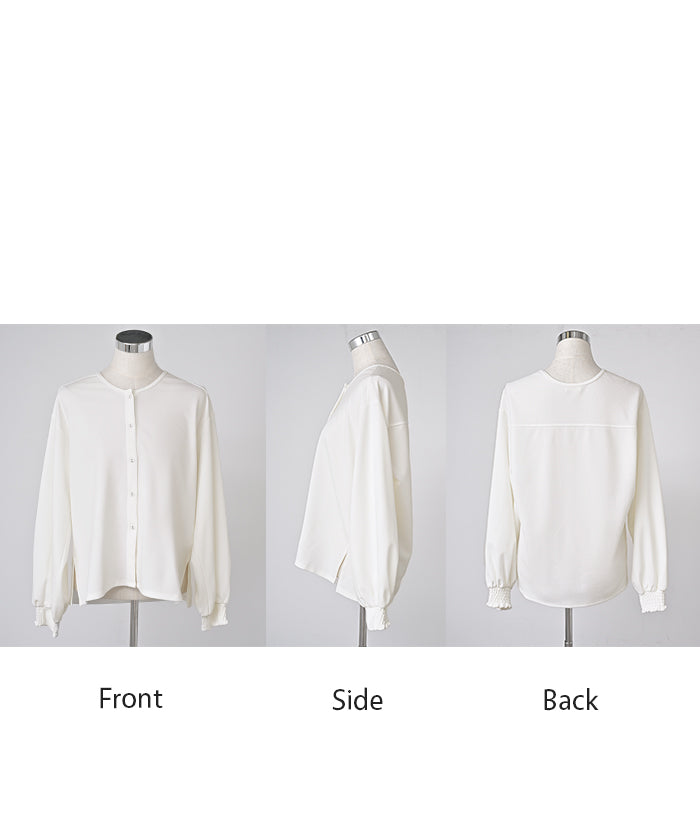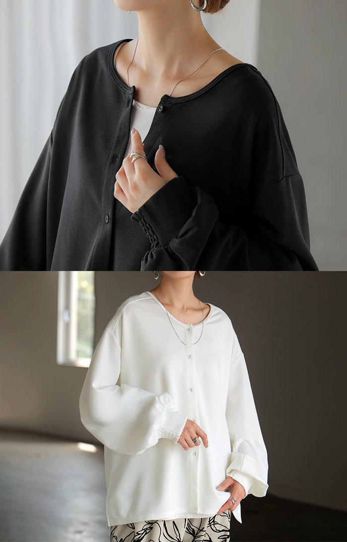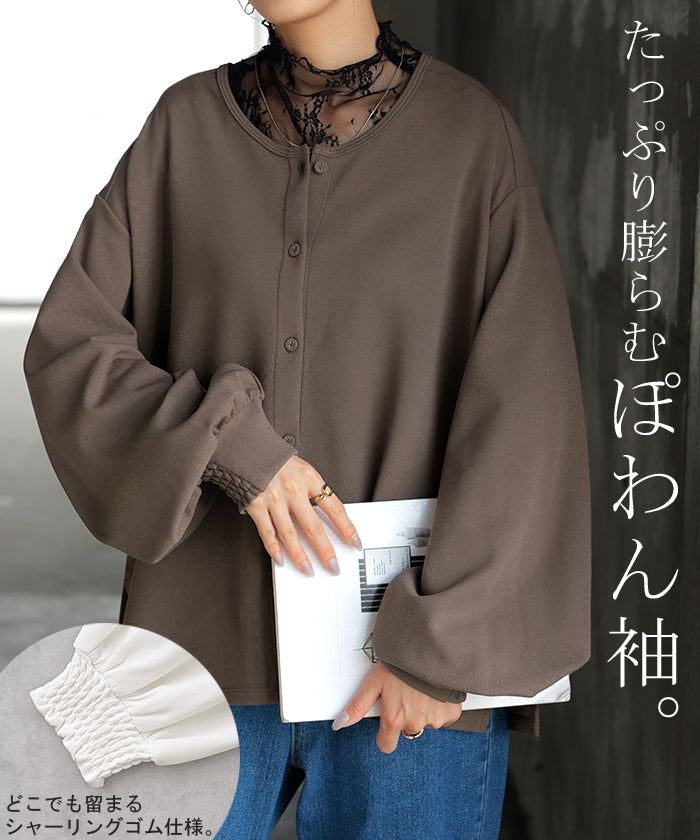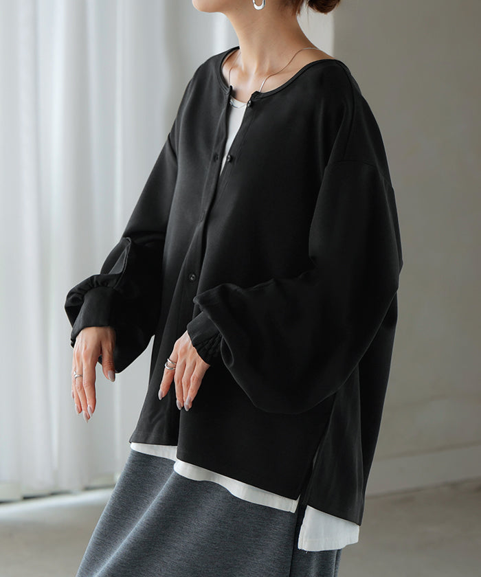 2025AW新作 ブラウス ノーカラー トップス レディース ロング バンドカラー シャツ クルーネック チュニック 長袖 無地 ボリュームスリーブ ストレッチ シワになりにくい きれいめ ゆったり オフィスカジュアル 大きいサイズ 体型カバー お尻が隠れる 黒 白 秋 冬 HUG.U