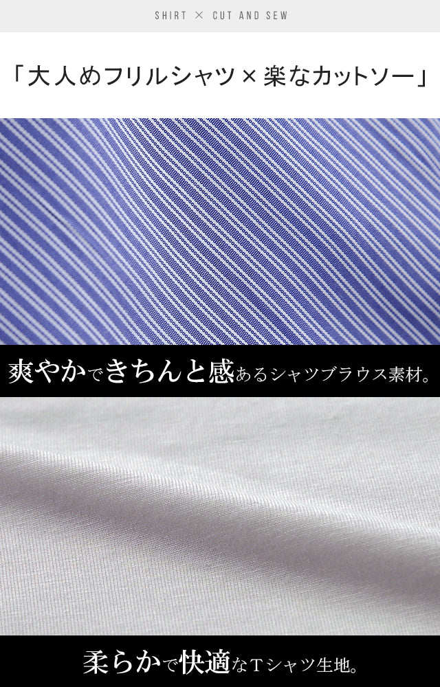レイヤードとして見える部分はポリウレタンにより動きやすさを持たせた綿素材を使用しております。さらに素材にポリエステルも混紡することにより、皺にも比較的に強く、きちんと見えし易いです。インナー素材にあたる部分は、サラリとしたポリエステルのカットソーを使用しております。