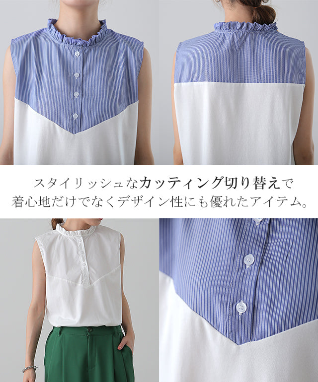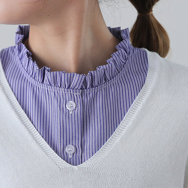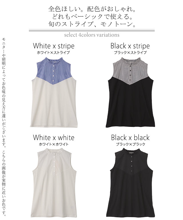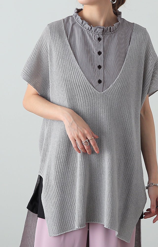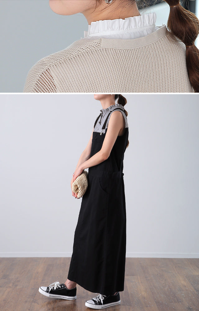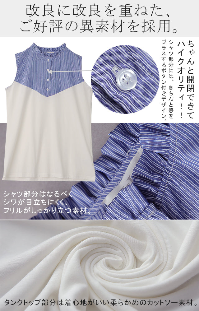 付け襟よりも便利なプチ襟をブラウスドッキングタンクトップです。付け襟だと使う場面をえらんでしまう事がある点をドッキングタンクトップにすることでさらに汎用性を高めた商品になります。インナー部分は下半身のレイヤードでも楽しめるように長めに設定し、お手軽にアクセントを与えることができるため、コーディネートに幅を持たせることができます。