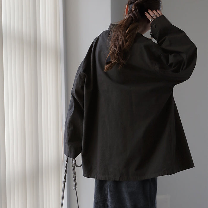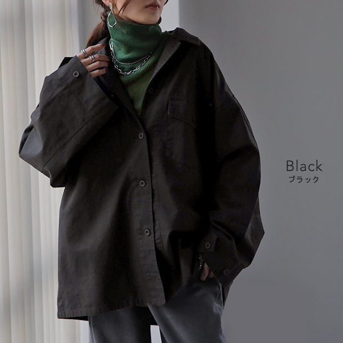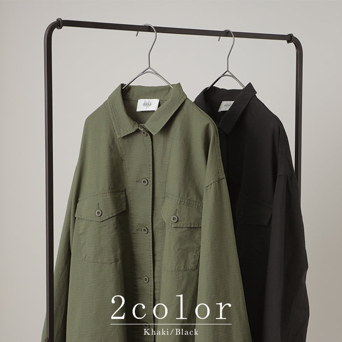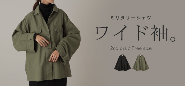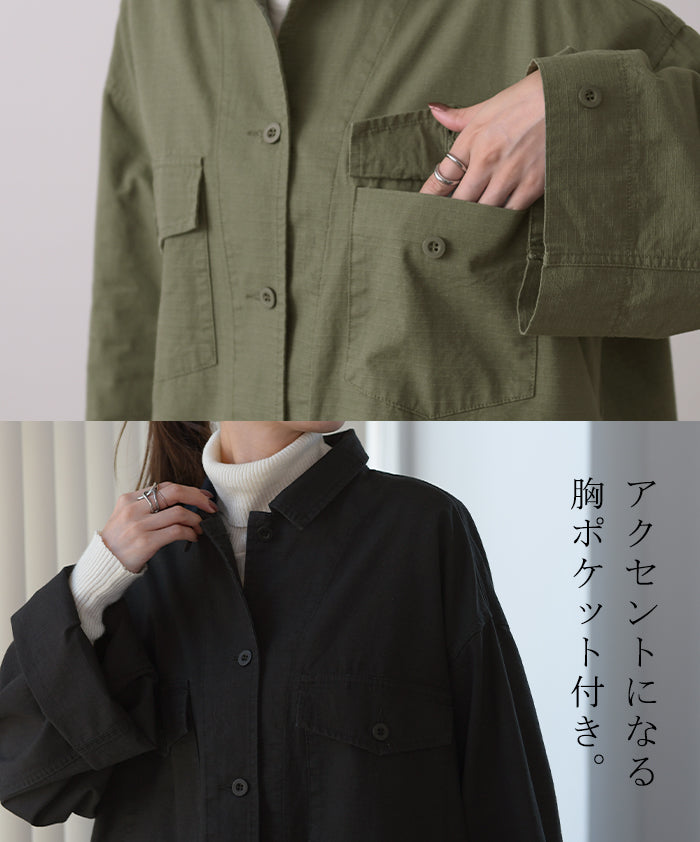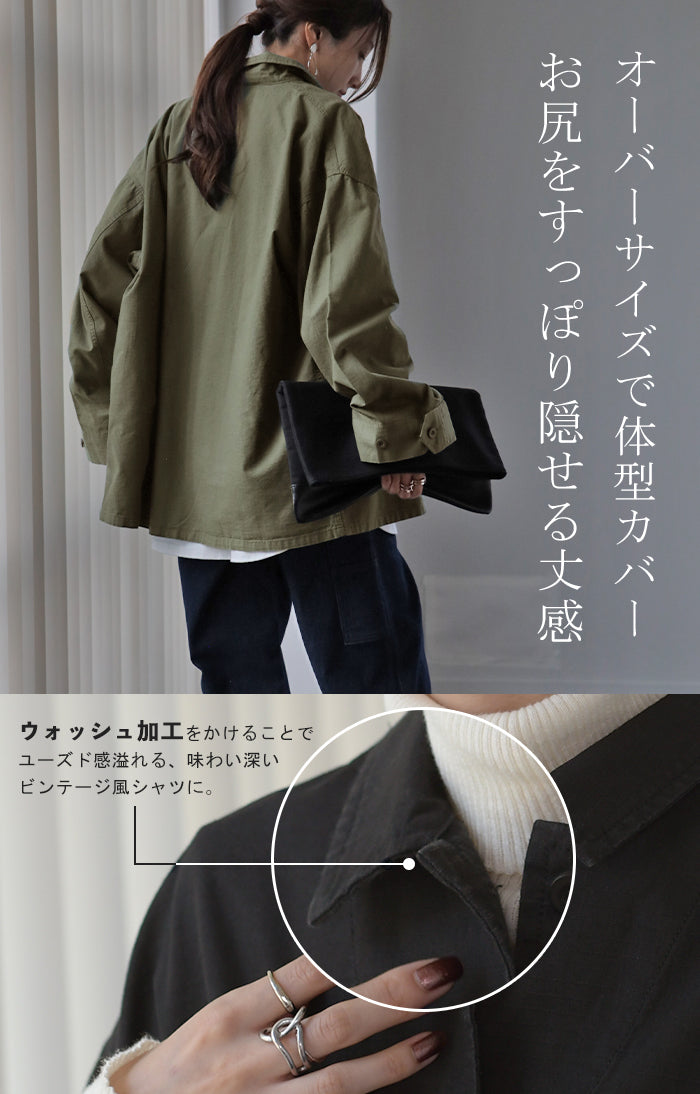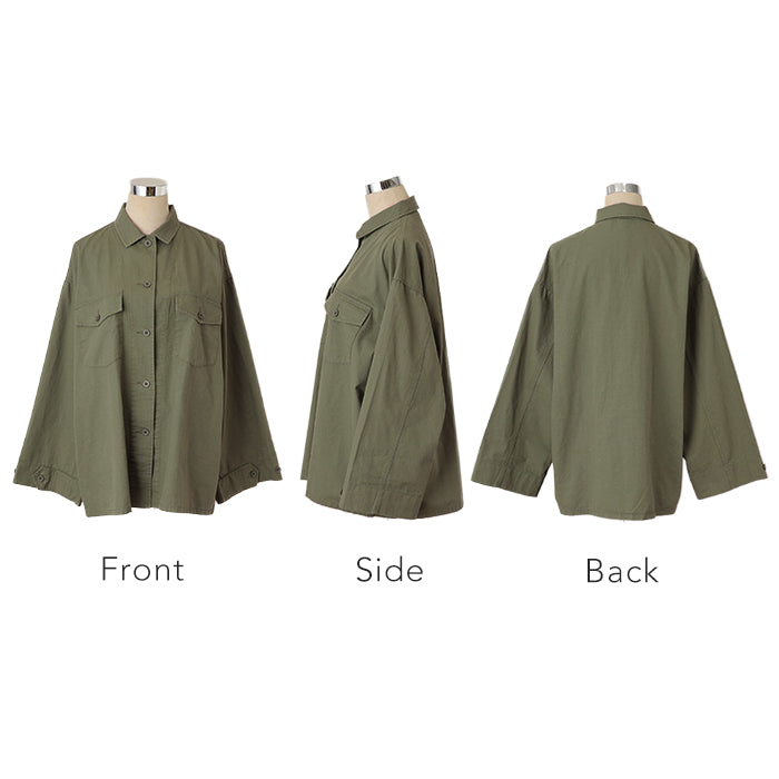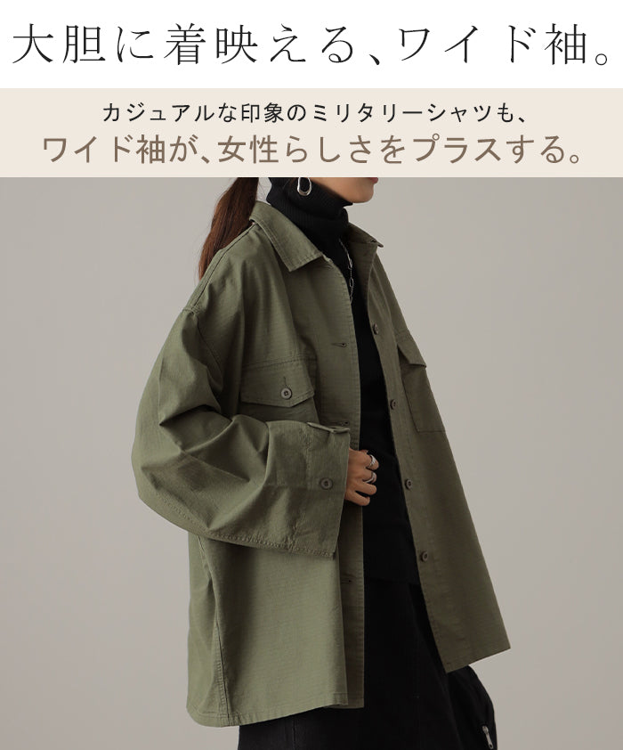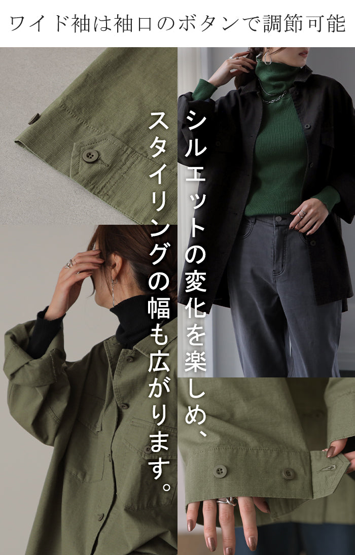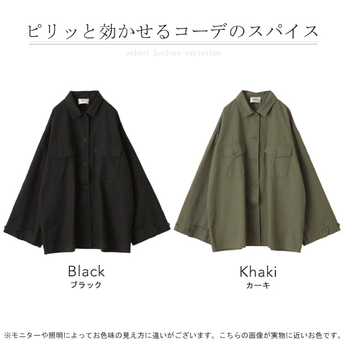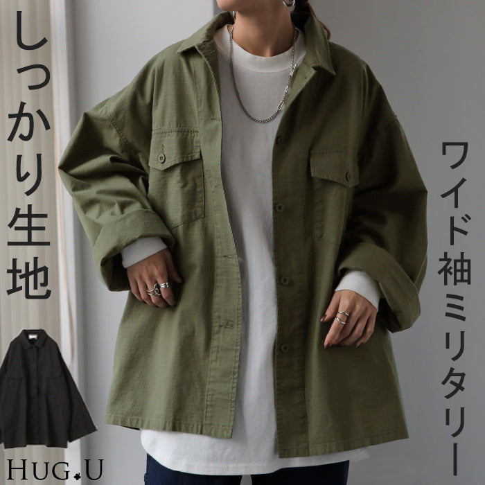 甘辛 『 ワイド袖 。』 ミリタリー トップス レディース ミリタリーシャツ アウター コットン100 綿 羽織 長袖 厚手 ロングシャツ チュニック ビッグサイズ ライトアウター CPOジャケット 大きいサイズ カーキ 緑 黒 春 夏 HUG.U メール便