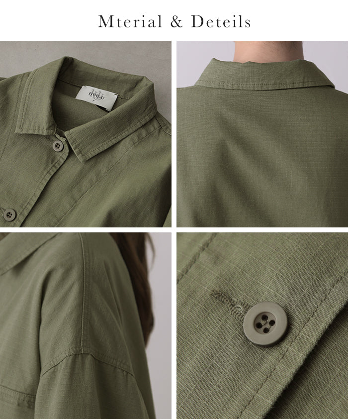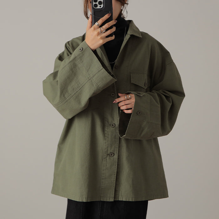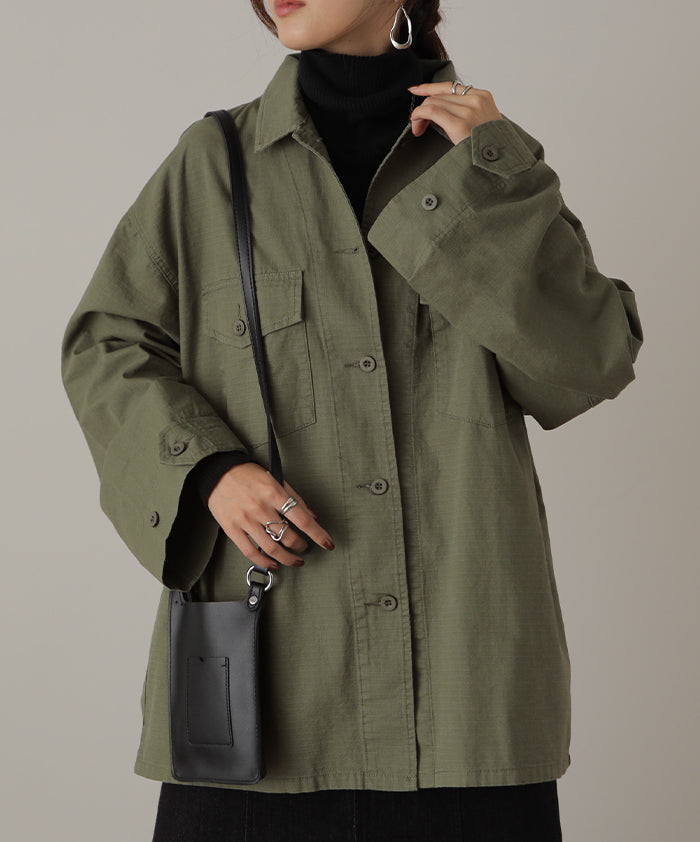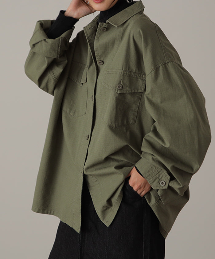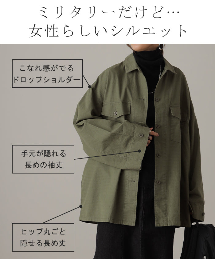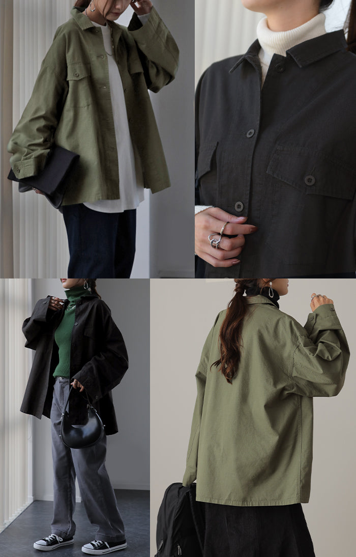 メンズライクなミリタリーデザインのシャツジャケットです。シャツとしてはもちろん、軽いシャツジャケットとしても重宝する1枚。前開きでレイヤードしたり、女性らしいボトムスと合わせたミックスコーデがオススメ◎