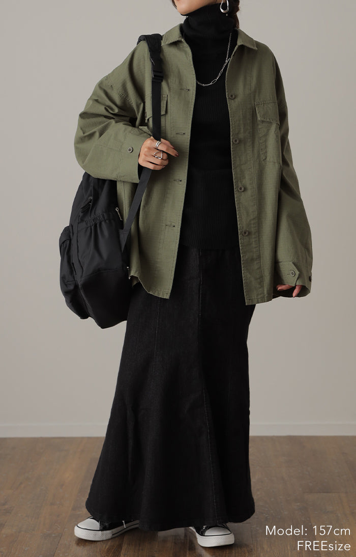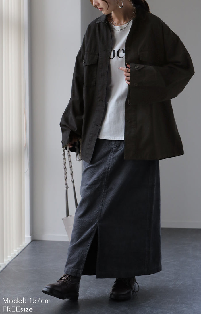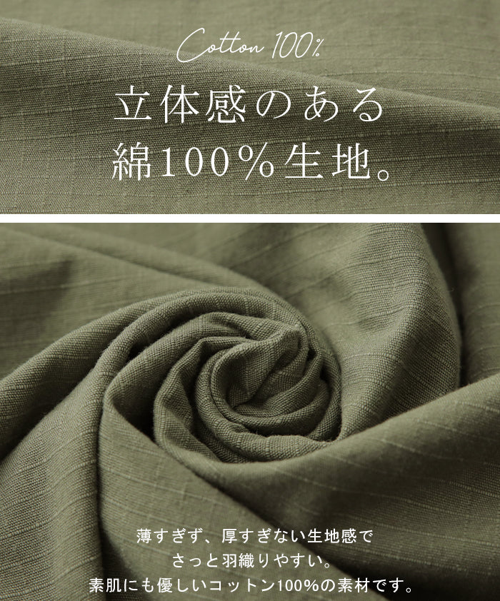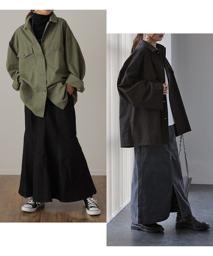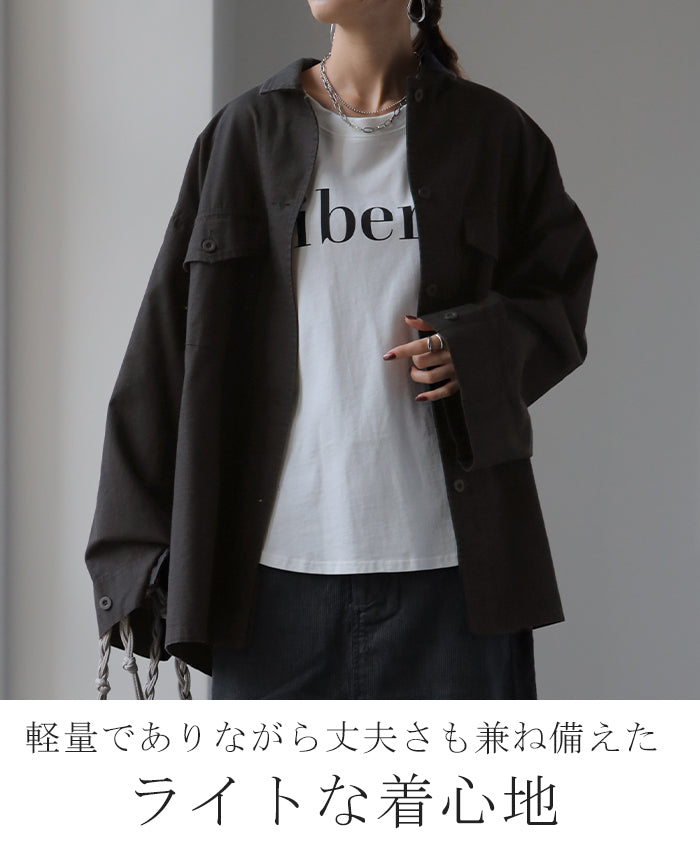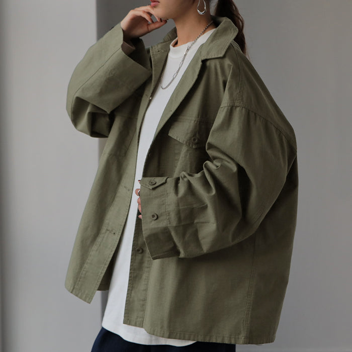 メンズライクなミリタリーデザインのシャツジャケットです。シャツとしてはもちろん、軽いシャツジャケットとしても重宝する1枚。前開きでレイヤードしたり、女性らしいボトムスと合わせたミックスコーデがオススメ◎