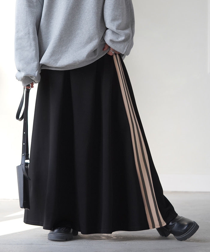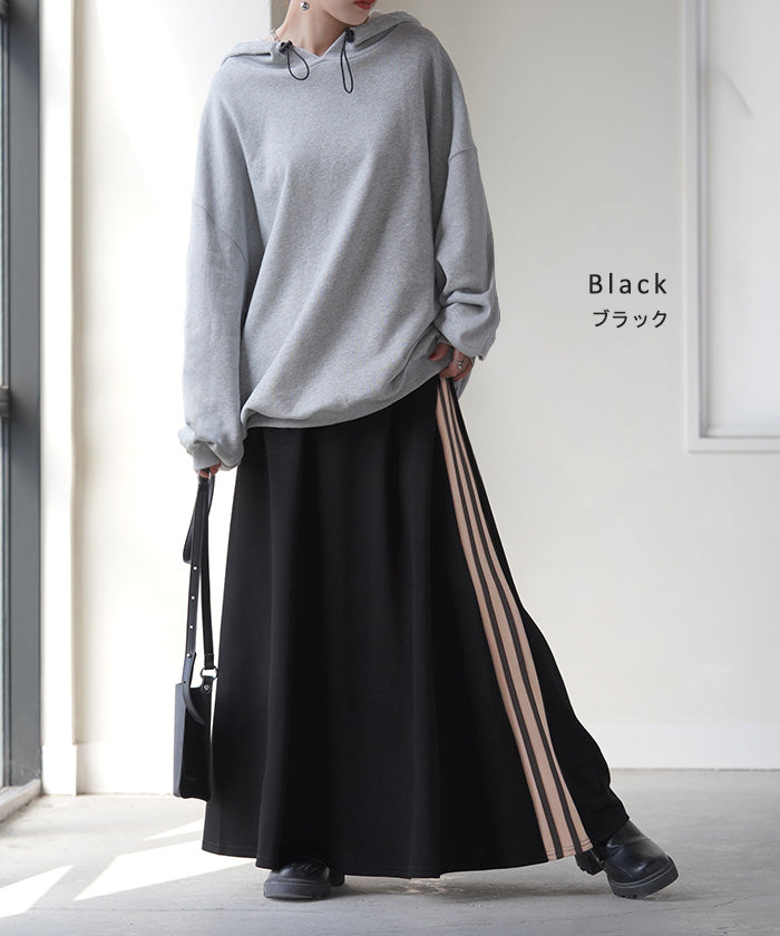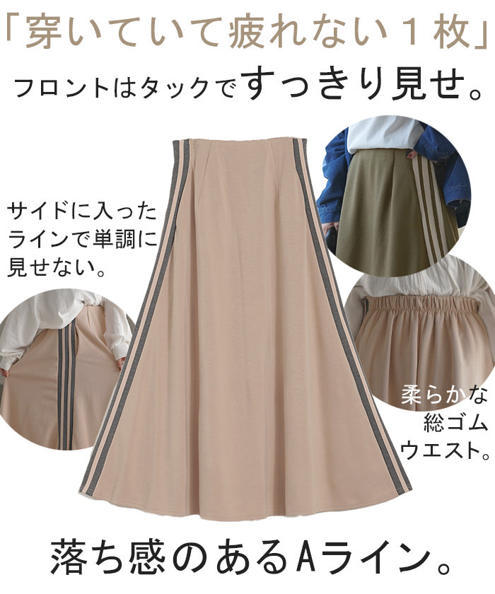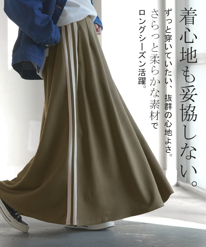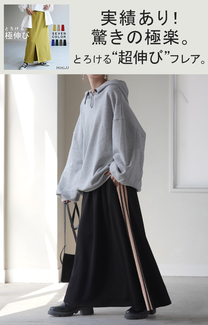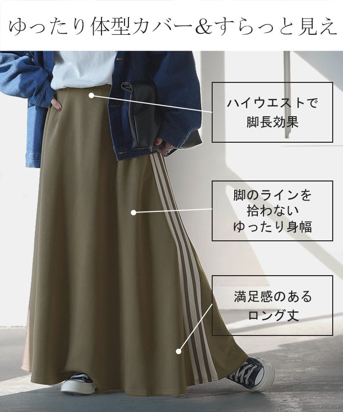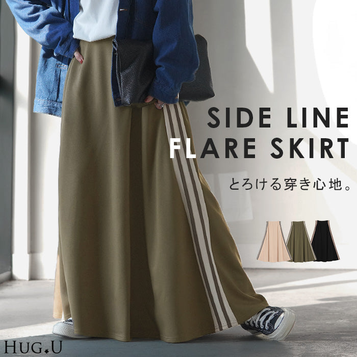 スカート 超伸び フレア レディース ボトムス ライン スポーティー ポンチスカート ロング ロングスカート マキシ ジャージー Aライン フレアスカート ストレッチ ラインスカート ゴム ゆったり 体型カバー 大きいサイズ 配色 黒 カーキ 春 夏 HUG.U