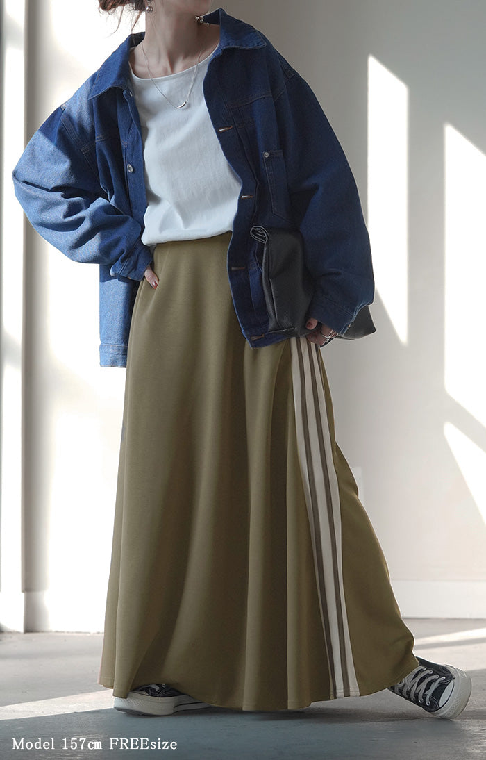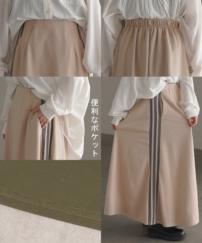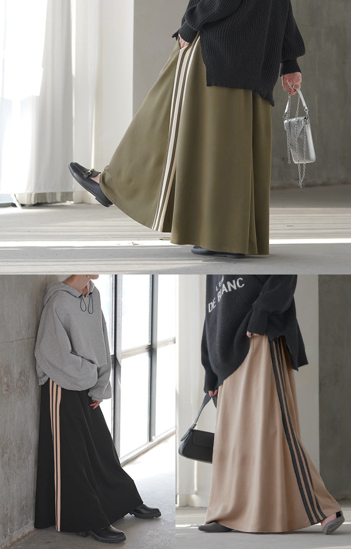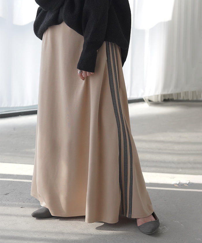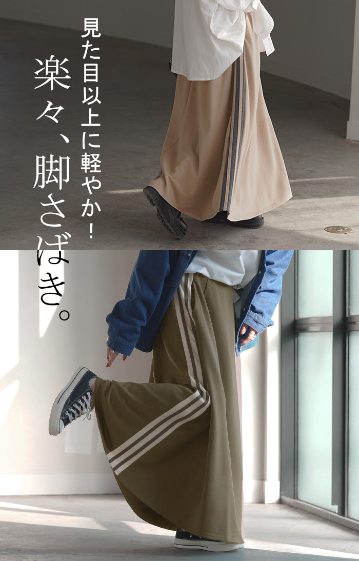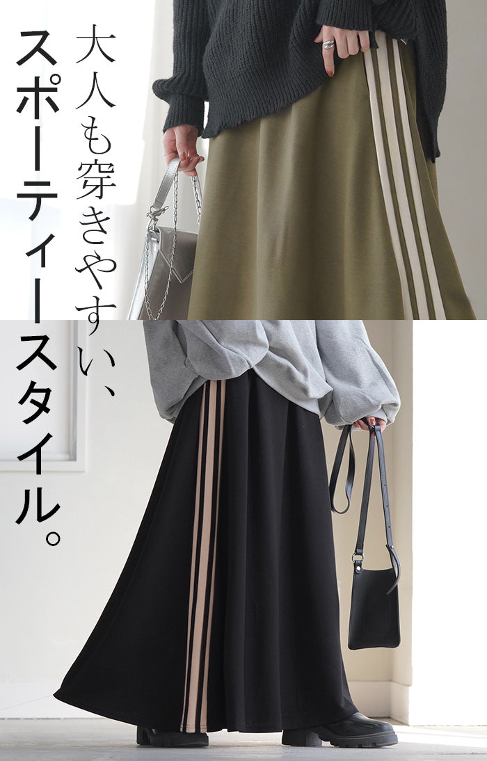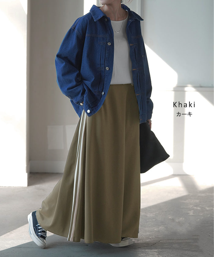 スカート 超伸び フレア レディース ボトムス ライン スポーティー ポンチスカート ロング ロングスカート マキシ ジャージー Aライン フレアスカート ストレッチ ラインスカート ゴム ゆったり 体型カバー 大きいサイズ 配色 黒 カーキ 春 夏 HUG.U