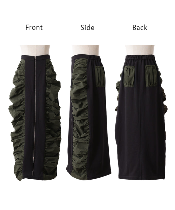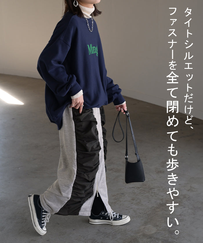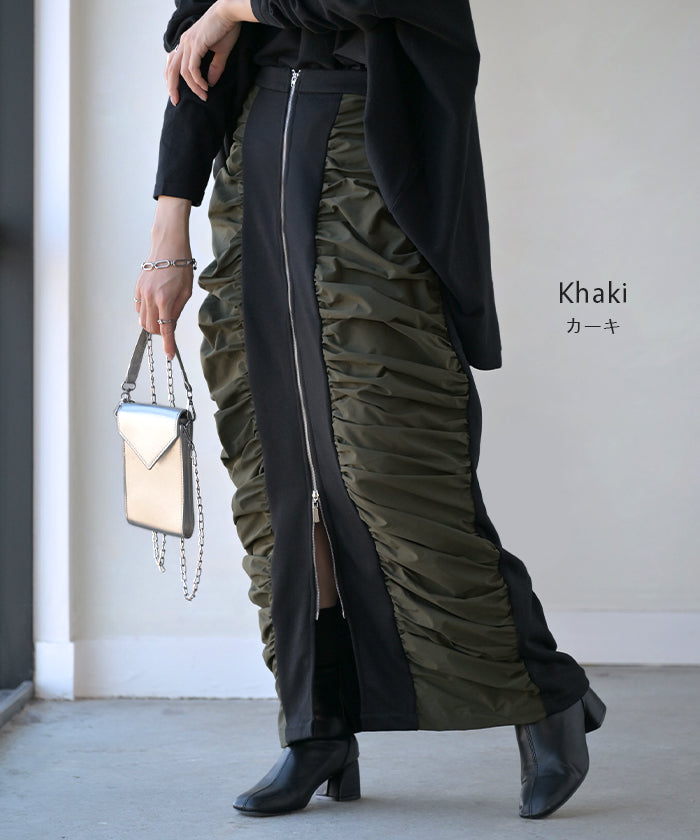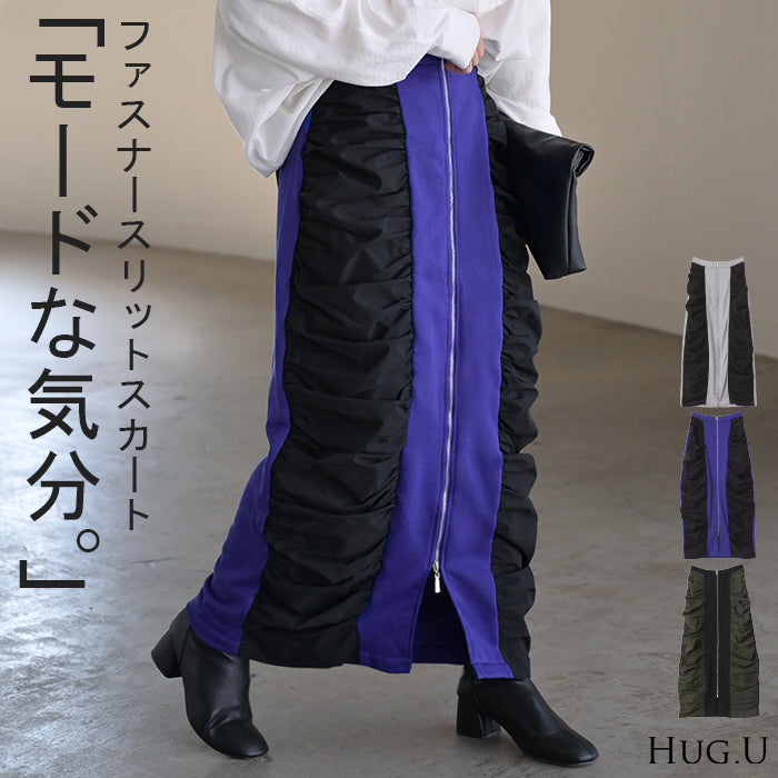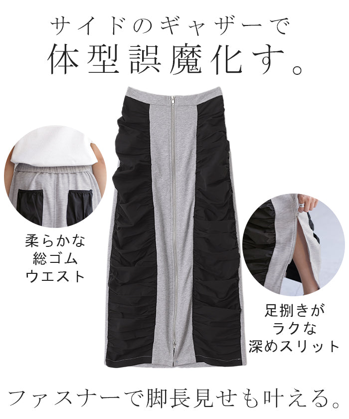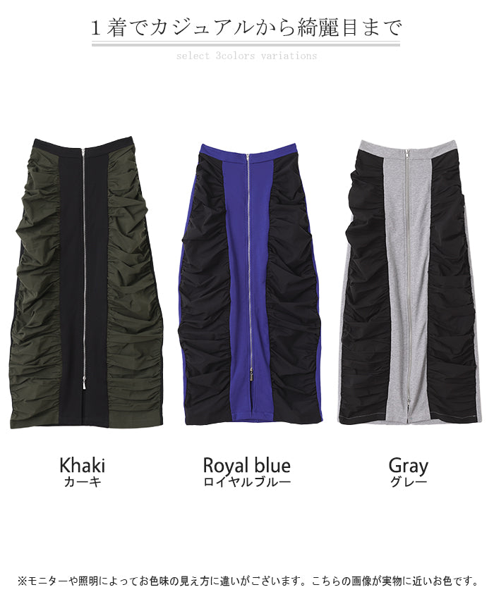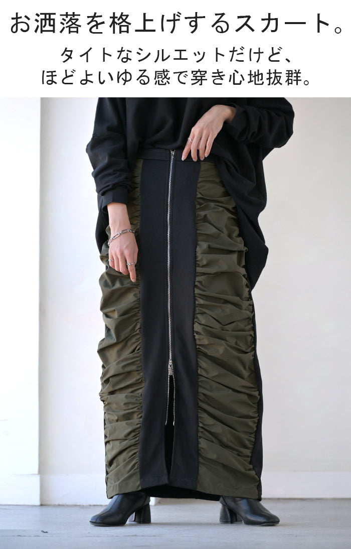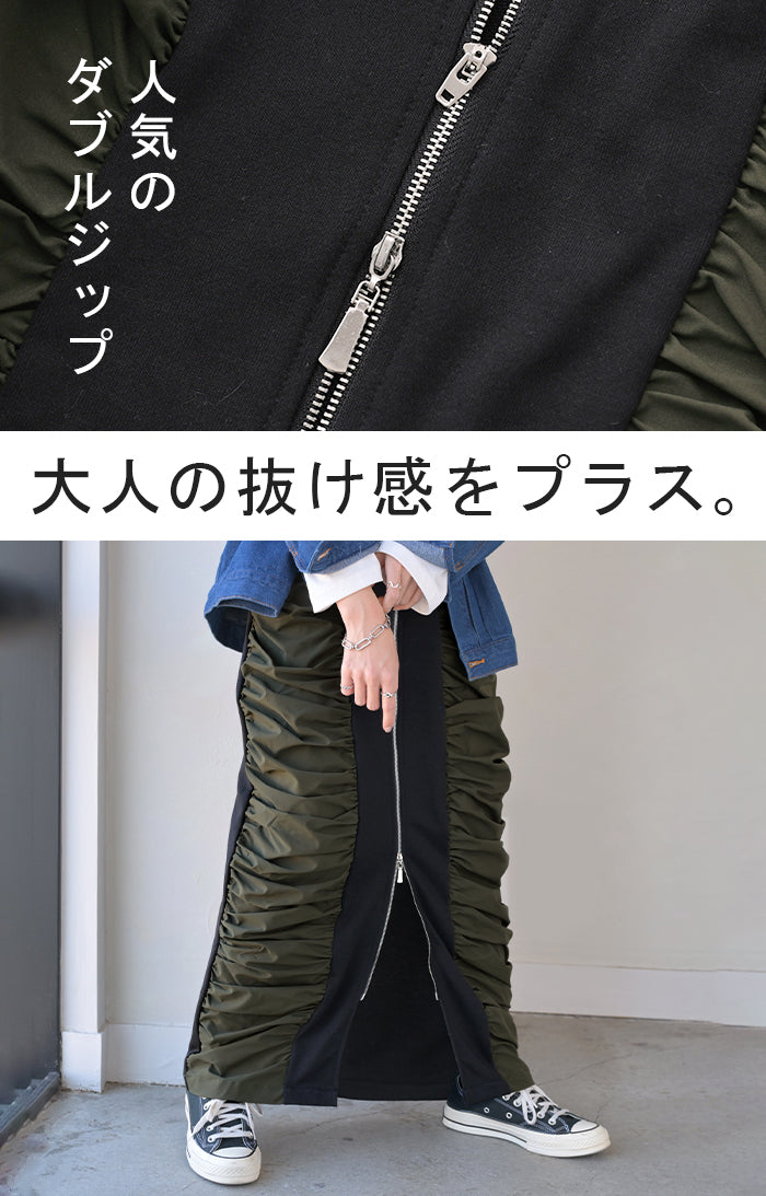 スカート サイド ギャザー タイトスカート レディース ボトムス 変形 ロングスカート マキシスカート スウェット 変形スカート ダブルジップ ストレート ペンシルスカート スリット ストレッチ ロング タイト ナロースカート ゴム カーキ 春 夏 HUG.U