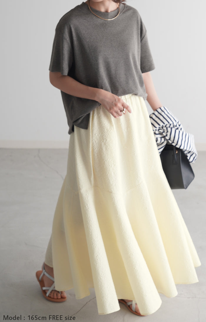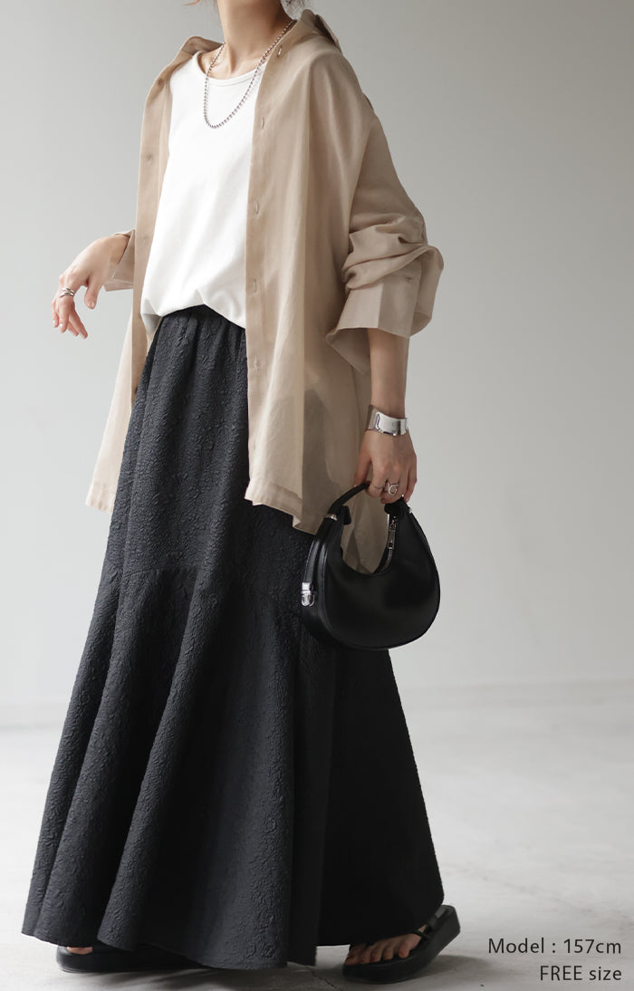 軽やかでありながらも豊かな表情を見せるジャガード生地を使用しています。生地は薄手でありながら、凹凸のあるマットな質感が高級感を演出し、スタイリッシュな印象を与えます。また、しわになりにくい特性は、忙しい日々の中でも常に美しいスタイルを保つことを可能にします。ホワイトバージョンには透け感があるため、ペチコートの使用を推奨します。