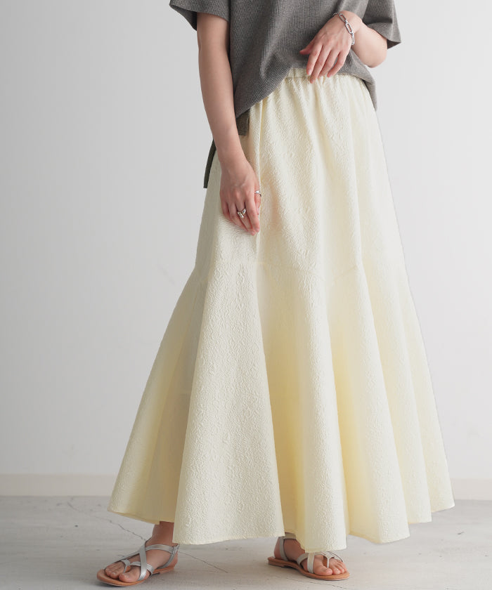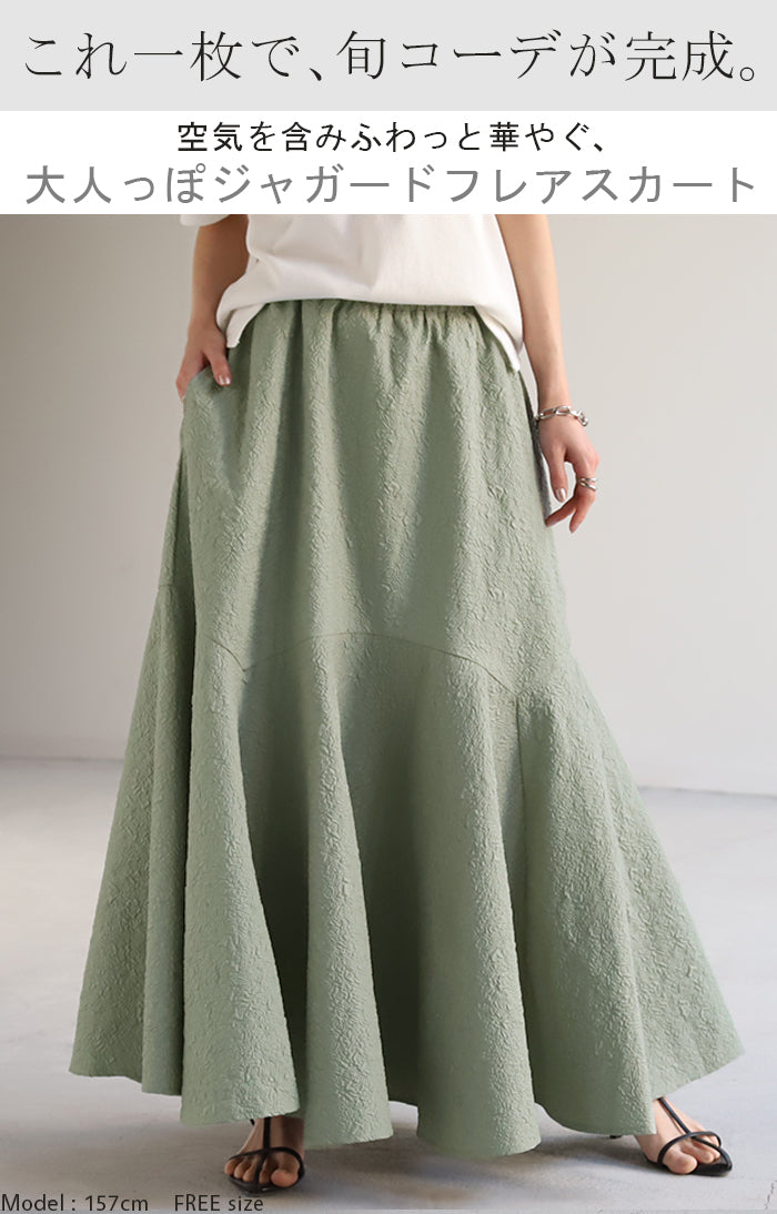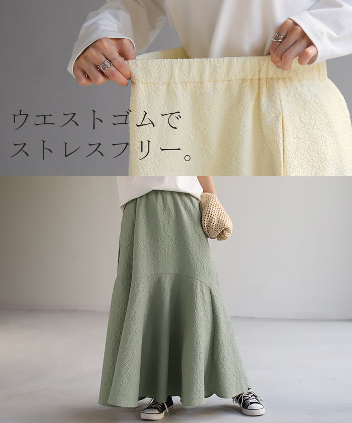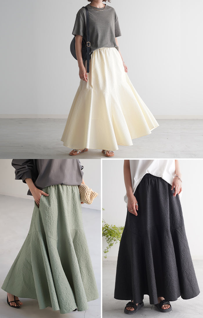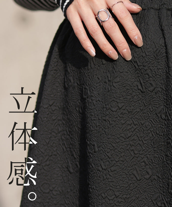 表情豊かな立体的な切り替えが特徴で、どんなコーディネートにも甘さと洗練さをプラスします。体のラインを拾わないシルエットは、体型を美しくカバーし、自信を持って着用できます。オールシーズン活躍するこのスカートは、肌寒い季節にはタイツと合わせてもスタイリッシュ。日常から特別な日まで、あらゆるシーンで活躍するマルチタレントアイテムです。このスカート一枚で、旬なスタイルが完成し、日々のコーディネートを楽しく、そしてエレガントに彩ります。