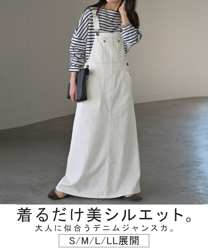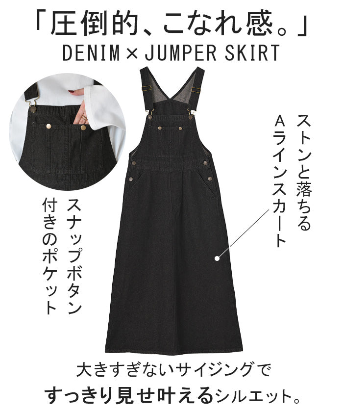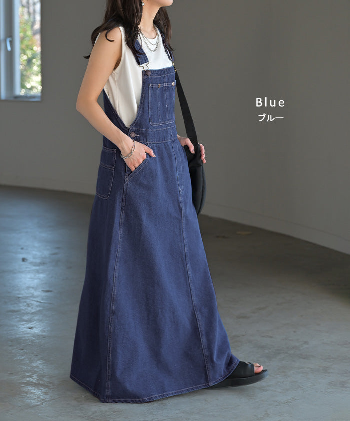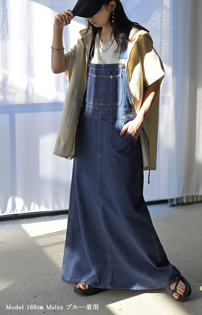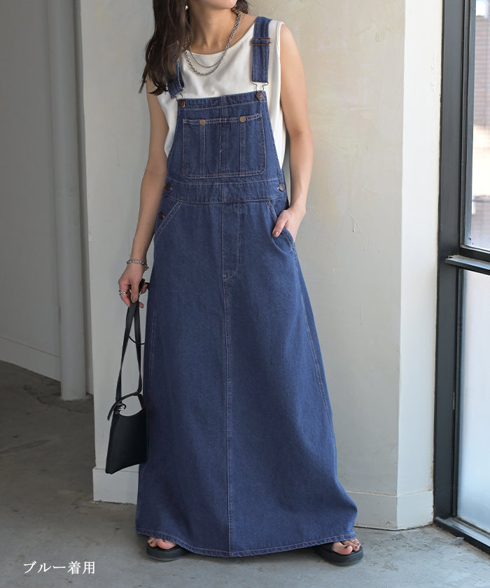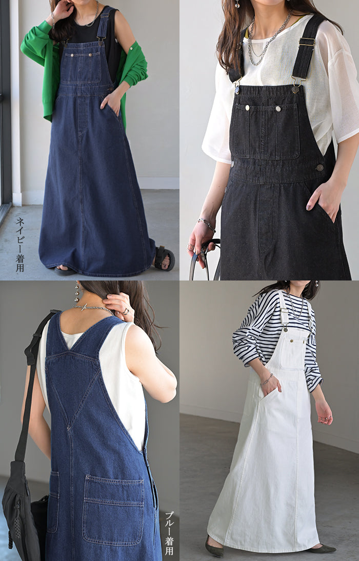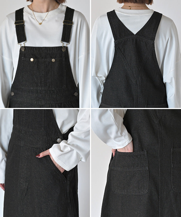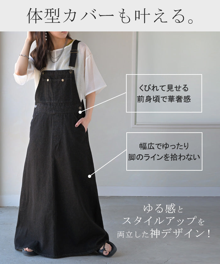 サロペット デニム スカート ワンピース レディース ジャンパースカート ロング ロングワンピース ノースリーブ オーバー オーバーオール レイヤード 重ね着 調節可能 ゆったり きれいめ オーバーサイズ 大きいサイズ 体型カバー 黒 春 夏 HUG.U