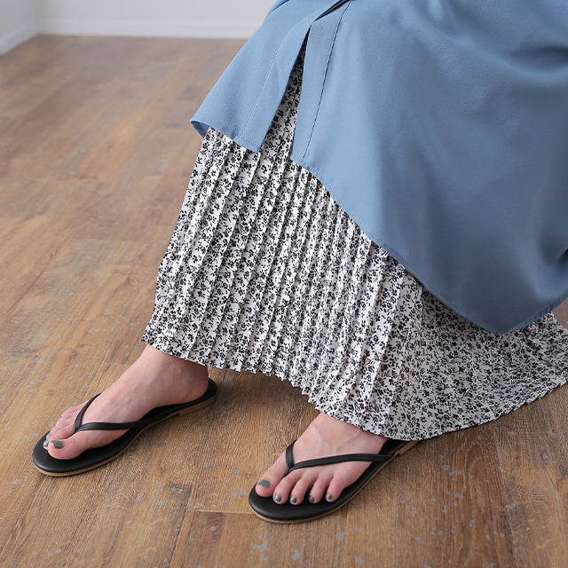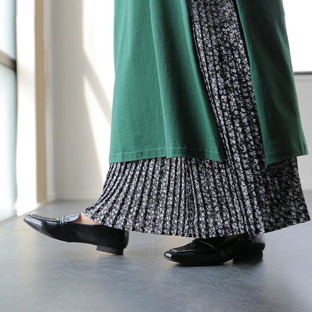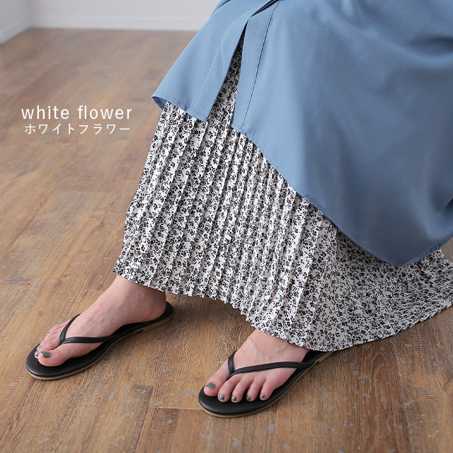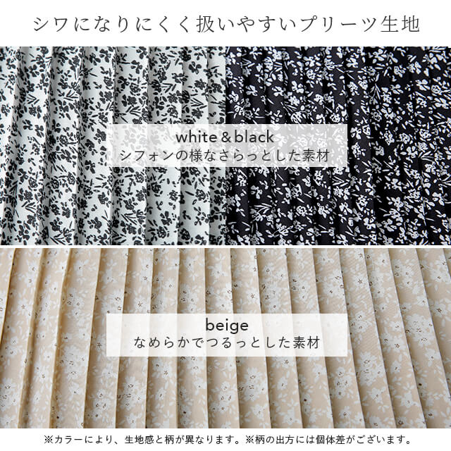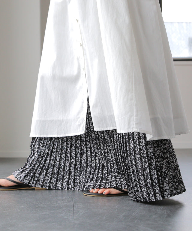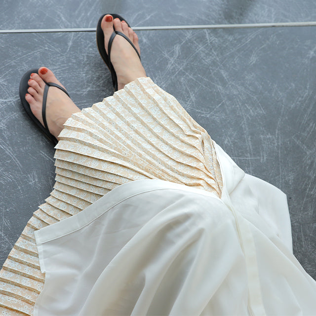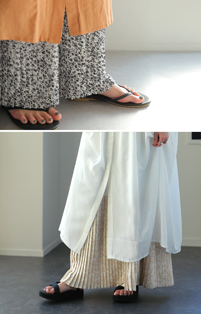 インナー用の花柄プリーツ切替えペチスカートです。裾広がりのデザインなので脚の華奢見せ効果も期待できます。ウエストゴムでお腹周りが楽々、動きやすいデザインになっています。